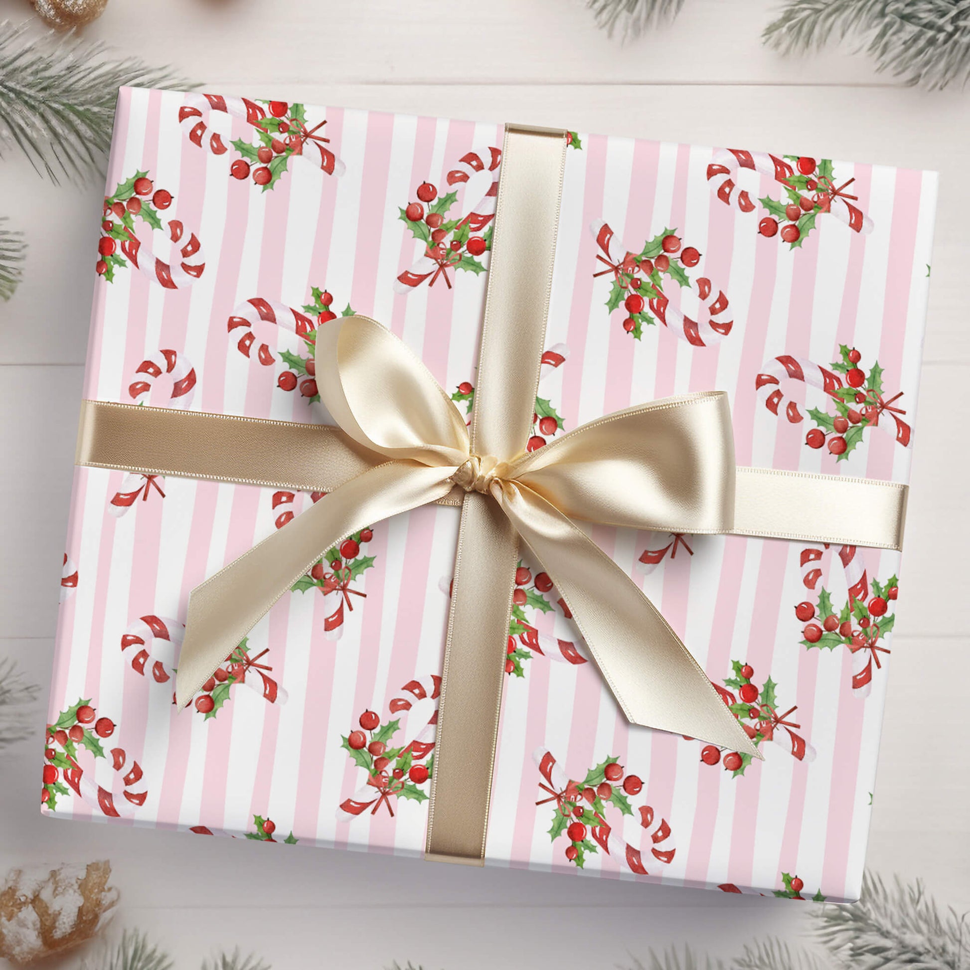 Add a festive and feminine touch to your presents with this candy cane holly gift wrap. Featuring soft pink and white stripes, this design is adorned with holly leaves, red berries, and classic red-and-white candy canes tied with delicate bows. It’s the perfect blend of traditional Christmas charm and modern elegance, making it a standout choice for the holiday season.