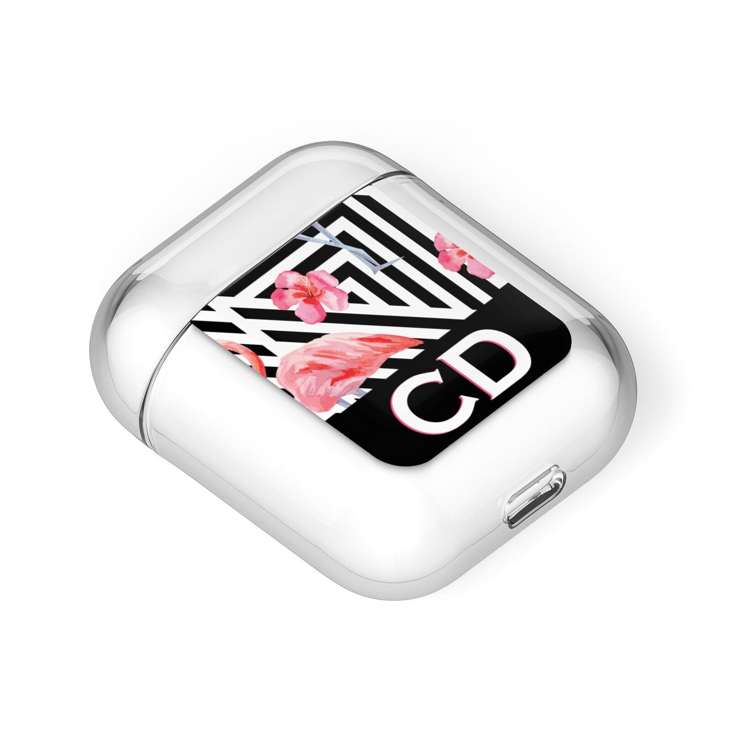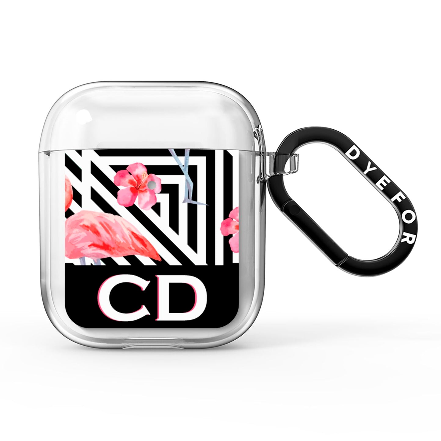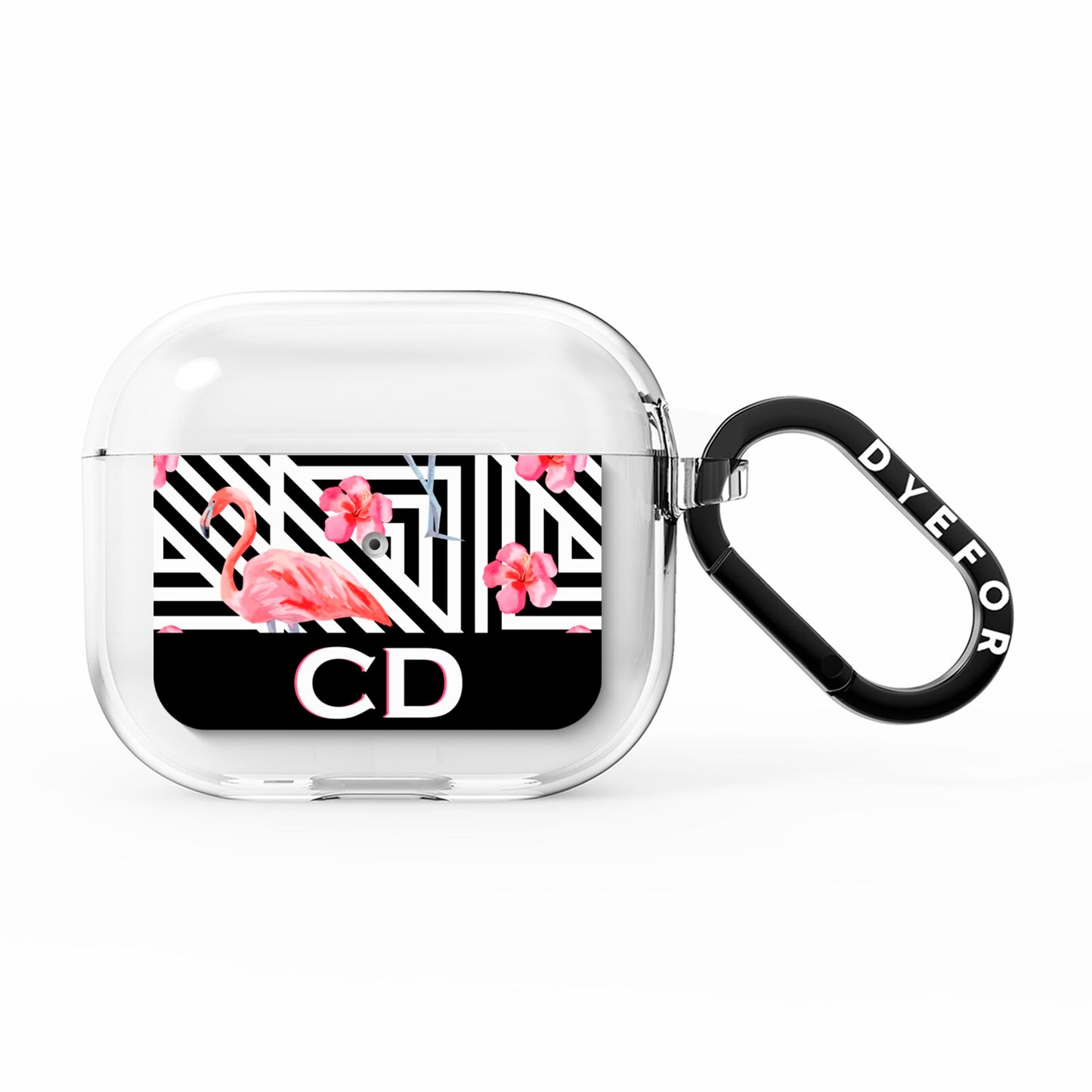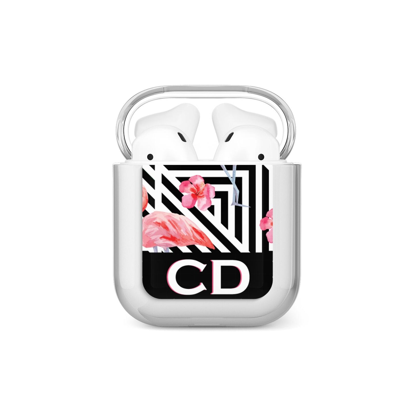 Our Flamingo Black Geometric AirPods Case is a black and white striped design, with pink tropical flowers and elegant looking flamingoes. The design is personalised at the bottom in two prominent white initials, with subtle pink drop shadow.