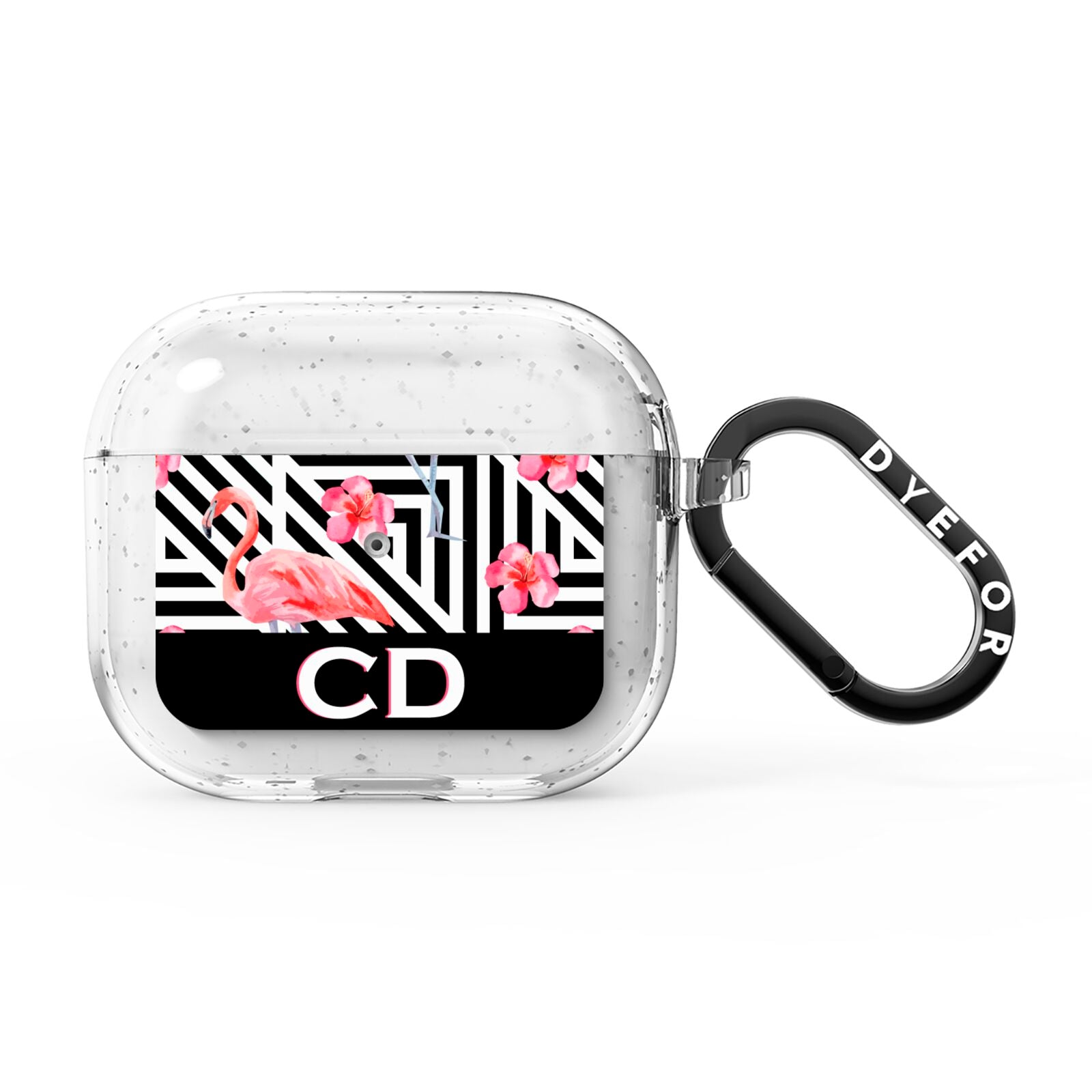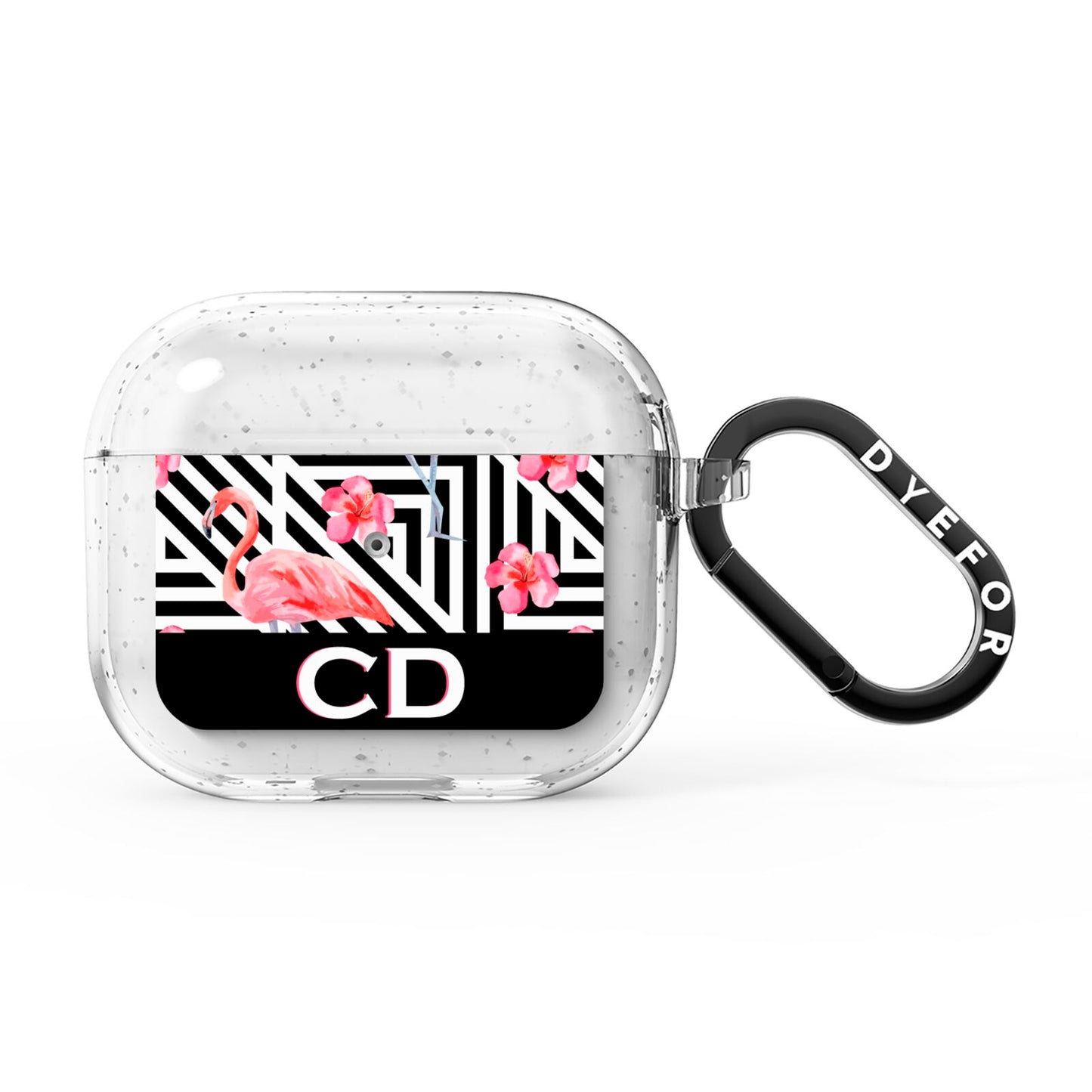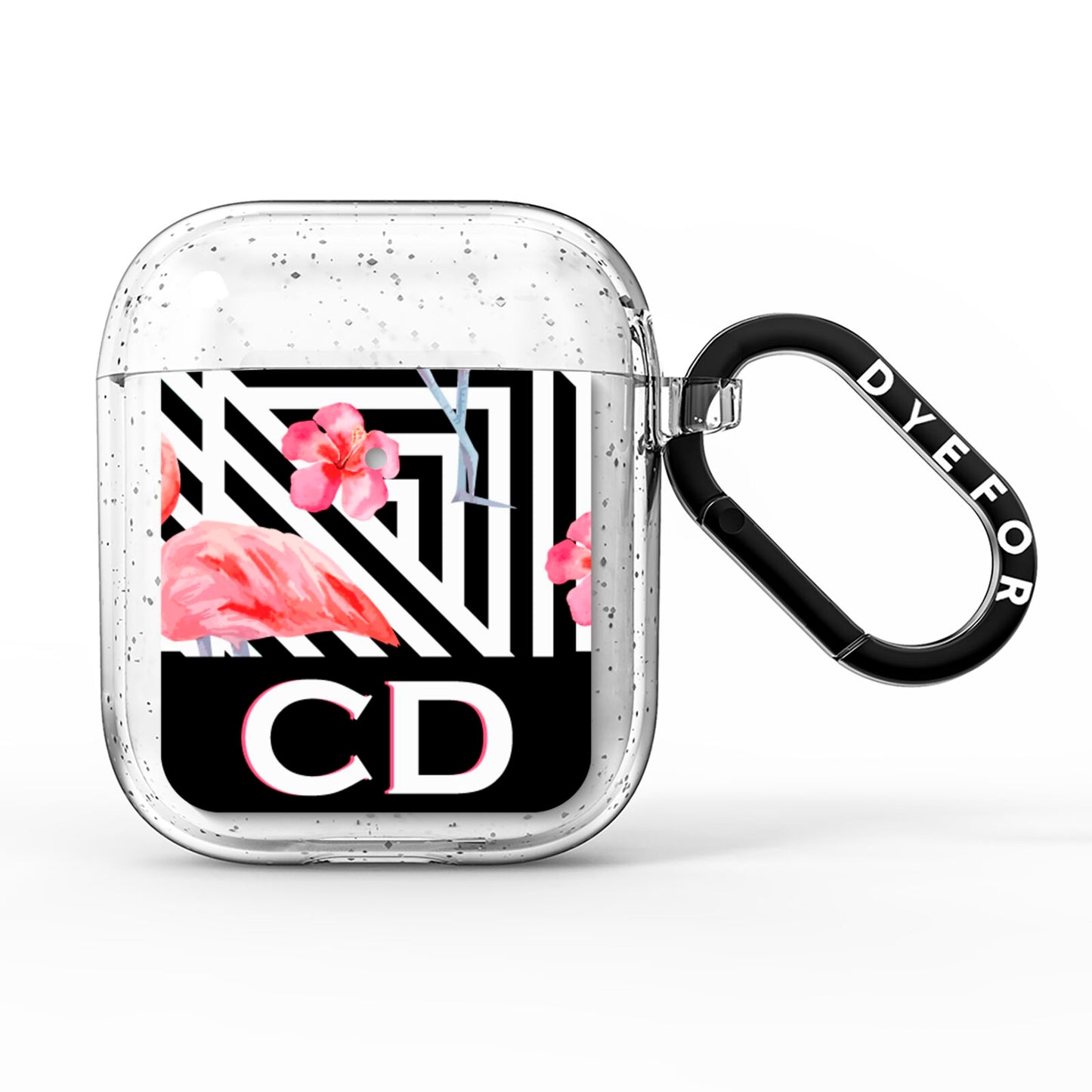 Our Flamingo Black Geometric AirPods Case is a black and white striped design, with pink tropical flowers and elegant looking flamingoes. The design is personalised at the bottom in two prominent white initials, with subtle pink drop shadow.