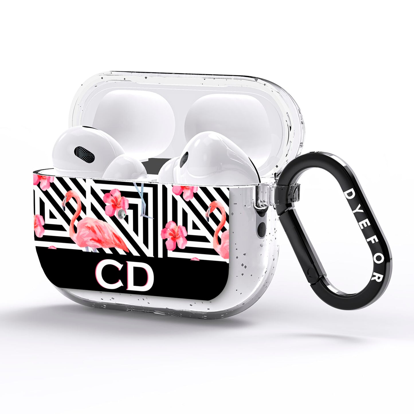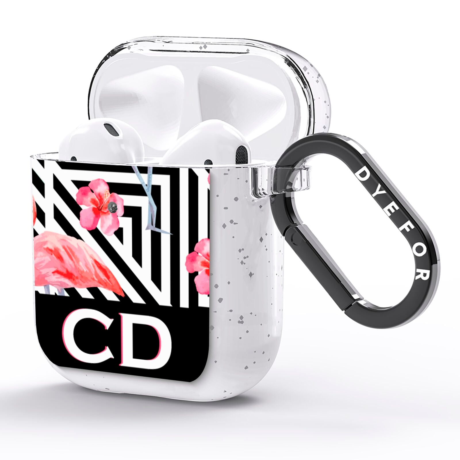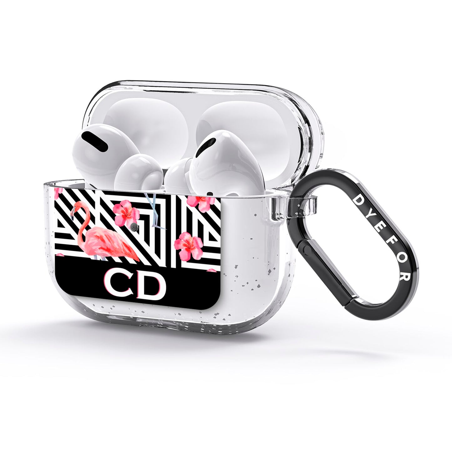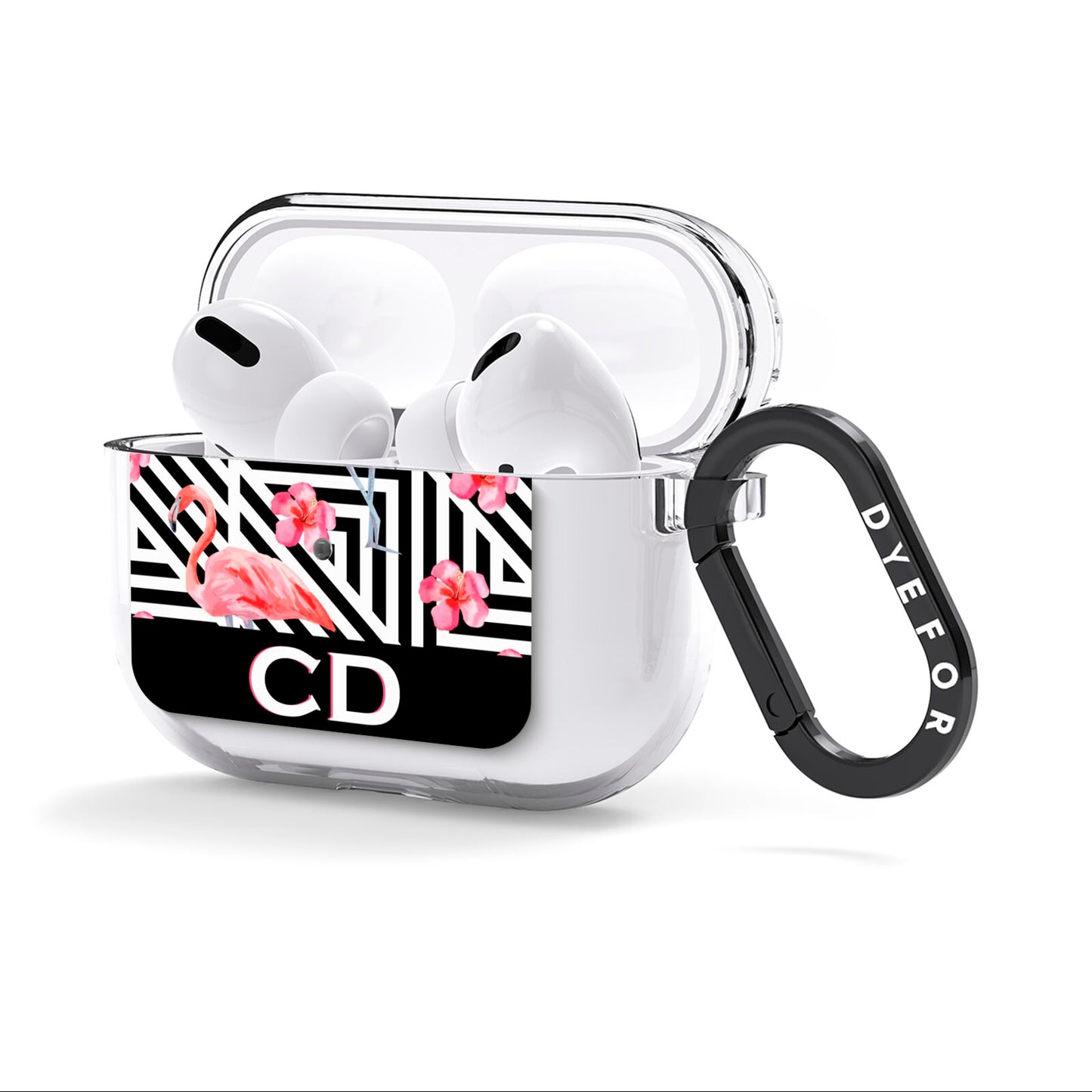 Our Flamingo Black Geometric AirPods Case is a black and white striped design, with pink tropical flowers and elegant looking flamingoes. The design is personalised at the bottom in two prominent white initials, with subtle pink drop shadow.