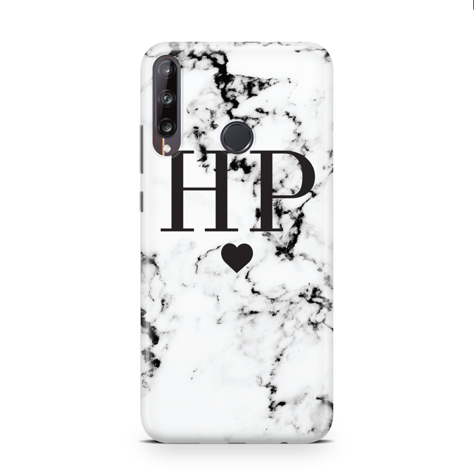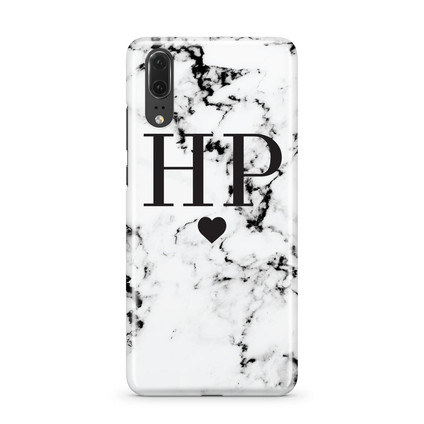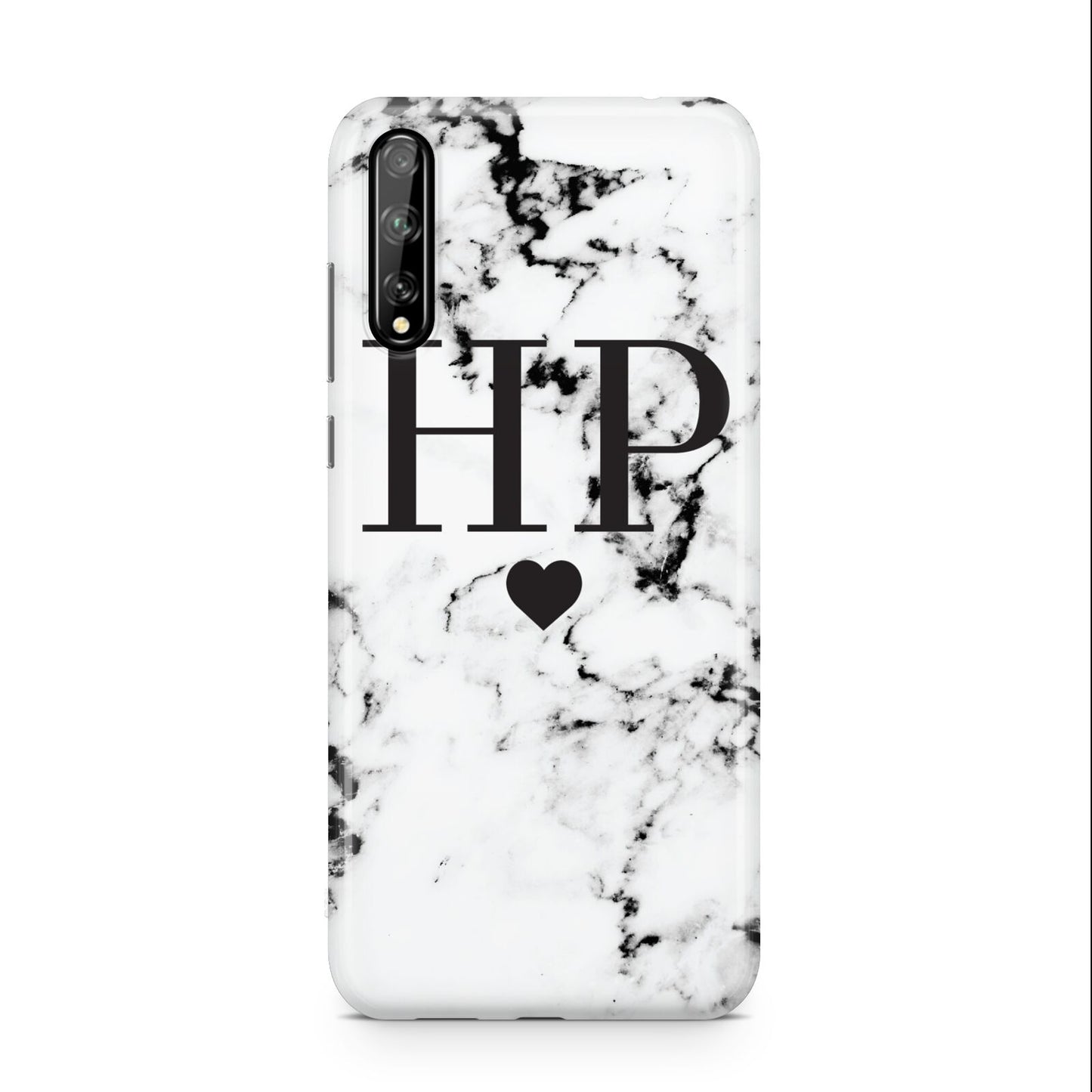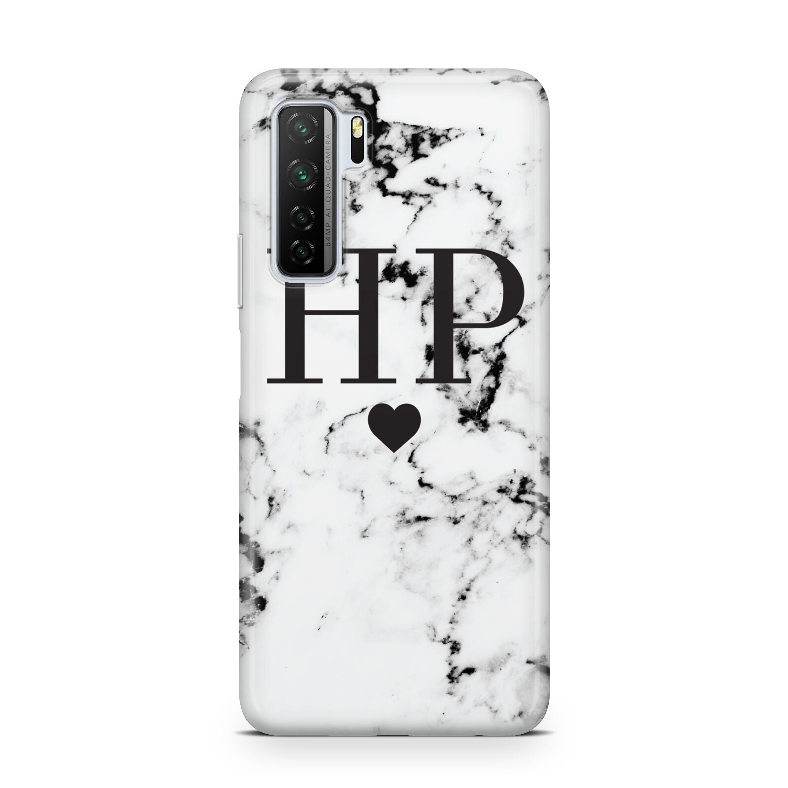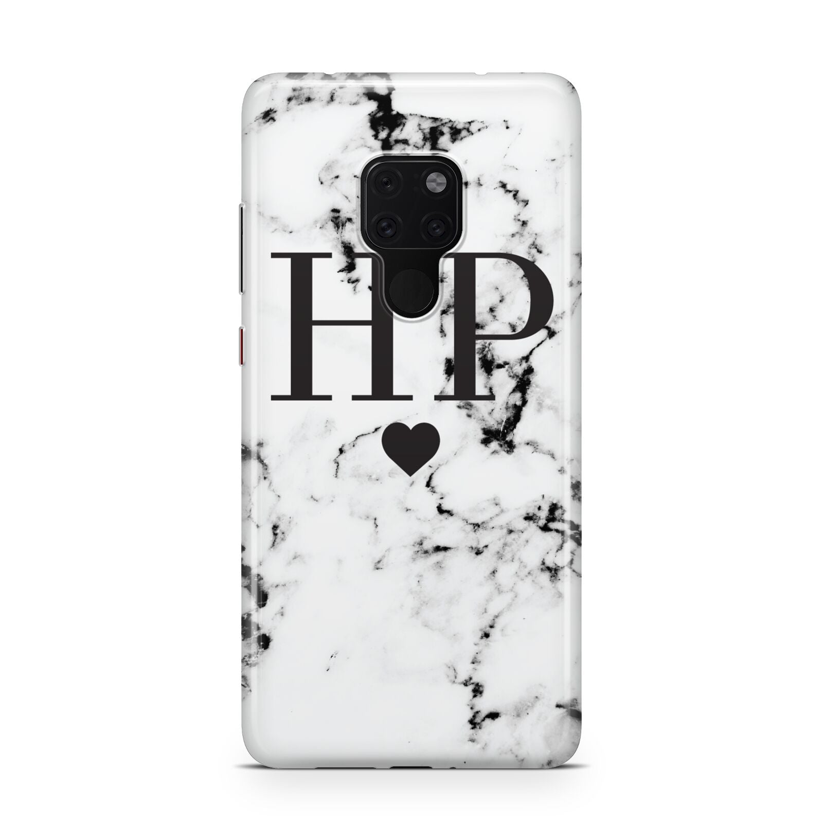 Our Heart Decal Marble Initials Personalised Huawei Case is a white and black veined marble design, with two large black initials and love heart. The large initials sit above the love heart, and are positioned above the middle of the design. Add your own initials to make a custom personalised phone case.