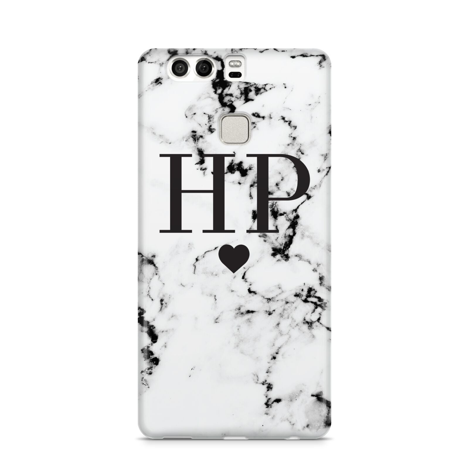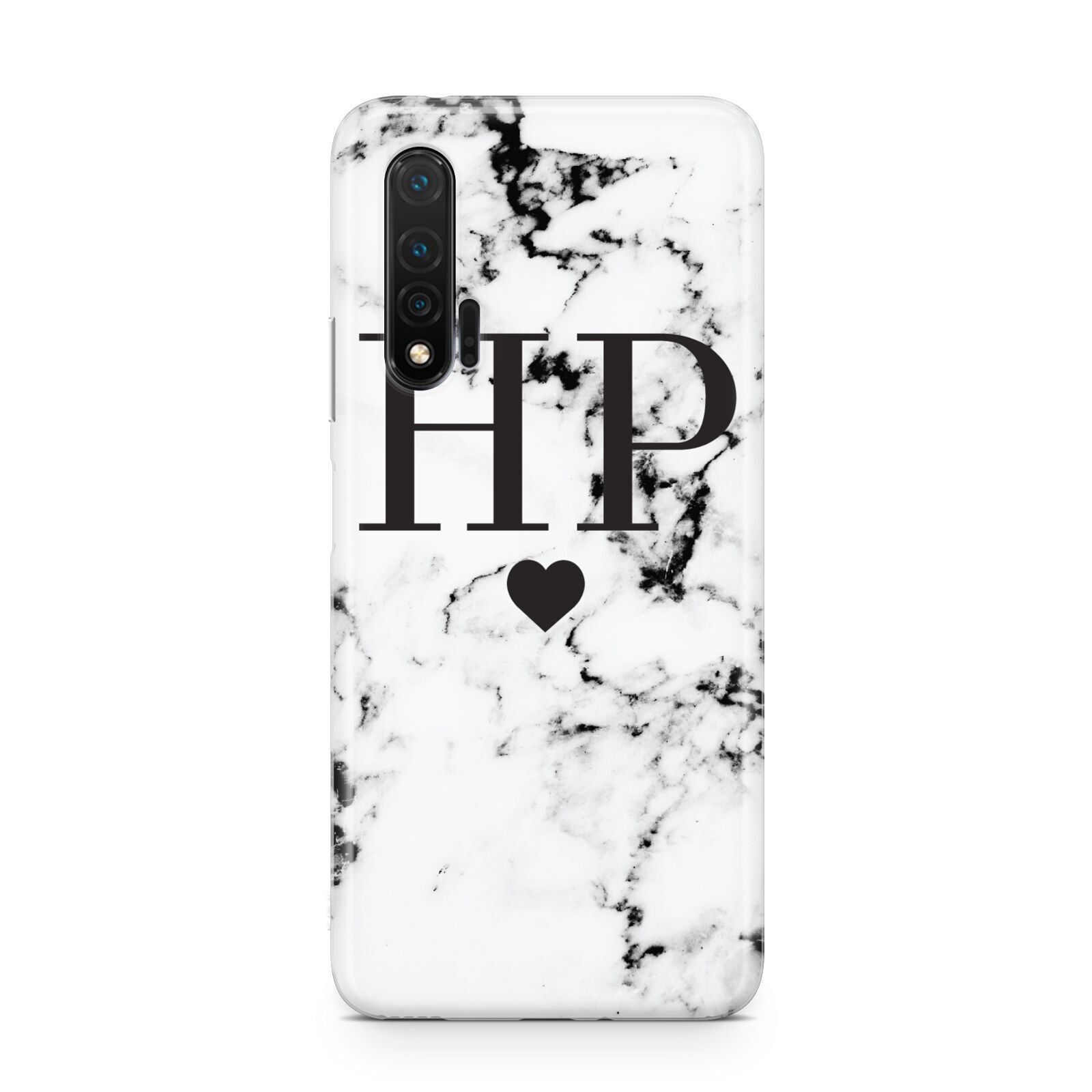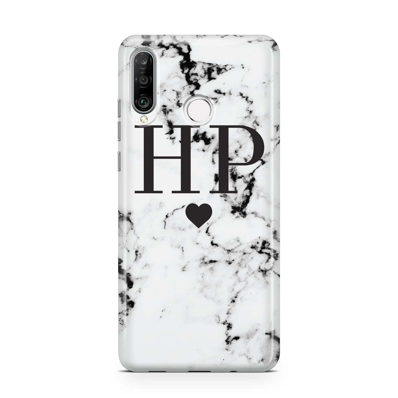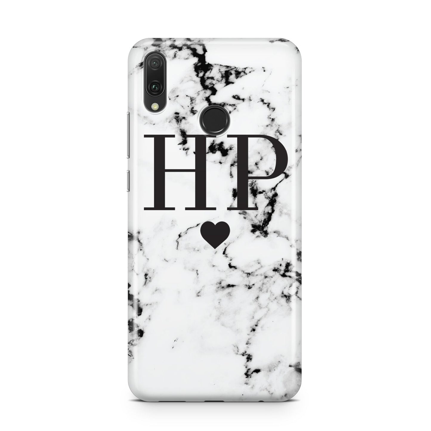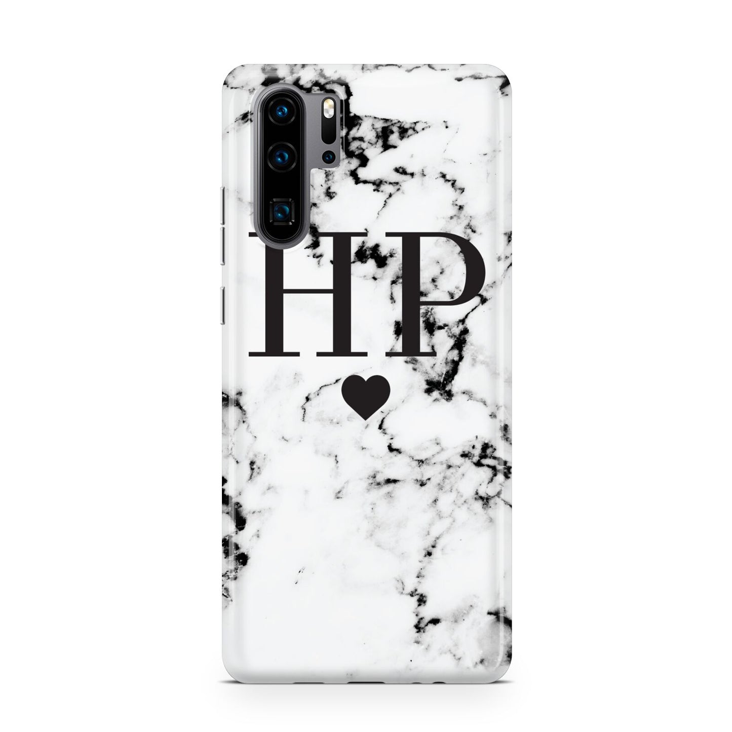 Our Heart Decal Marble Initials Personalised Huawei Case is a white and black veined marble design, with two large black initials and love heart. The large initials sit above the love heart, and are positioned above the middle of the design. Add your own initials to make a custom personalised phone case.