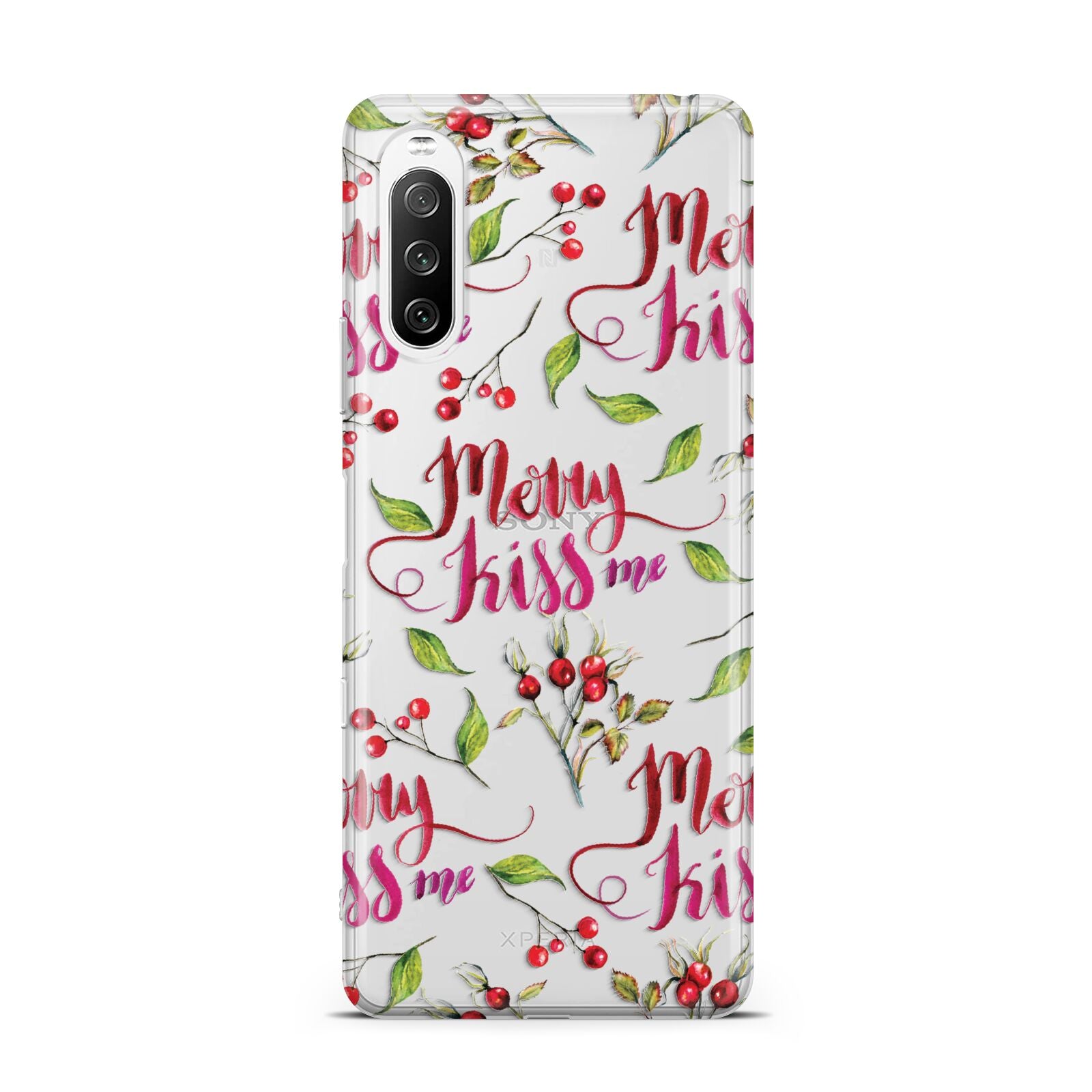 Our Merry kiss me Sony case, adds that little bit of naughty to your Christmas list. Featuring scroll text and berry foliage beautifully patterned across this clear Sony phone case. Get with the Christmas spirit and offer this to a loved one at Christmas.