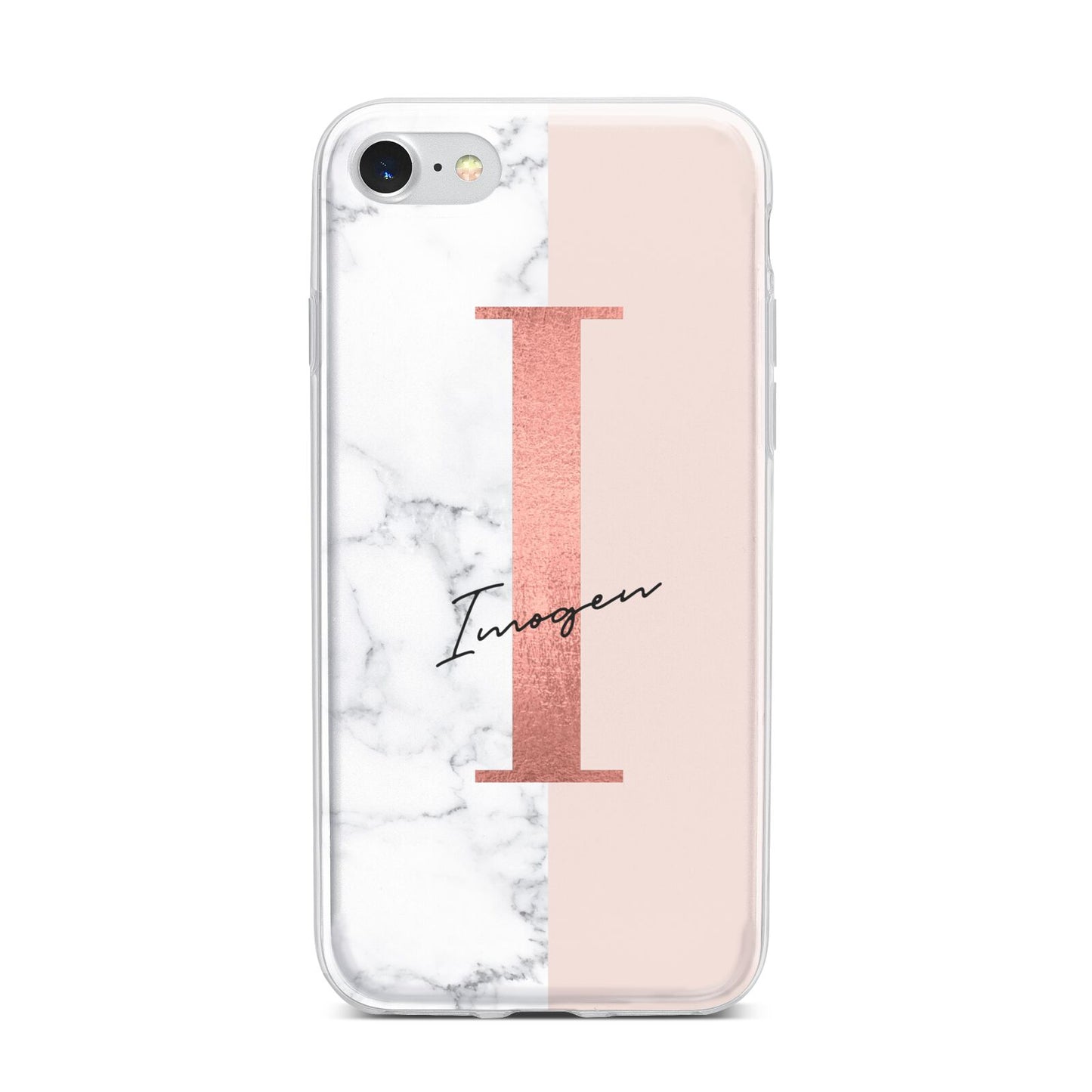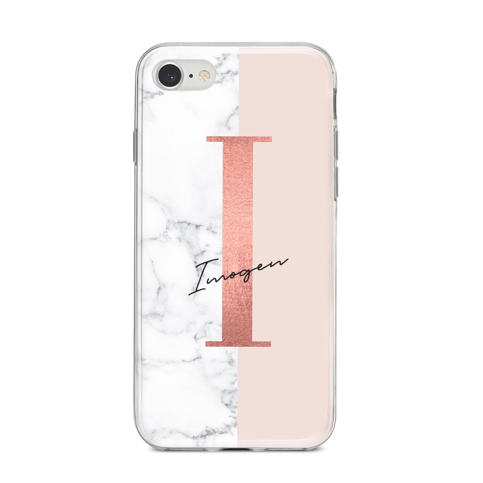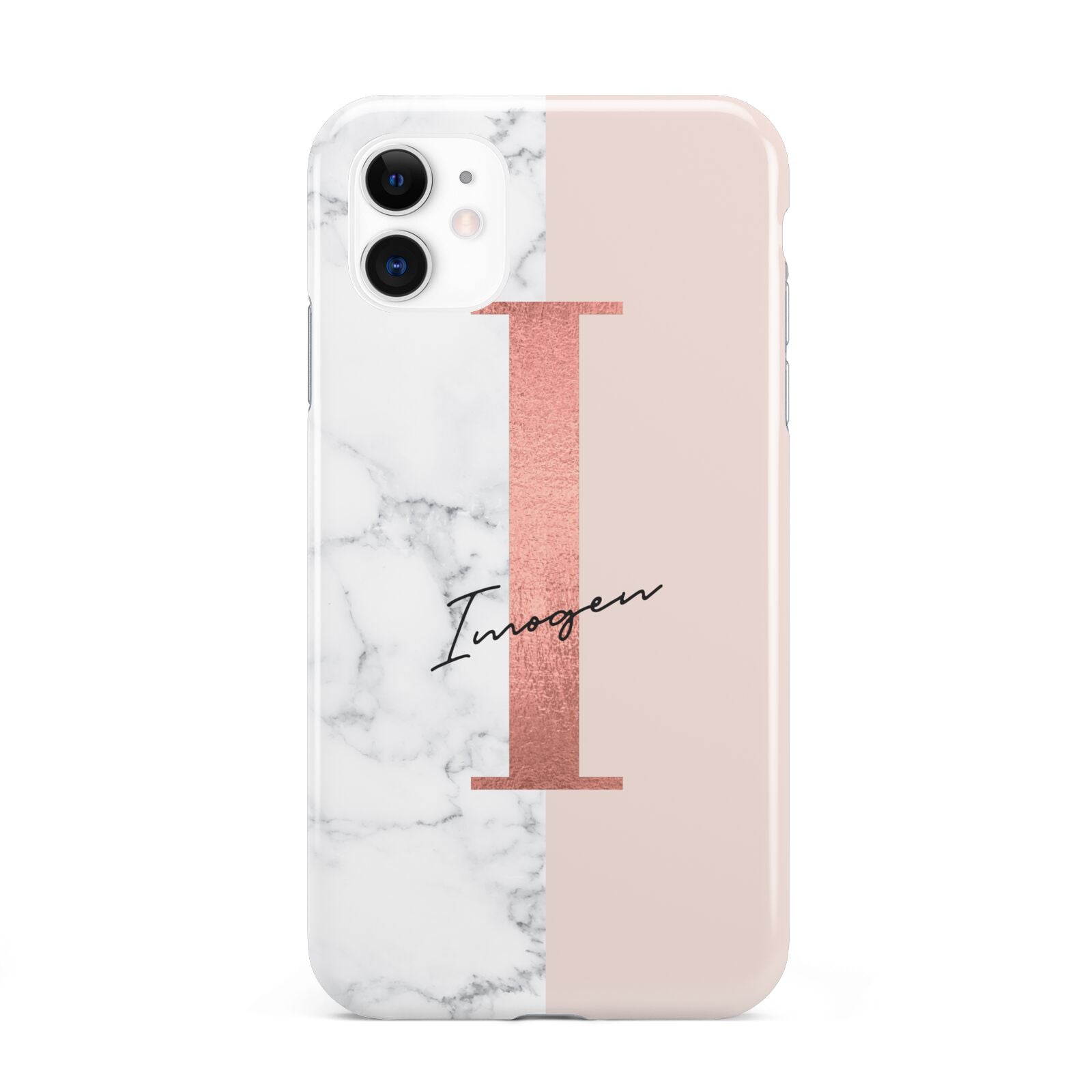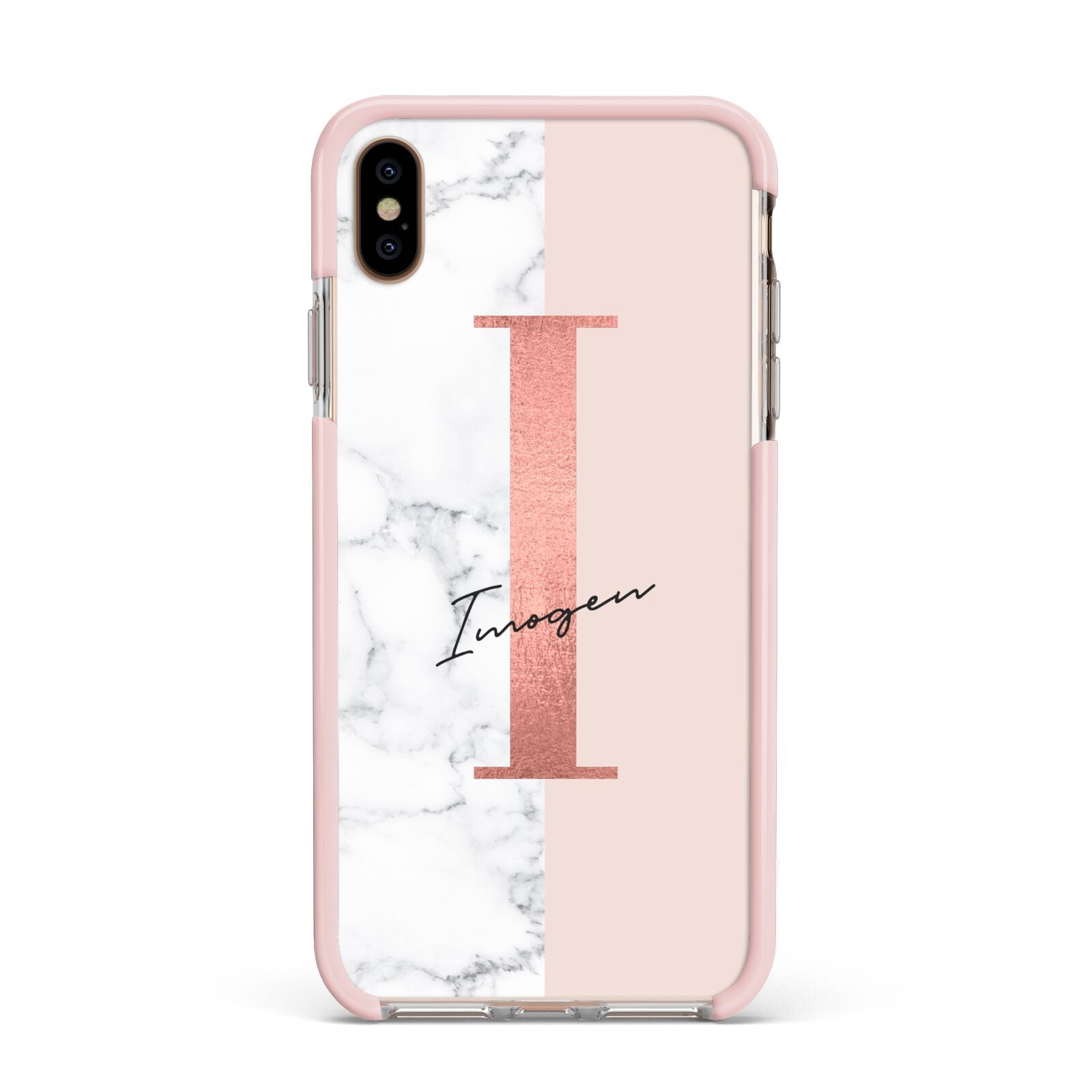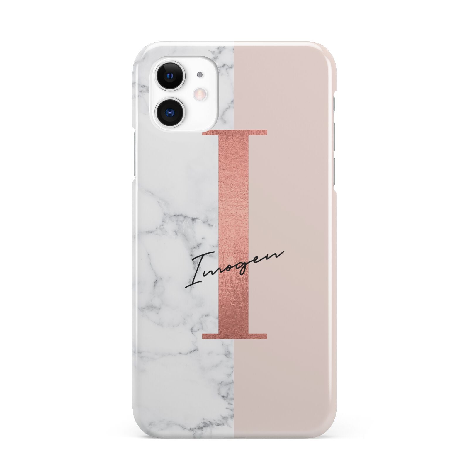 This Monogrammed Rose Gold Marble Apple iPhone Case is a natural white marble design to the left of the pattern, with a nude pink plain block to the right. In the center we have a large rose gold effect initial, along with a black signature font name.