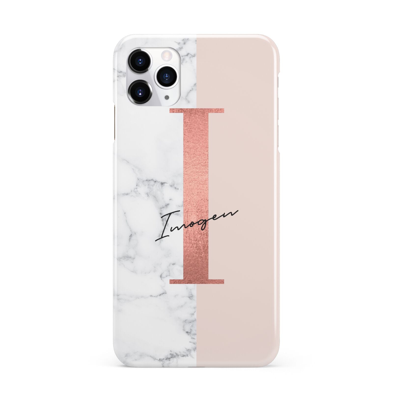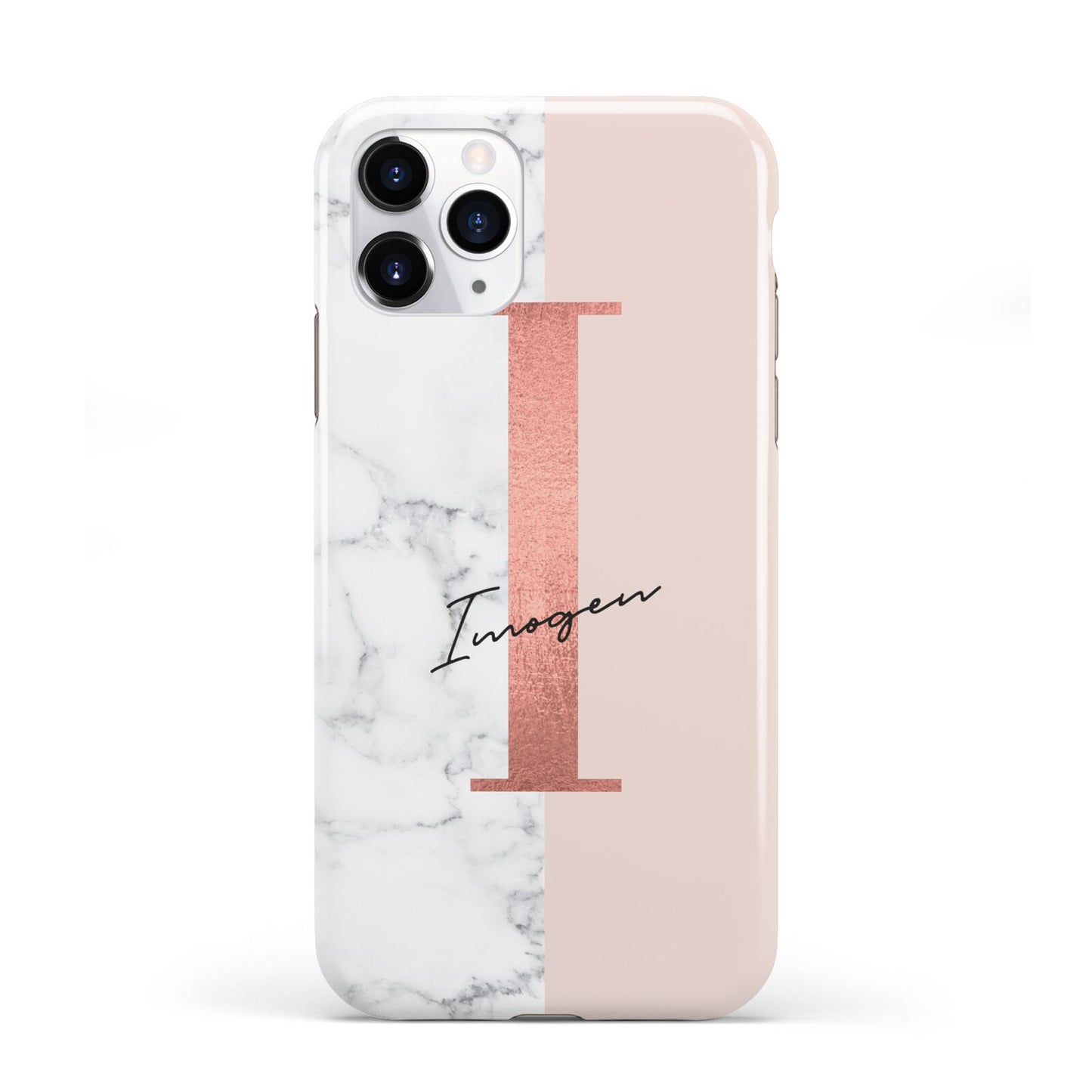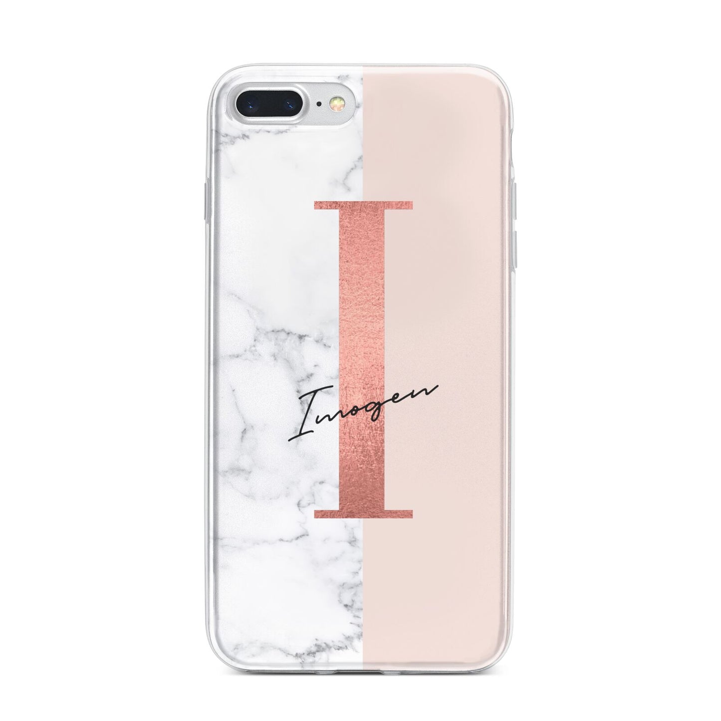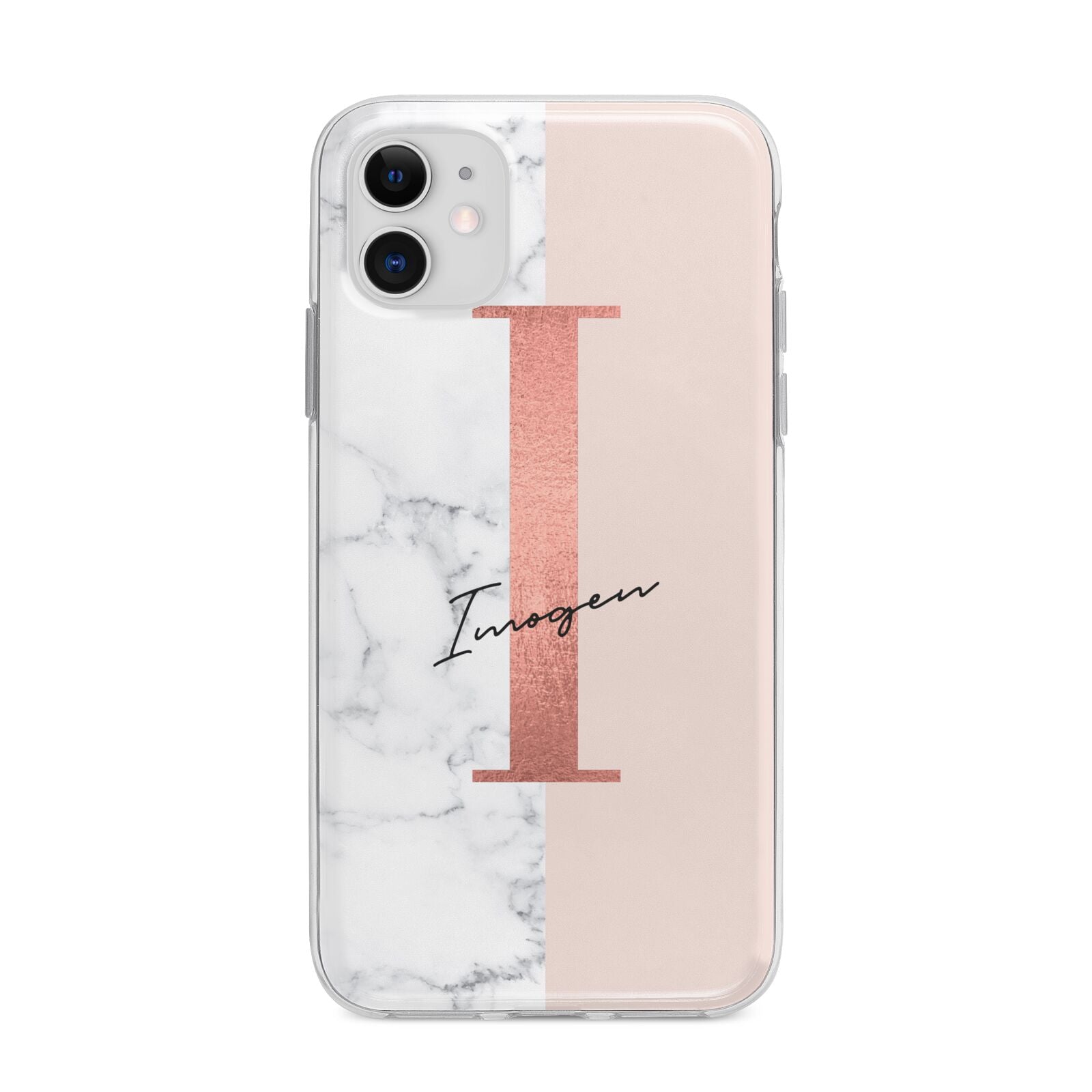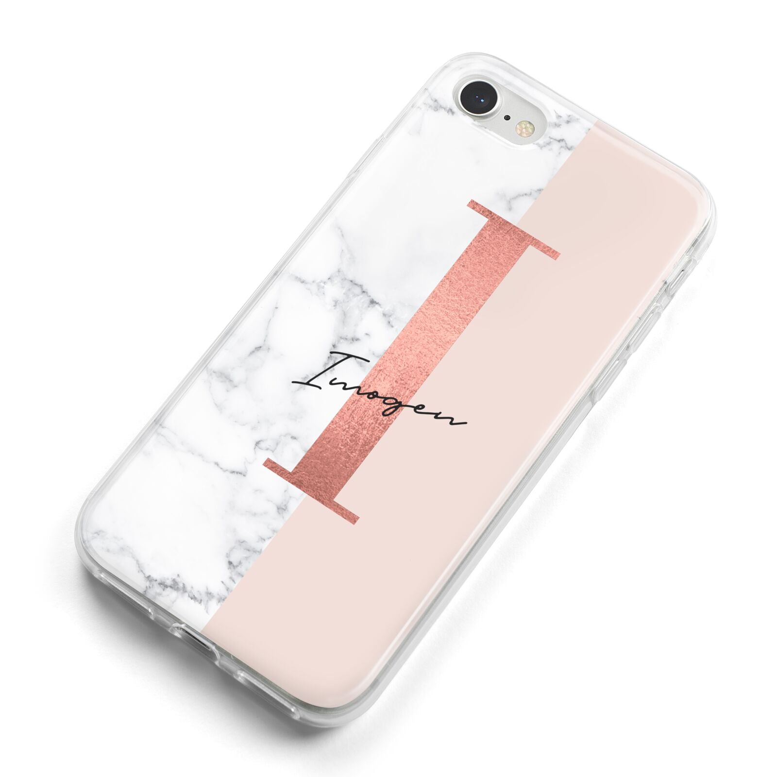 This Monogrammed Rose Gold Marble Apple iPhone Case is a natural white marble design to the left of the pattern, with a nude pink plain block to the right. In the center we have a large rose gold effect initial, along with a black signature font name.