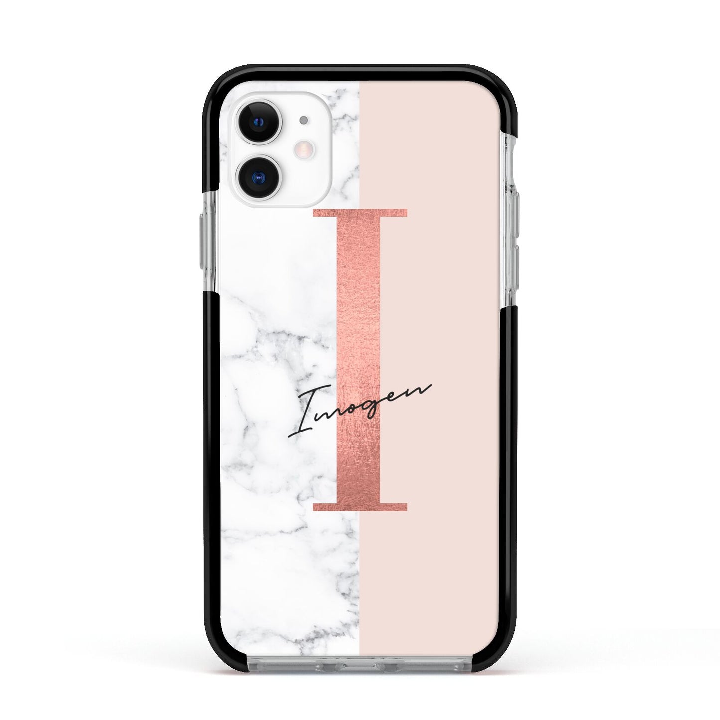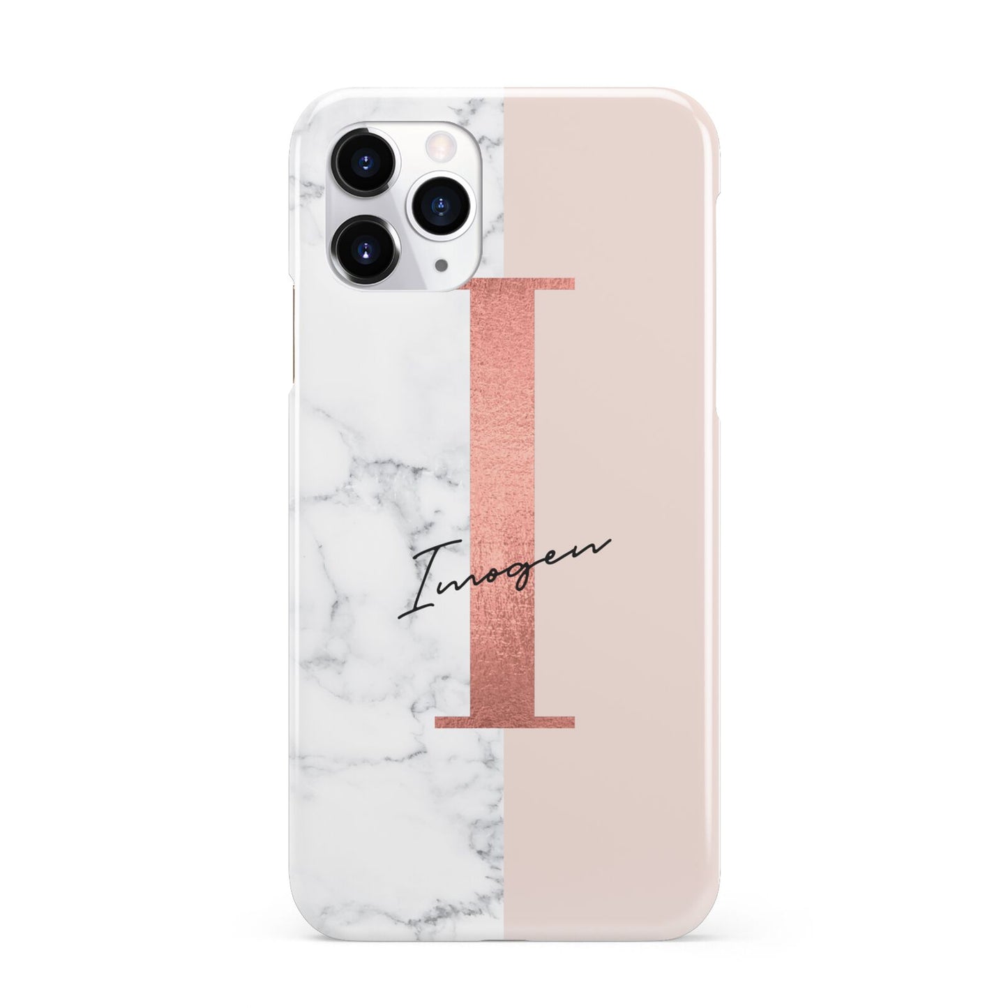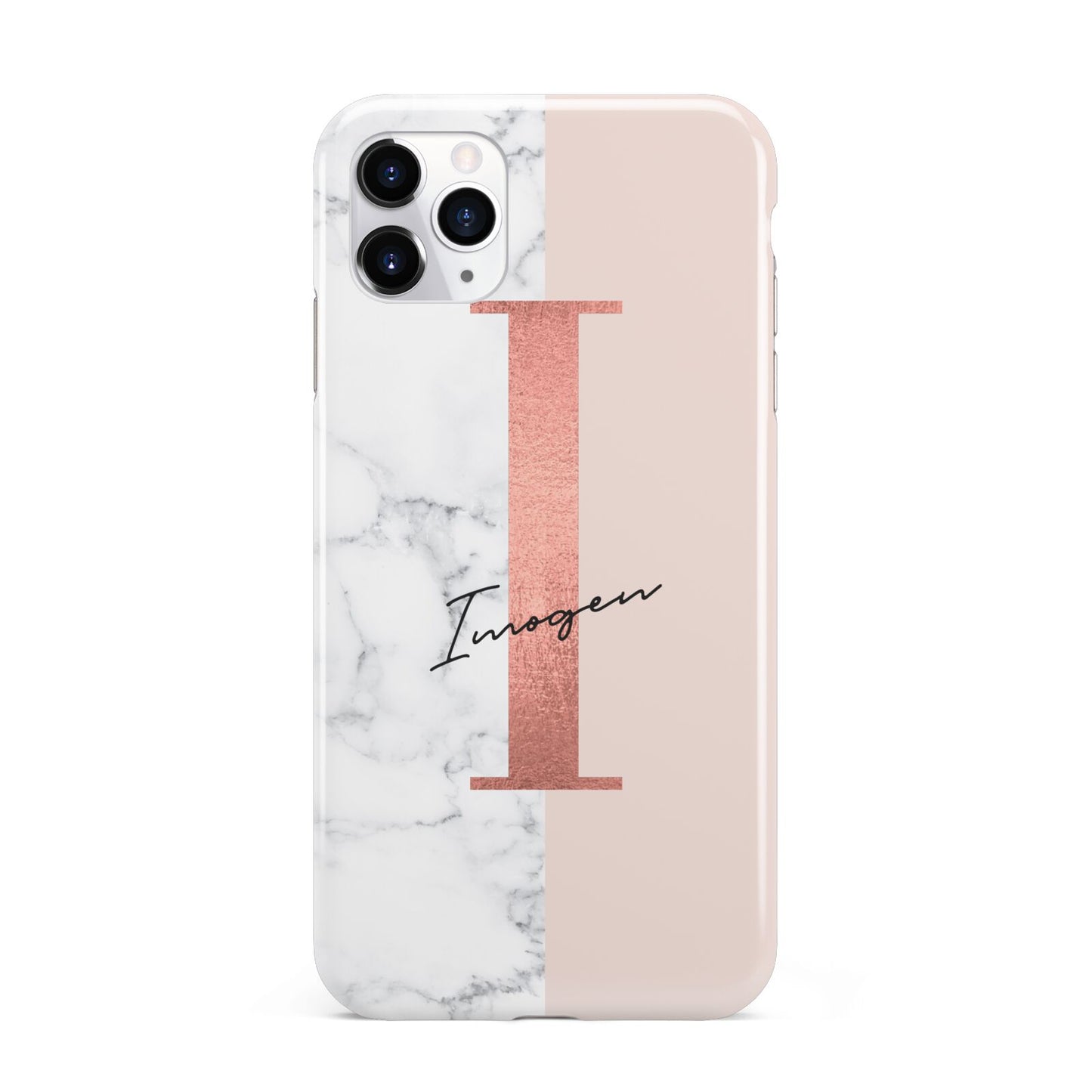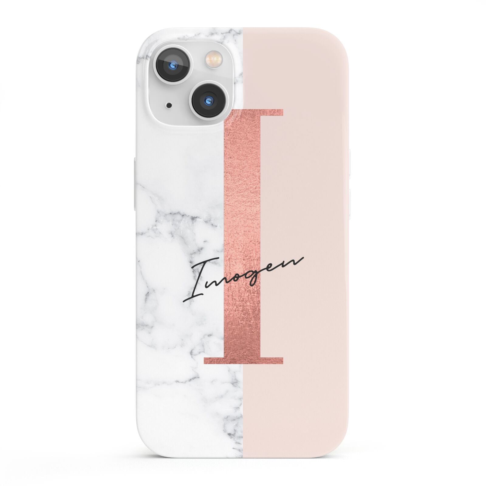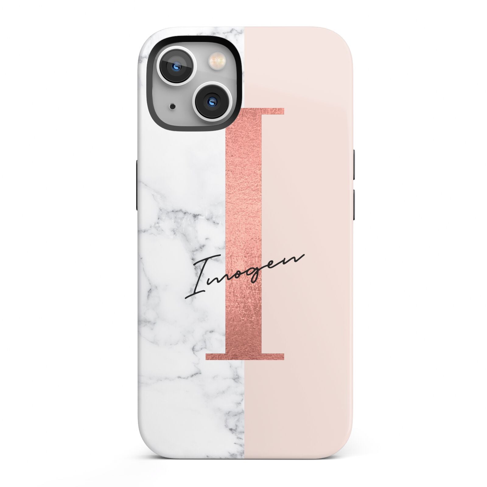 This Monogrammed Rose Gold Marble Apple iPhone Case is a natural white marble design to the left of the pattern, with a nude pink plain block to the right. In the center we have a large rose gold effect initial, along with a black signature font name.