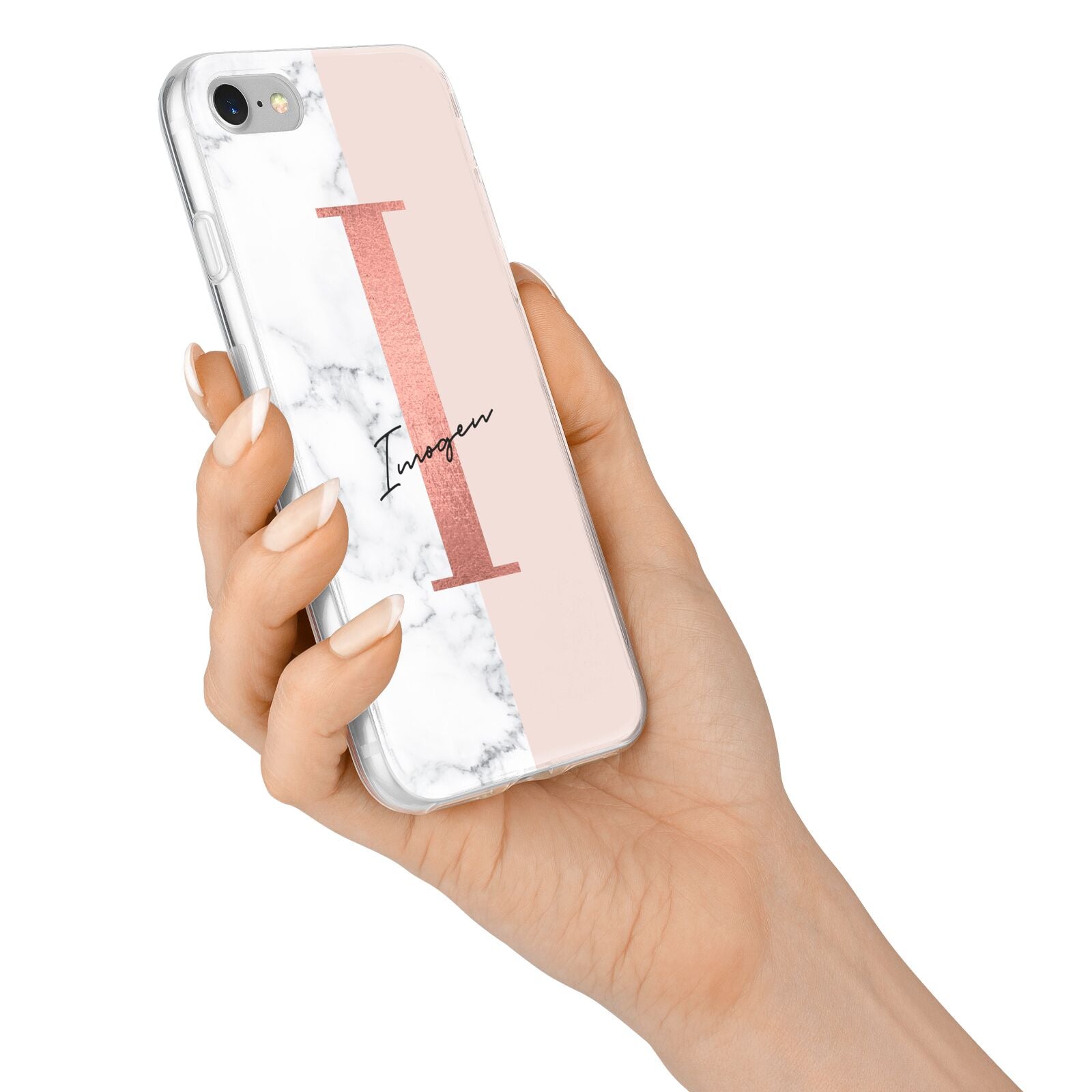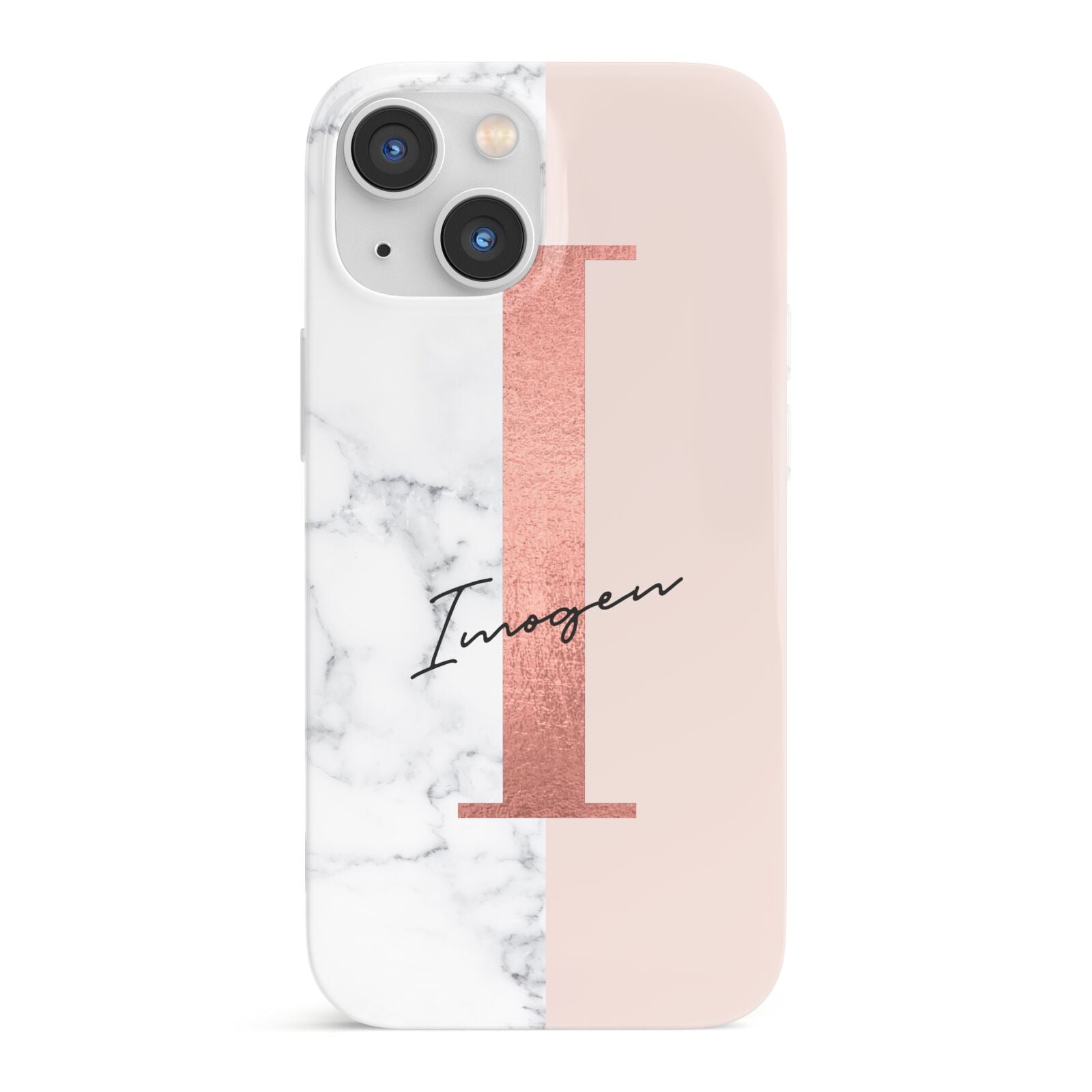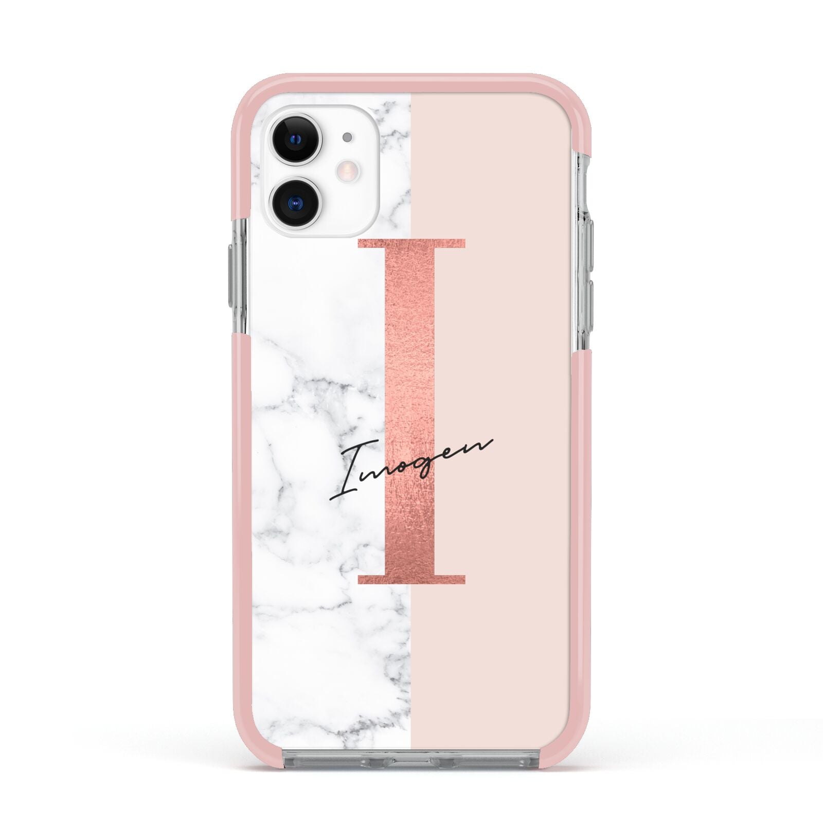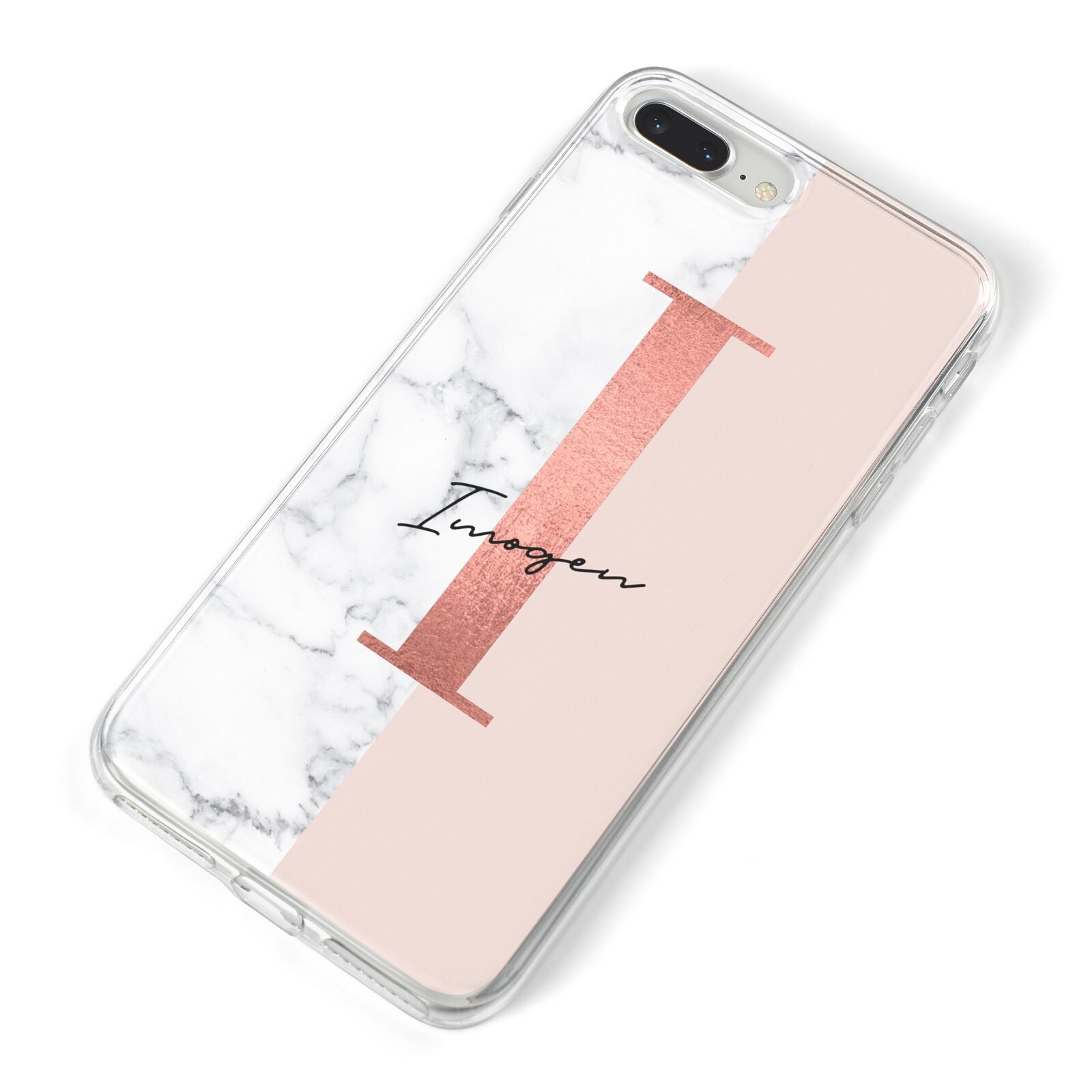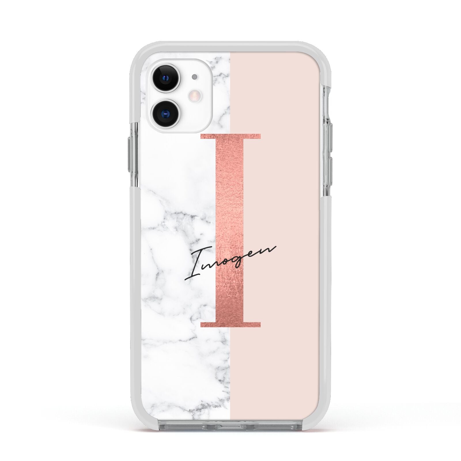 This Monogrammed Rose Gold Marble Apple iPhone Case is a natural white marble design to the left of the pattern, with a nude pink plain block to the right. In the center we have a large rose gold effect initial, along with a black signature font name.