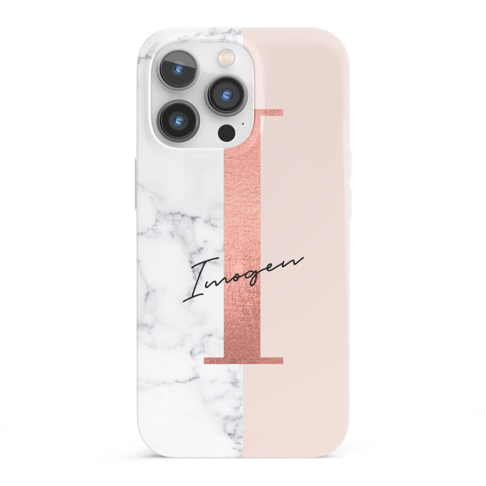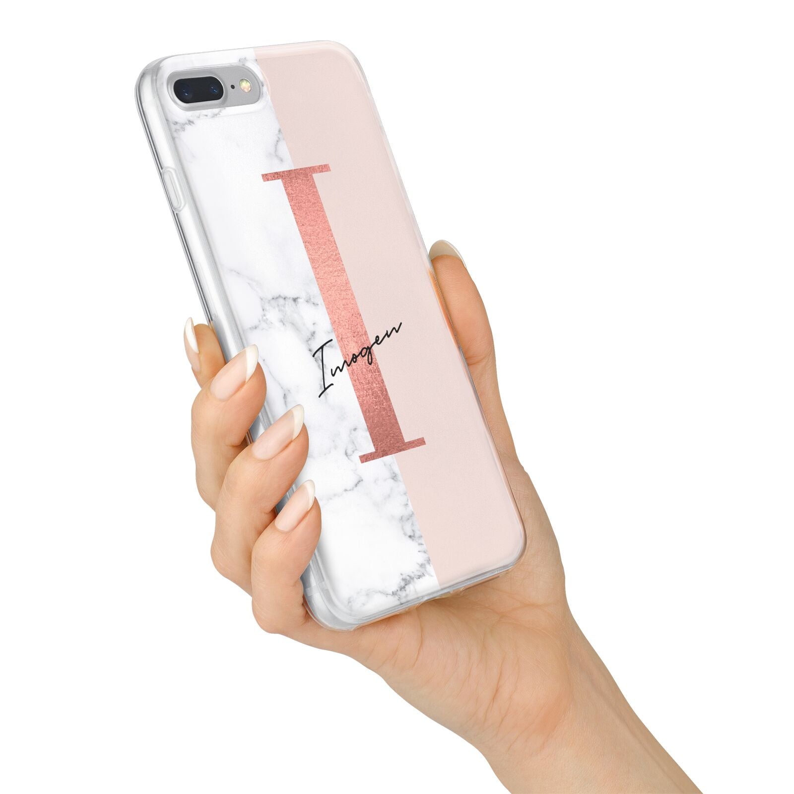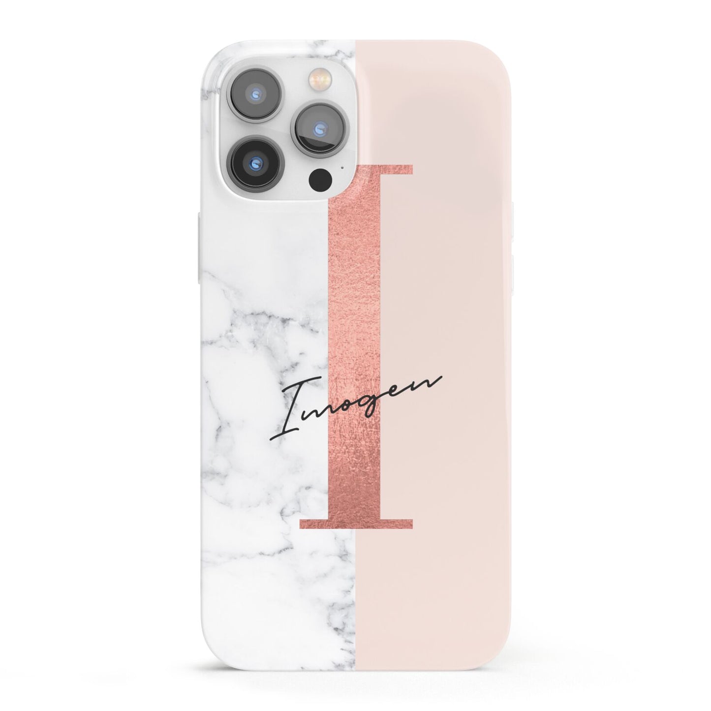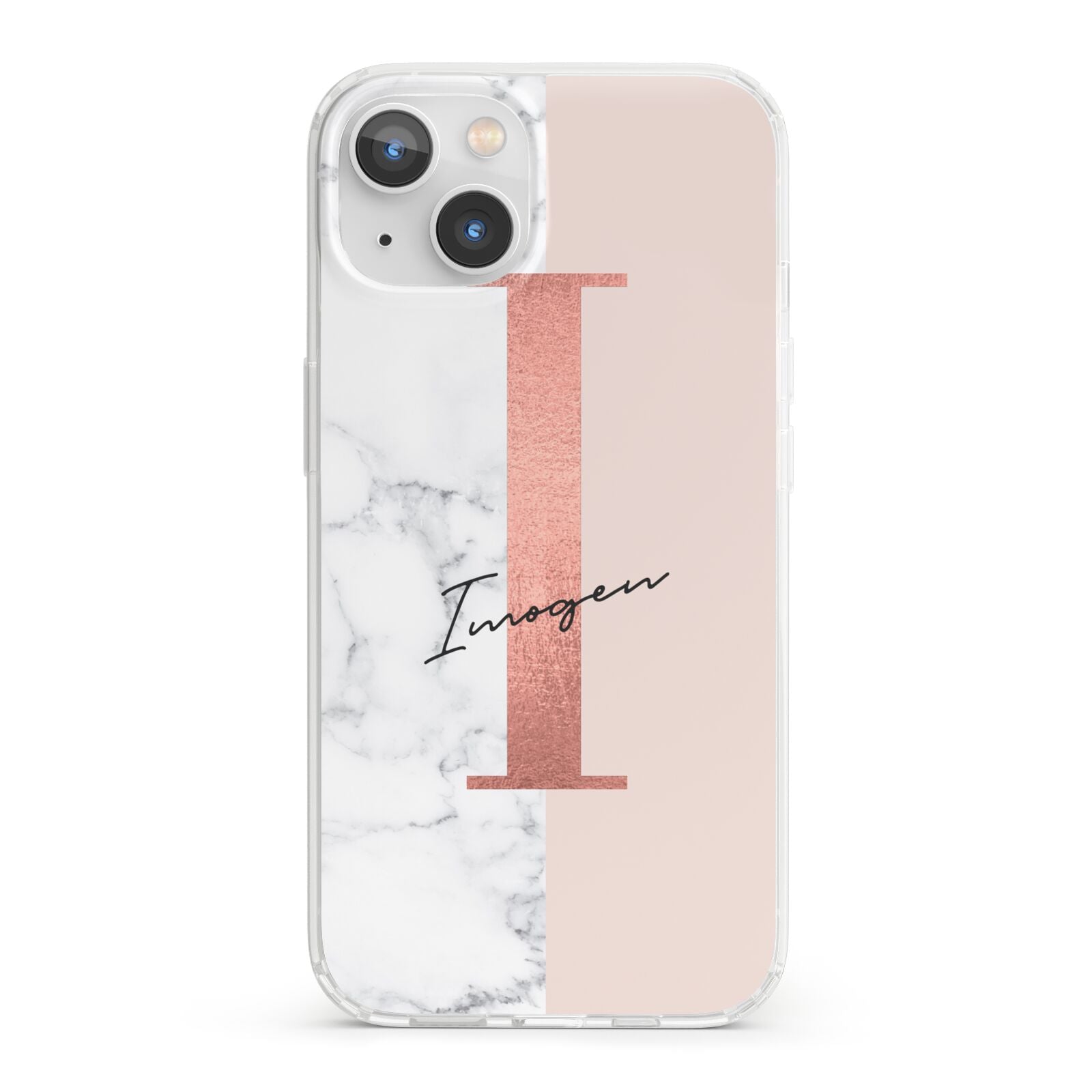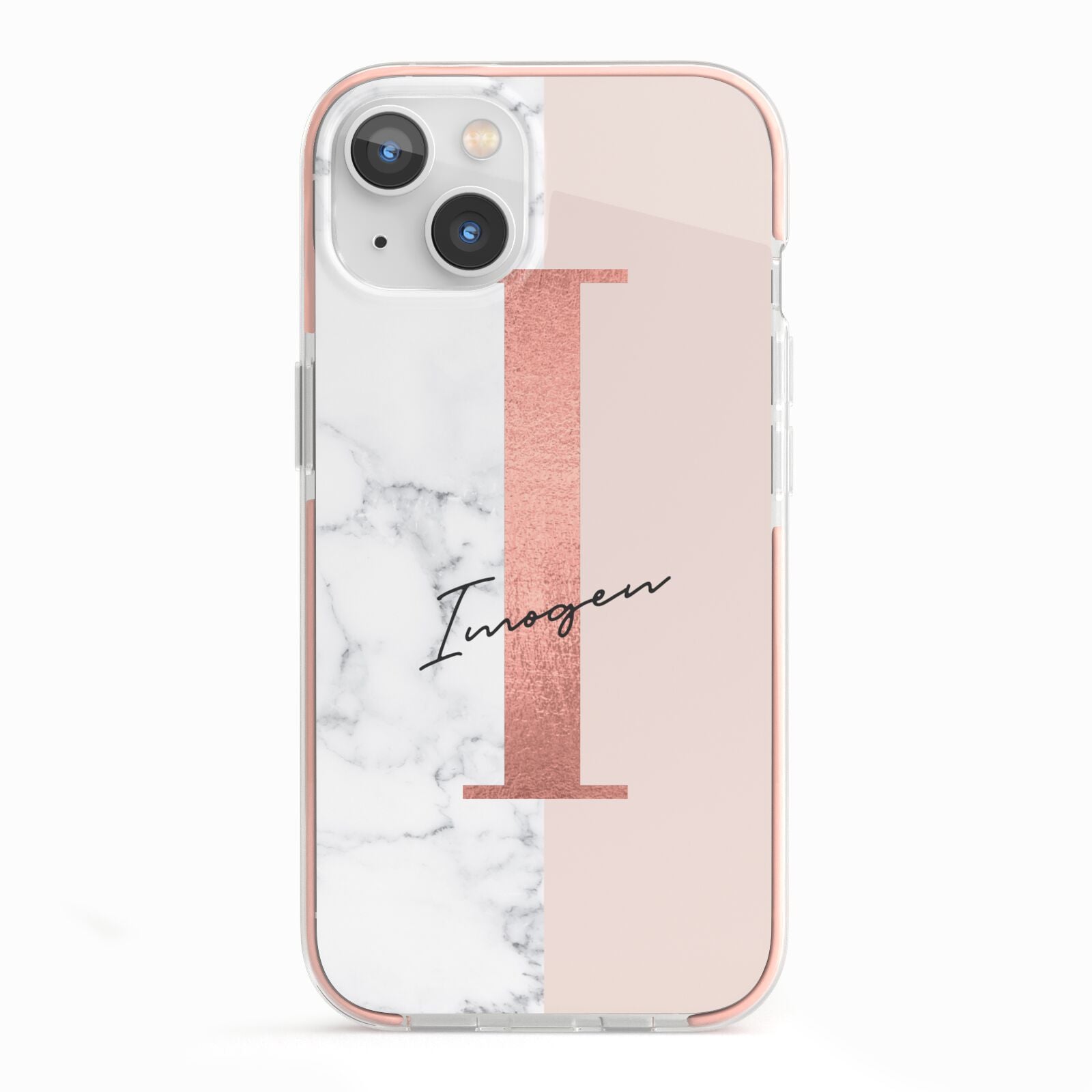 This Monogrammed Rose Gold Marble Apple iPhone Case is a natural white marble design to the left of the pattern, with a nude pink plain block to the right. In the center we have a large rose gold effect initial, along with a black signature font name.