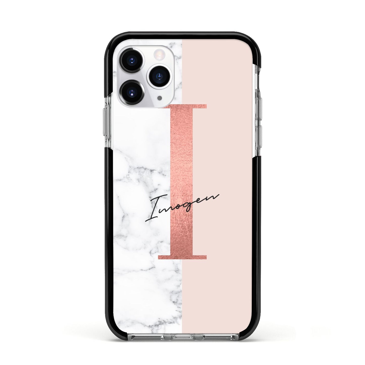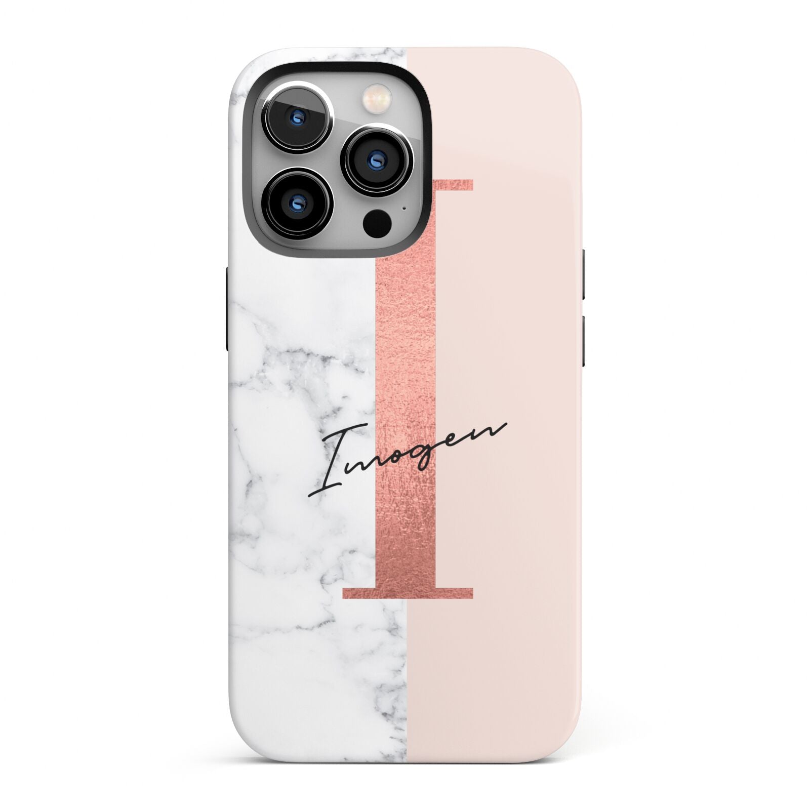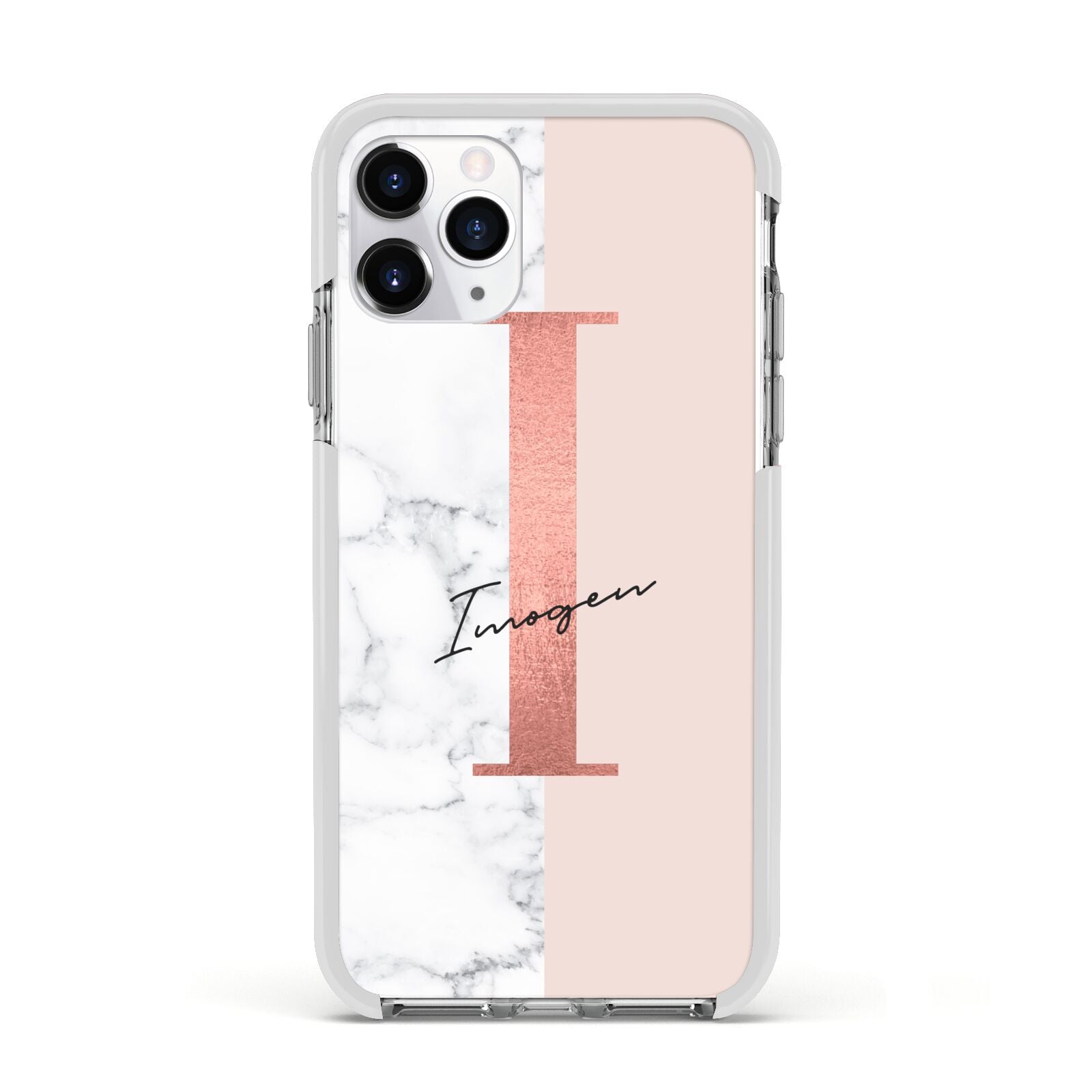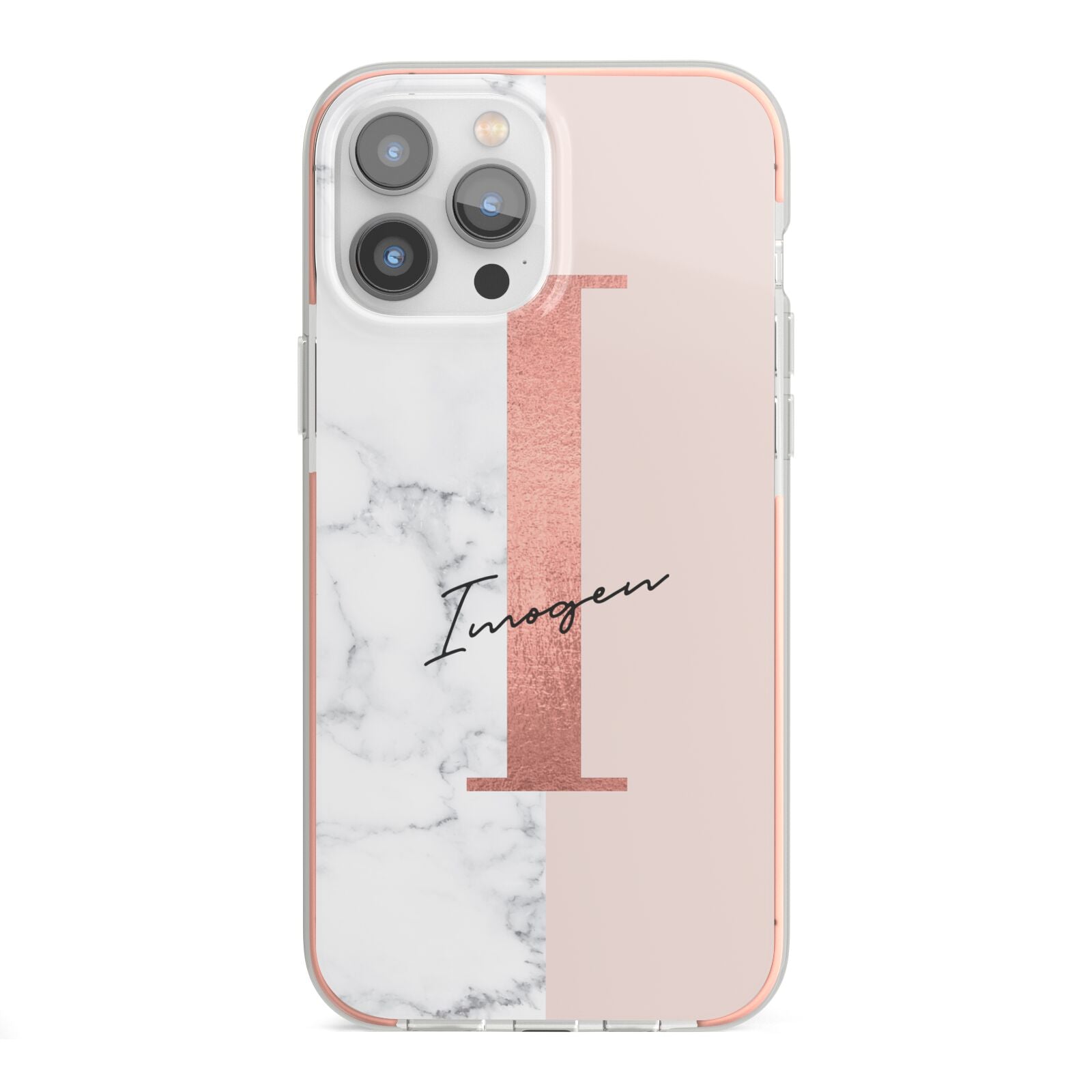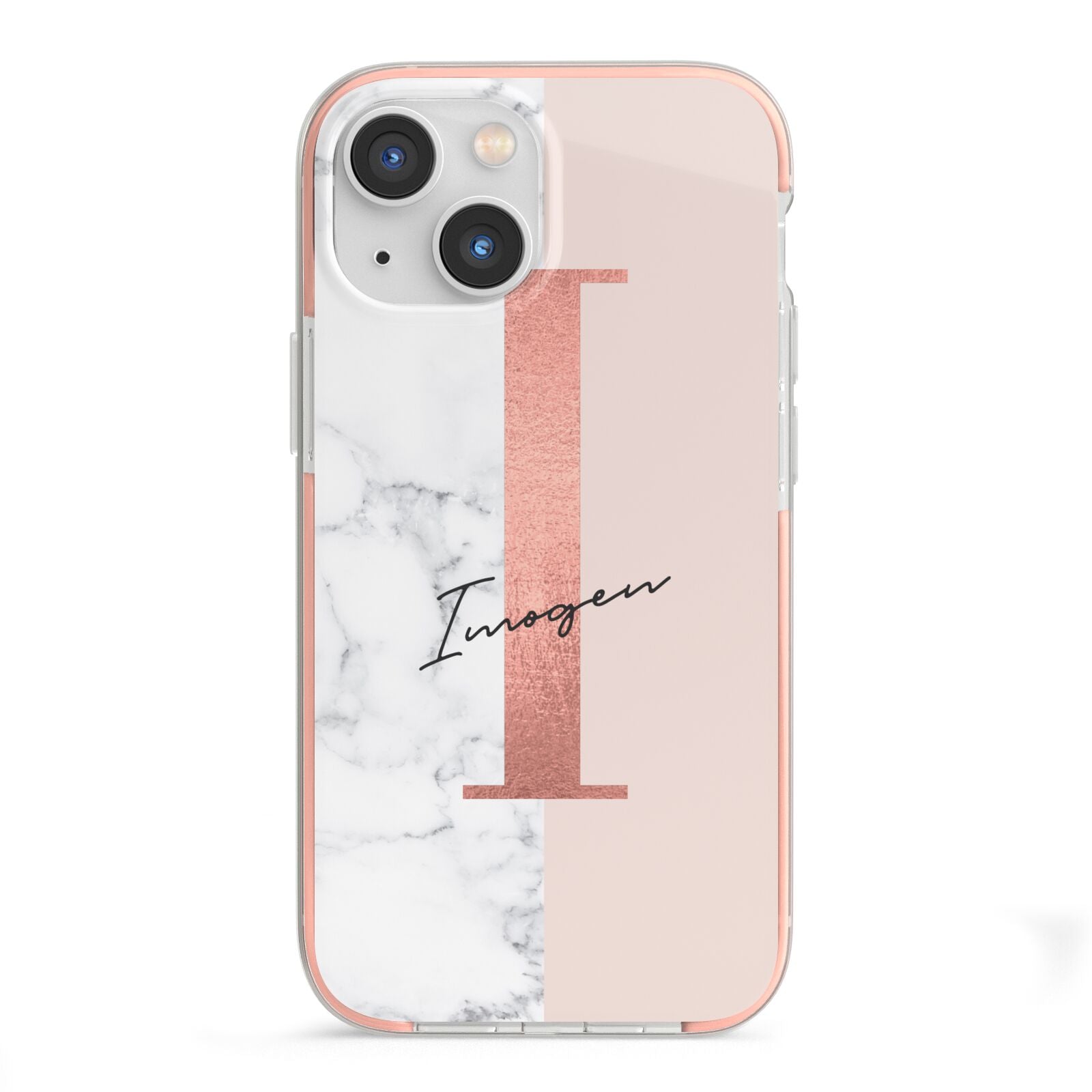 This Monogrammed Rose Gold Marble Apple iPhone Case is a natural white marble design to the left of the pattern, with a nude pink plain block to the right. In the center we have a large rose gold effect initial, along with a black signature font name.