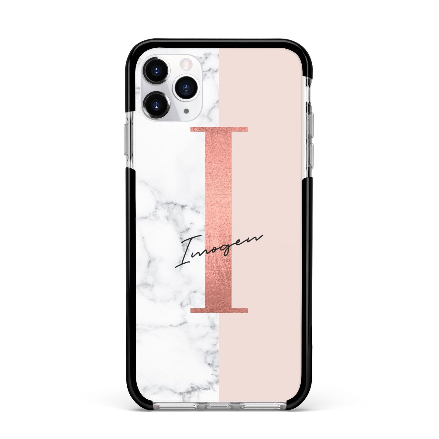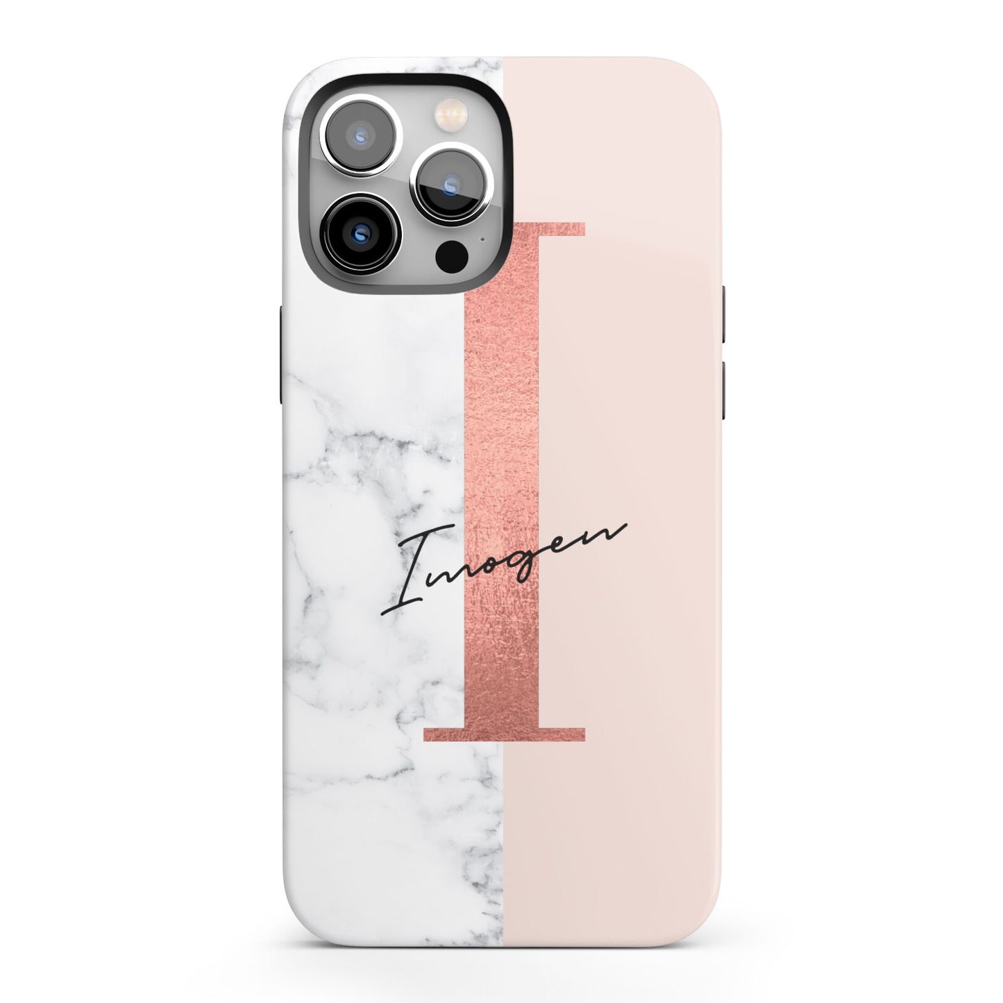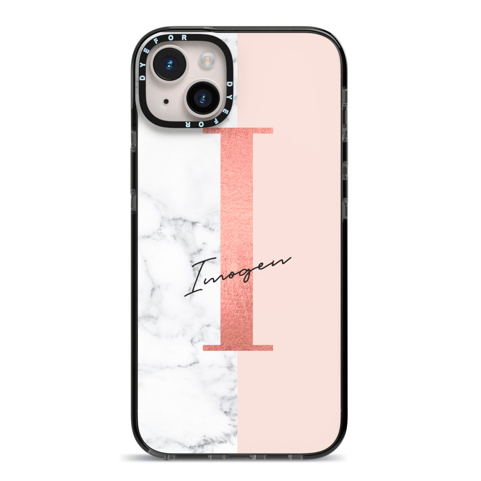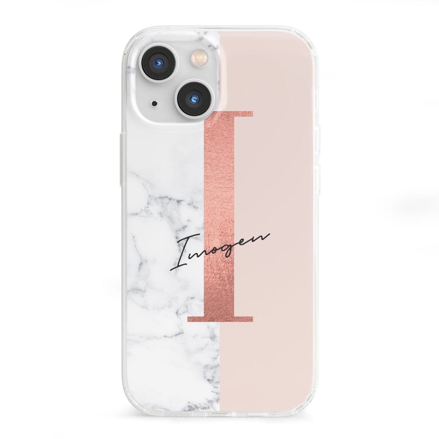 This Monogrammed Rose Gold Marble Apple iPhone Case is a natural white marble design to the left of the pattern, with a nude pink plain block to the right. In the center we have a large rose gold effect initial, along with a black signature font name.