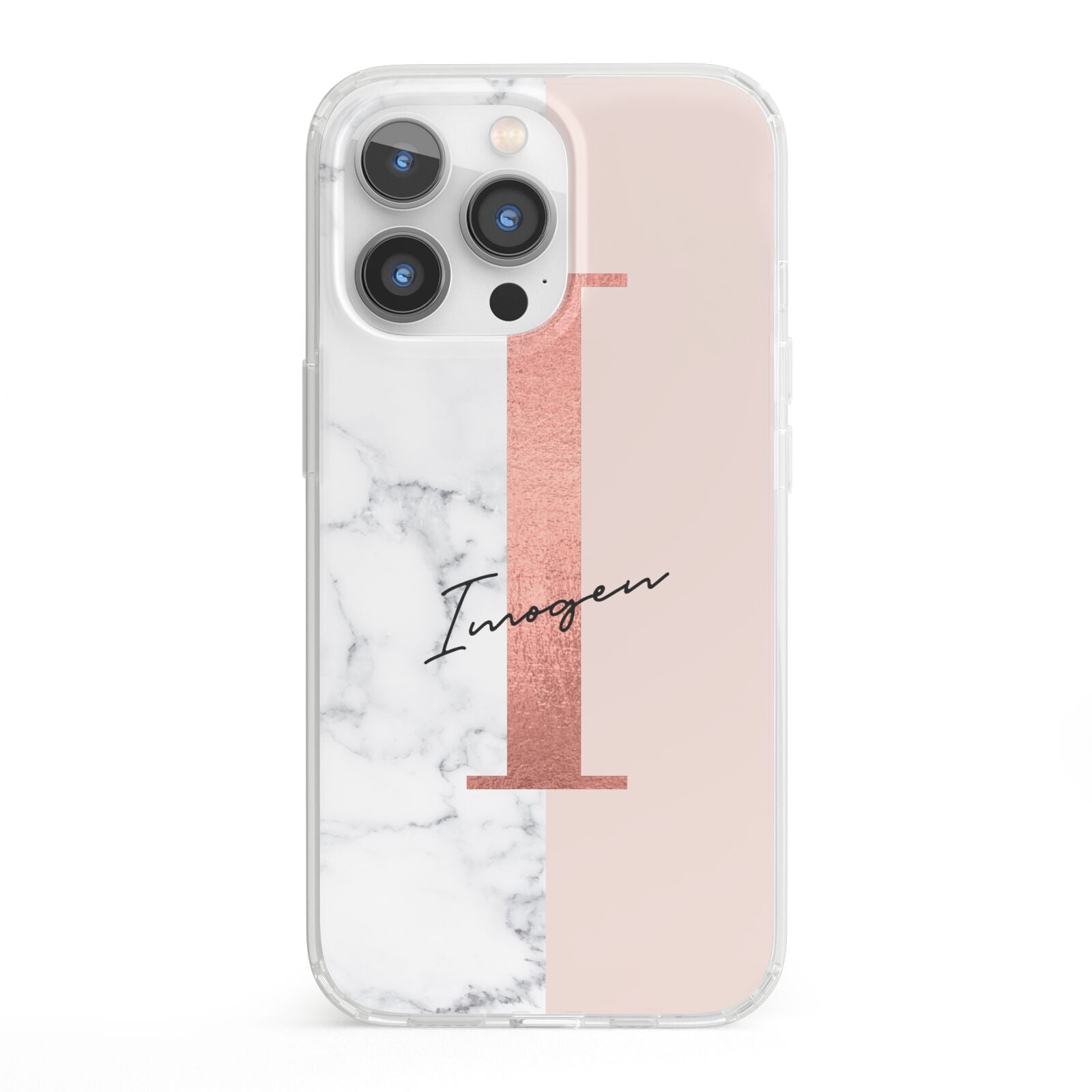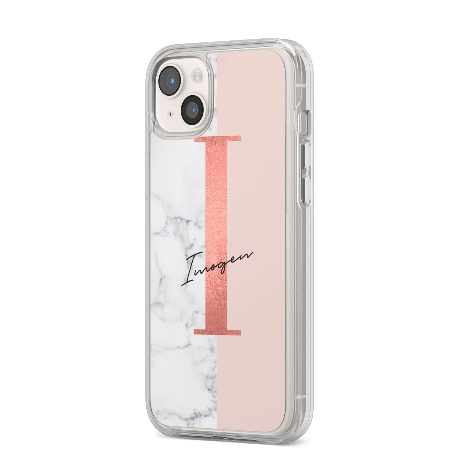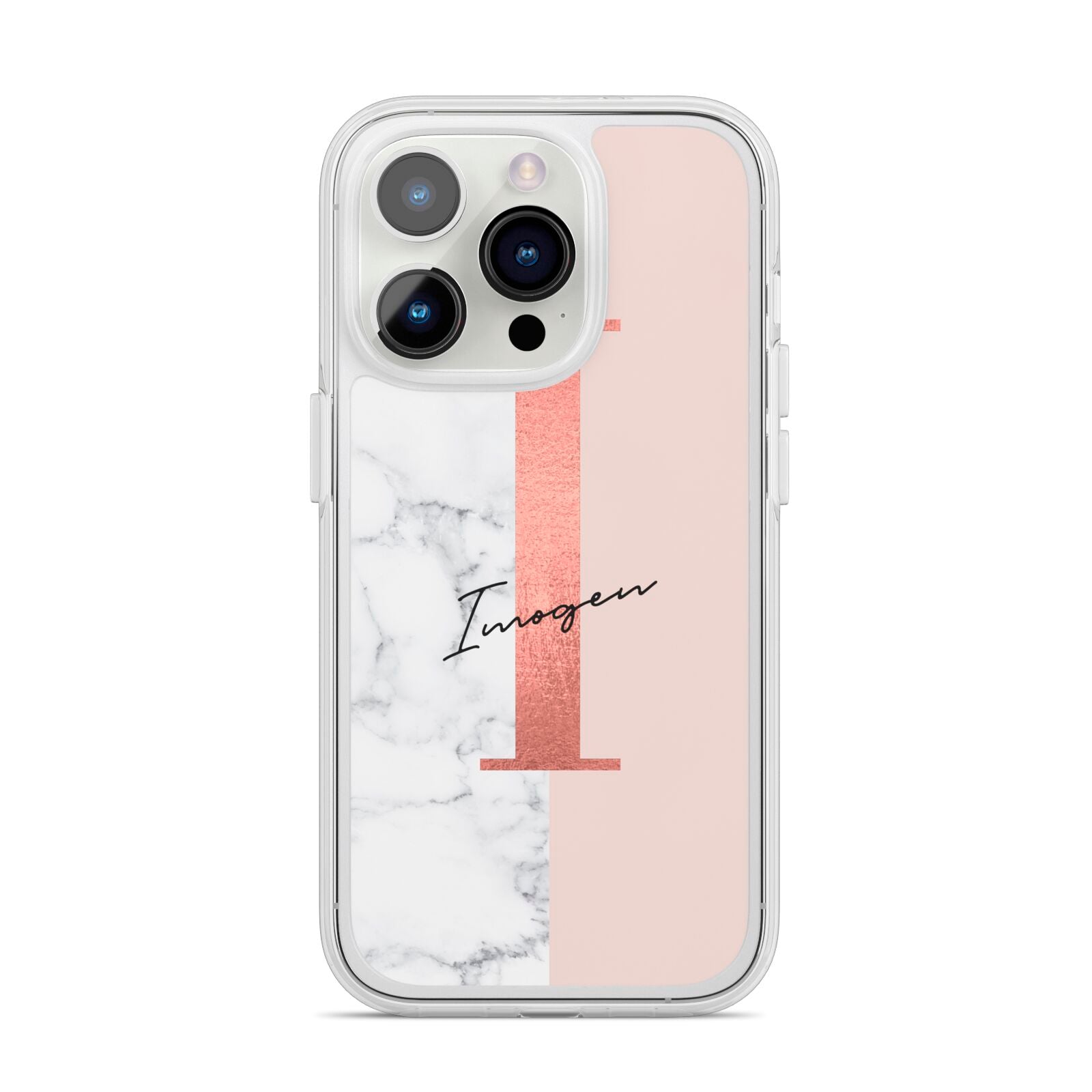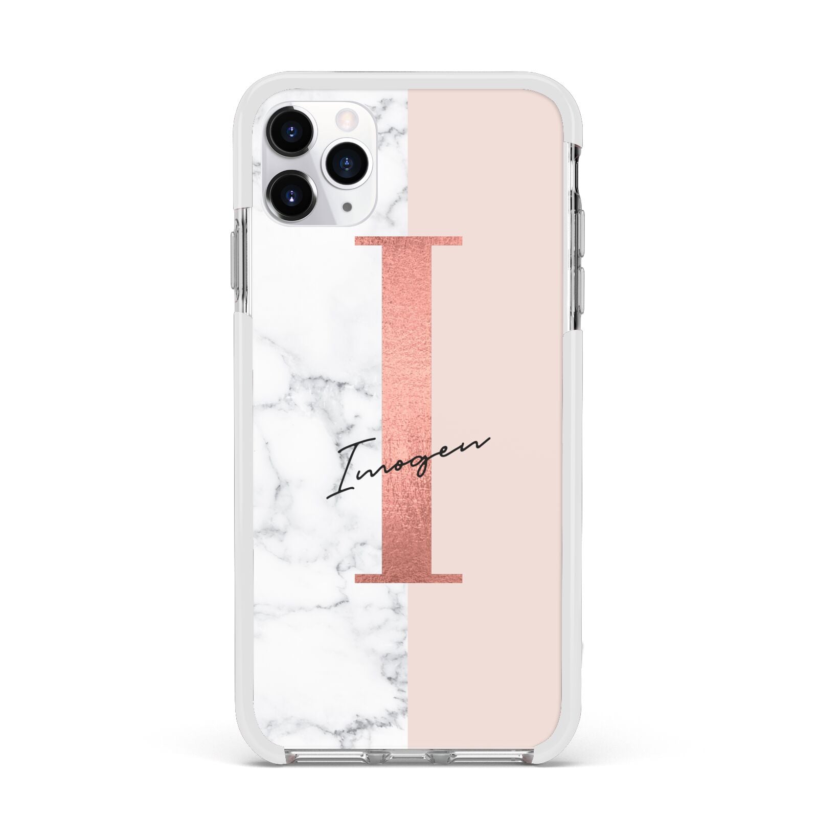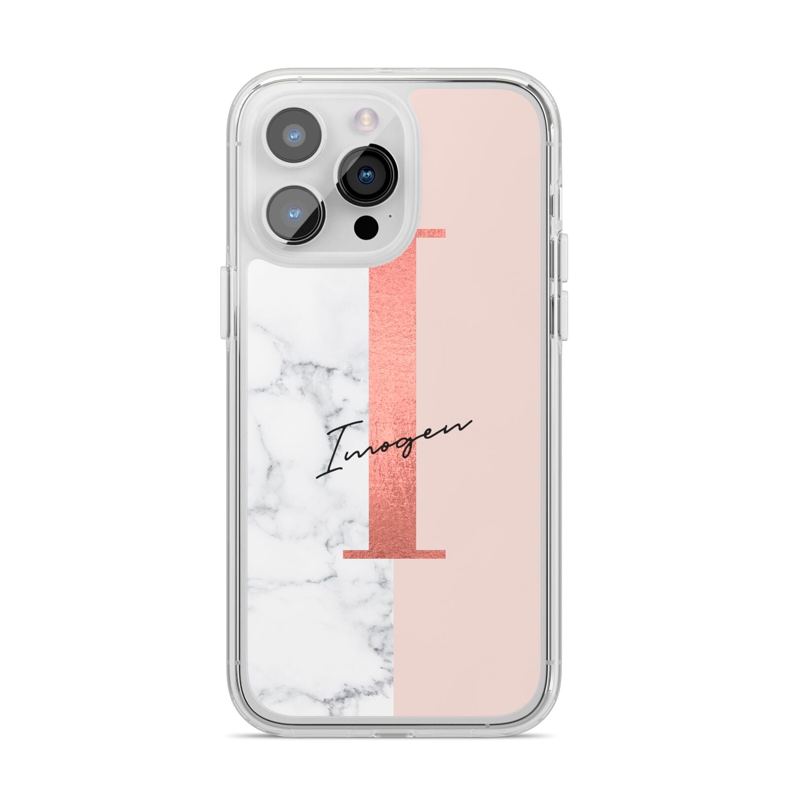 This Monogrammed Rose Gold Marble Apple iPhone Case is a natural white marble design to the left of the pattern, with a nude pink plain block to the right. In the center we have a large rose gold effect initial, along with a black signature font name.