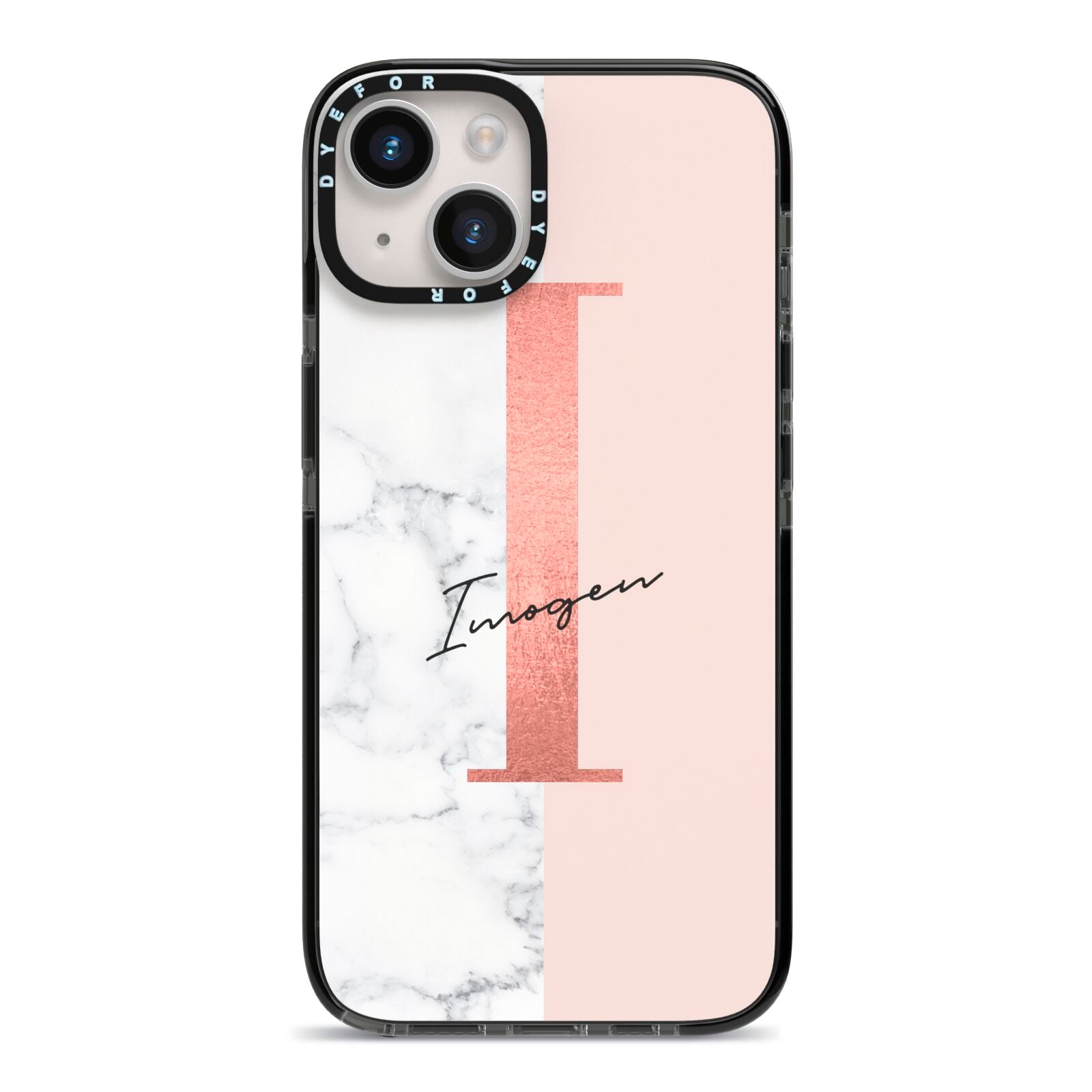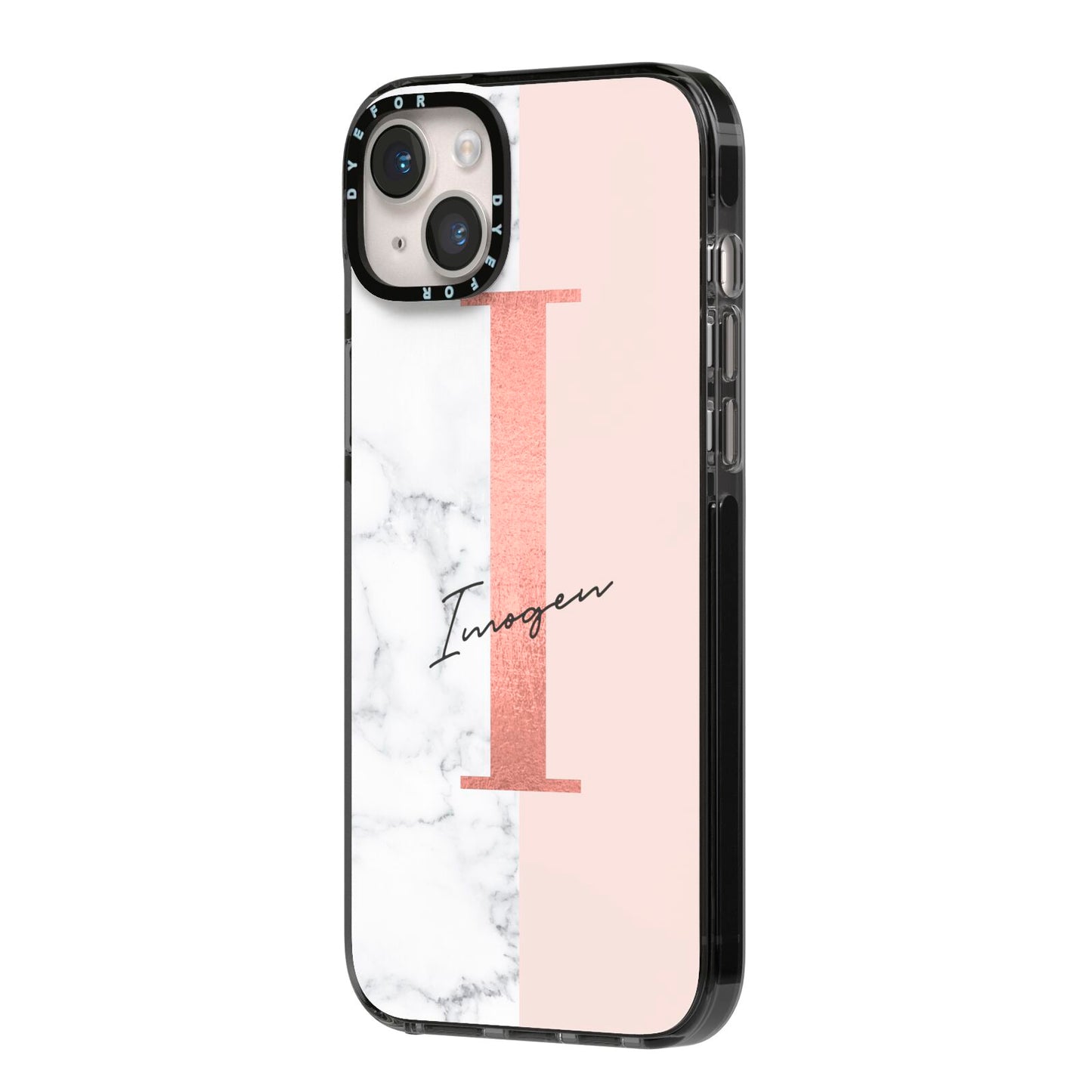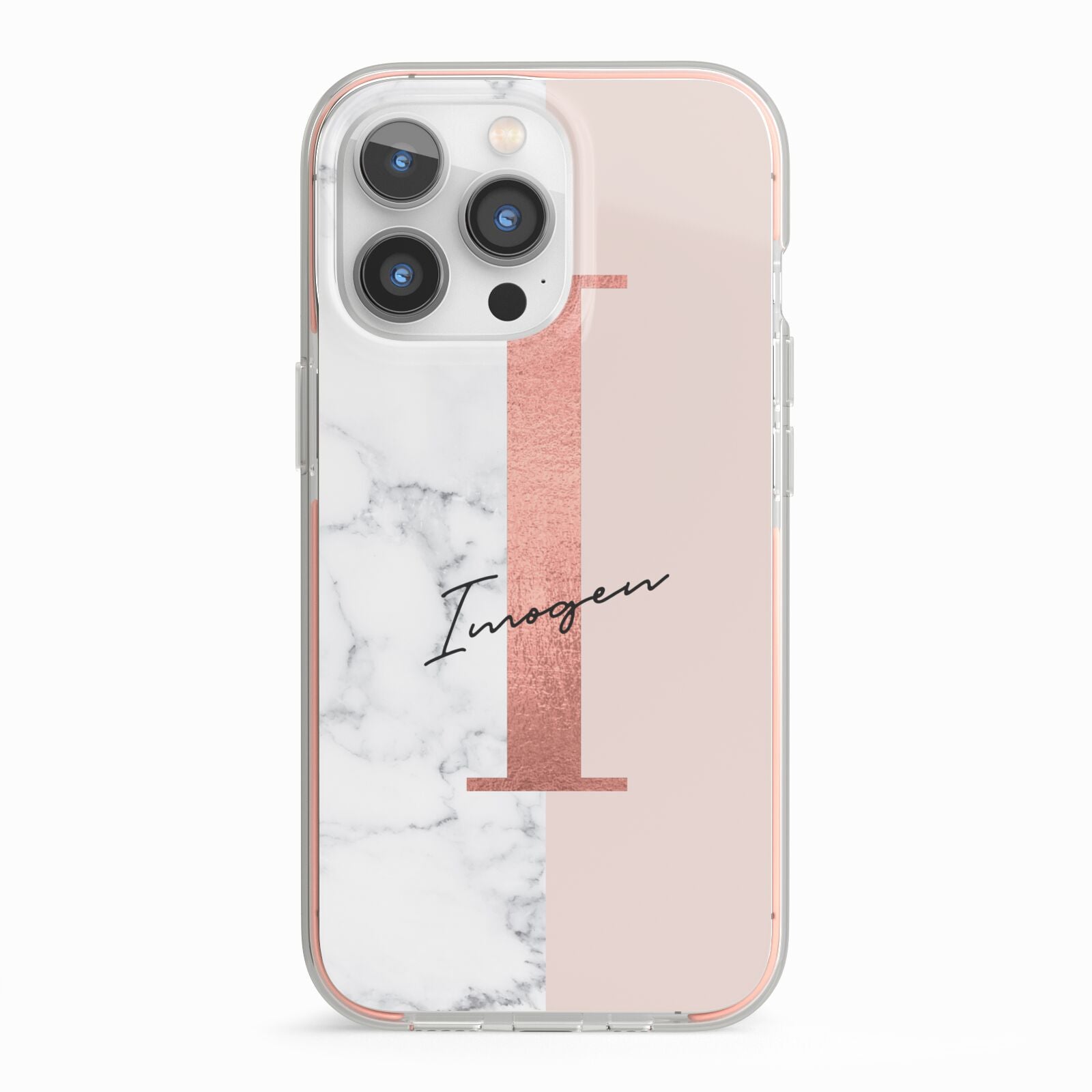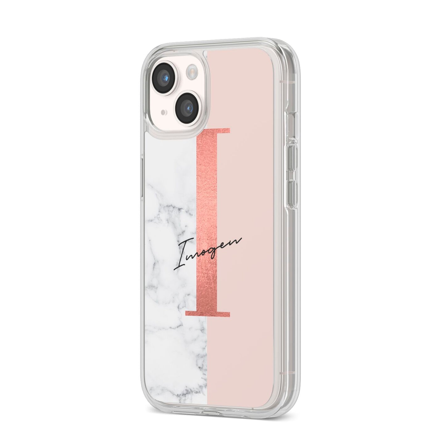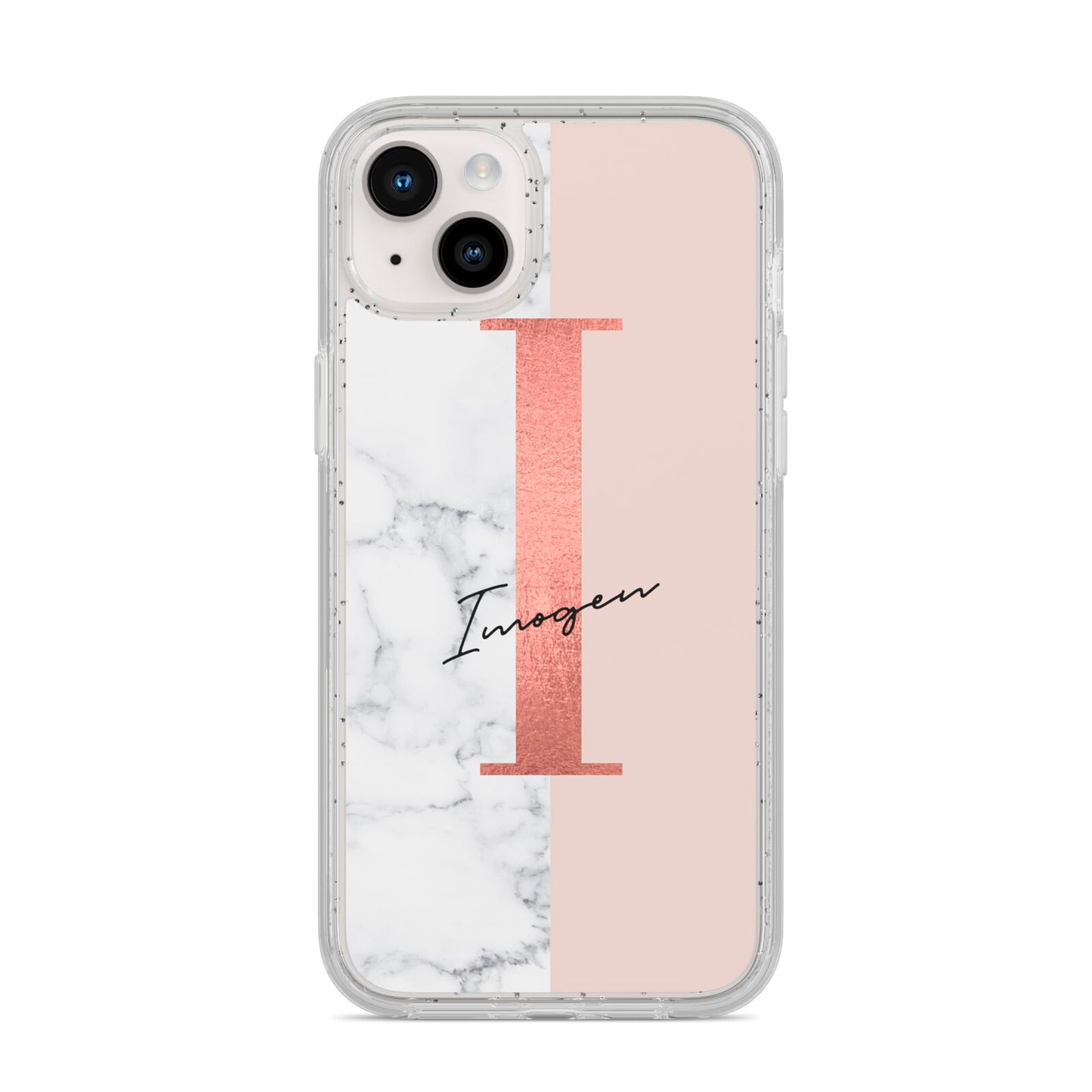This Monogrammed Rose Gold Marble Apple iPhone Case is a natural white marble design to the left of the pattern, with a nude pink plain block to the right. In the center we have a large rose gold effect initial, along with a black signature font name.