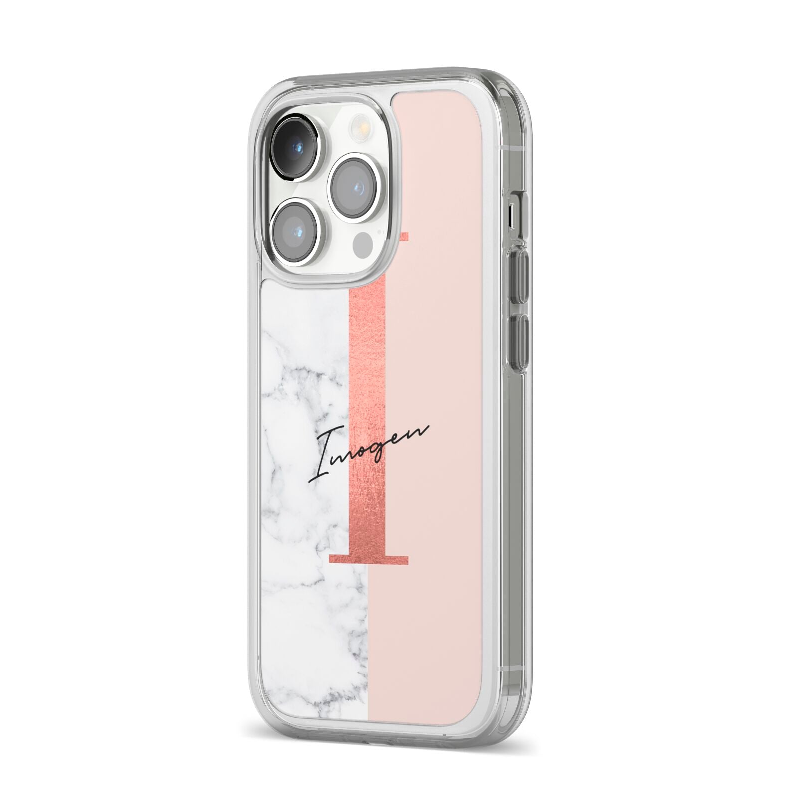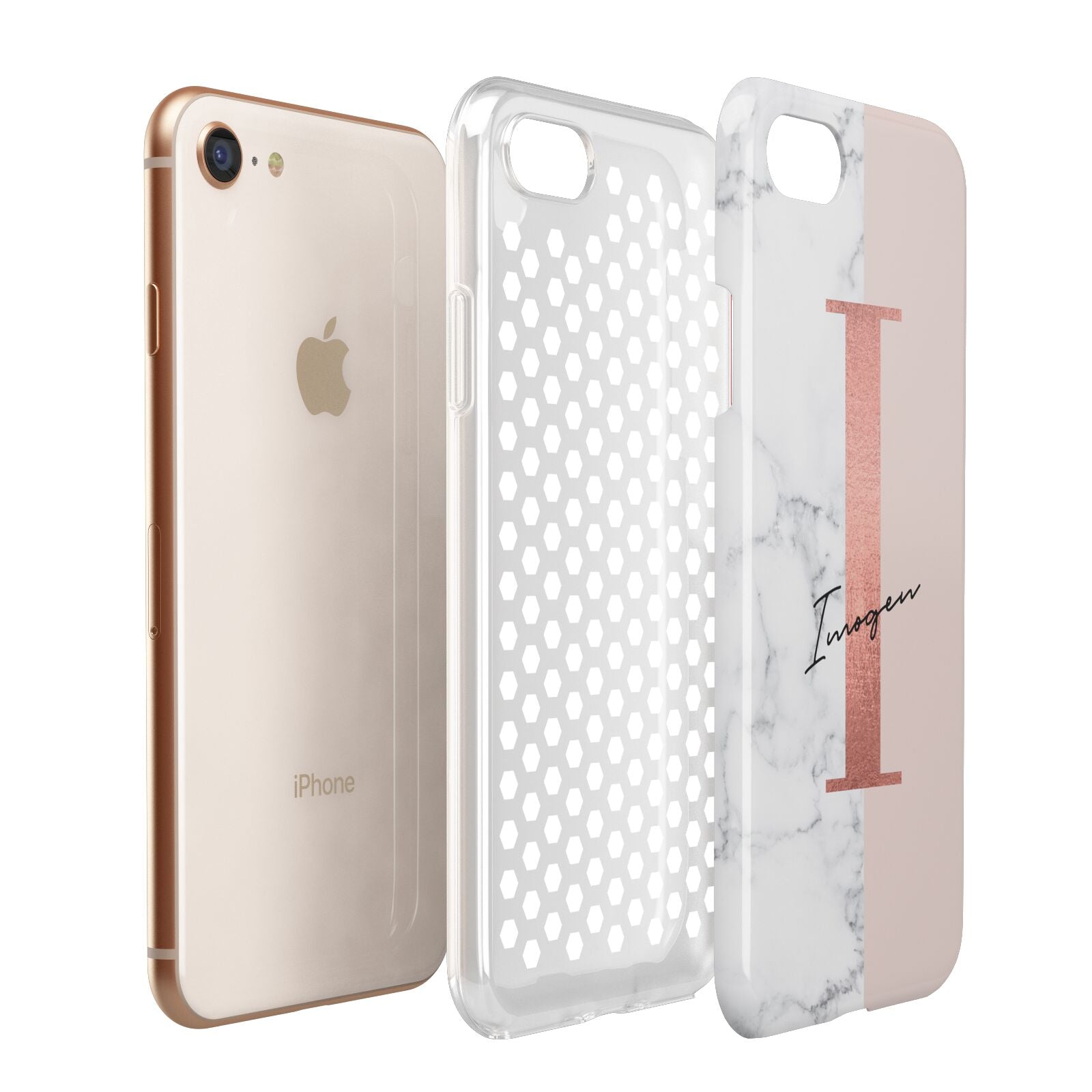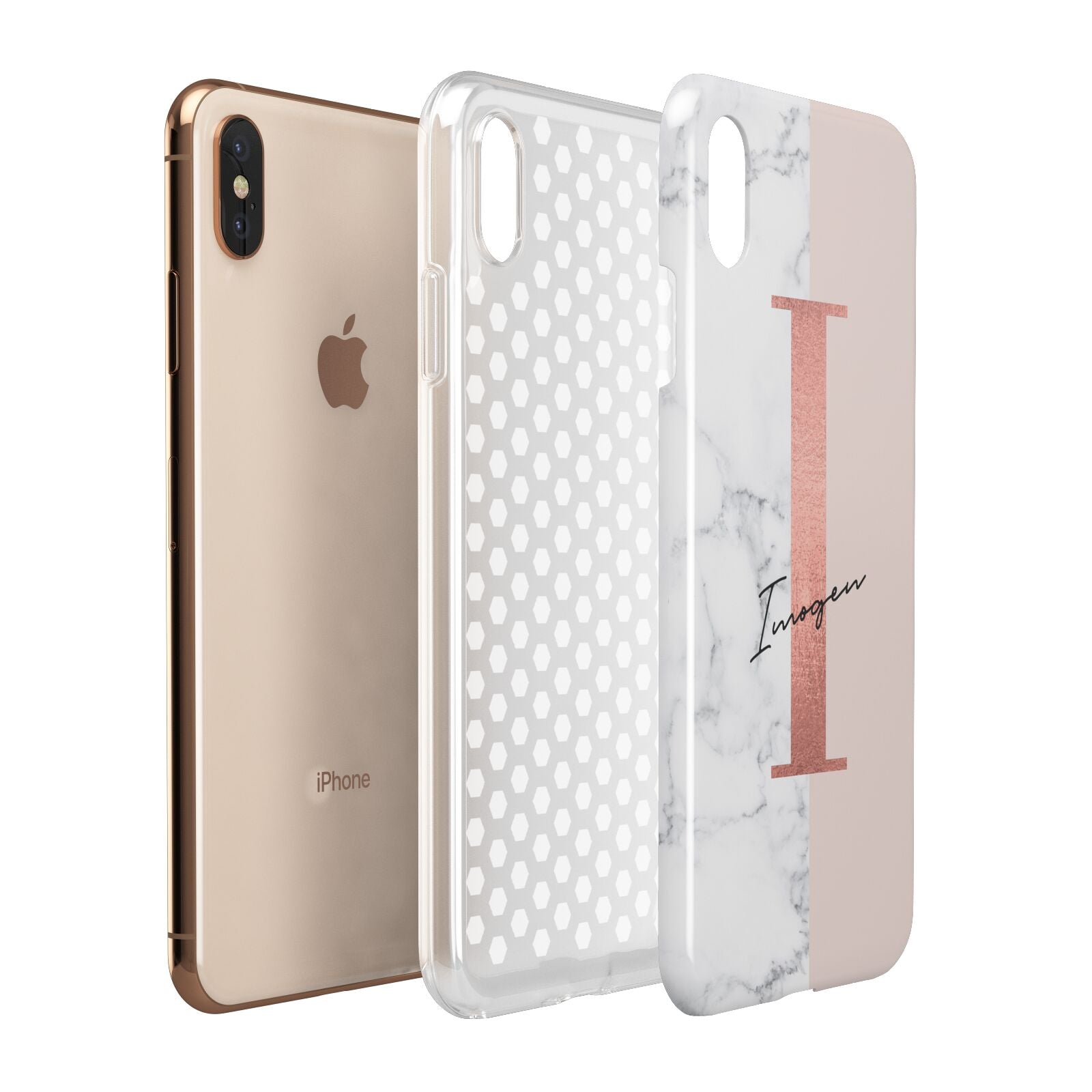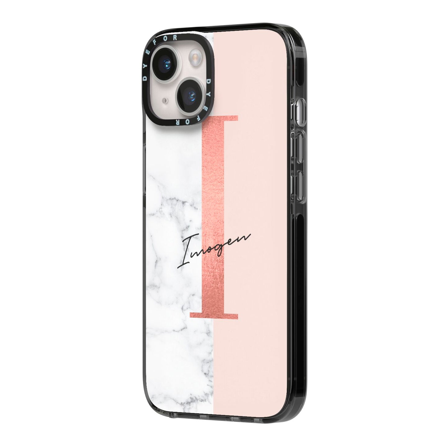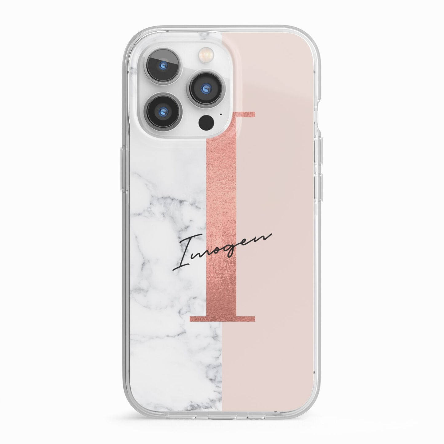 This Monogrammed Rose Gold Marble Apple iPhone Case is a natural white marble design to the left of the pattern, with a nude pink plain block to the right. In the center we have a large rose gold effect initial, along with a black signature font name.