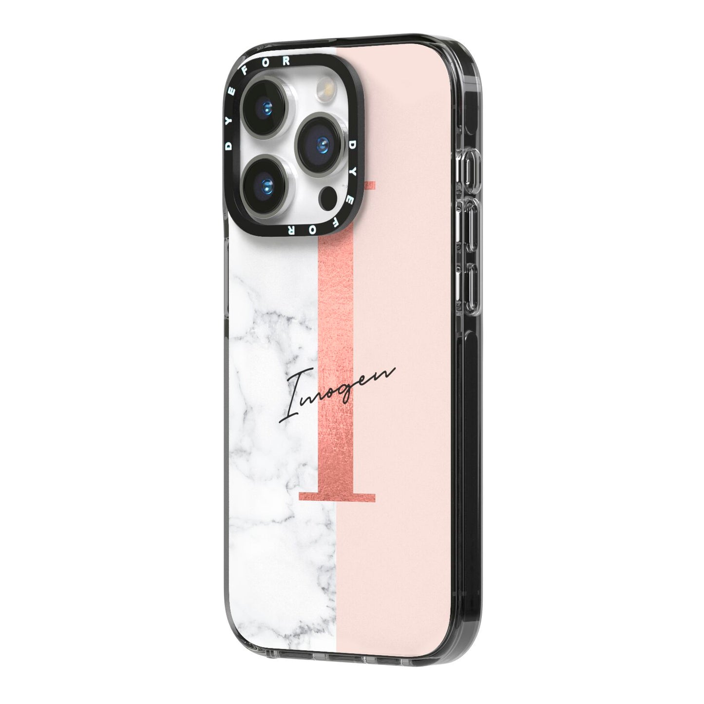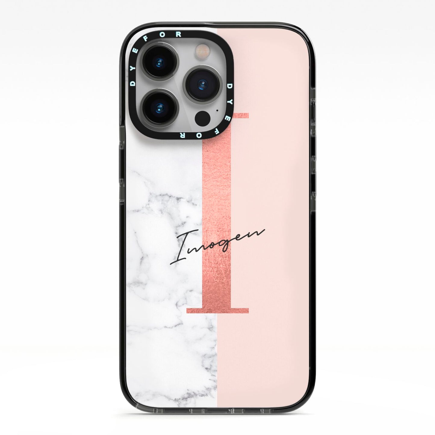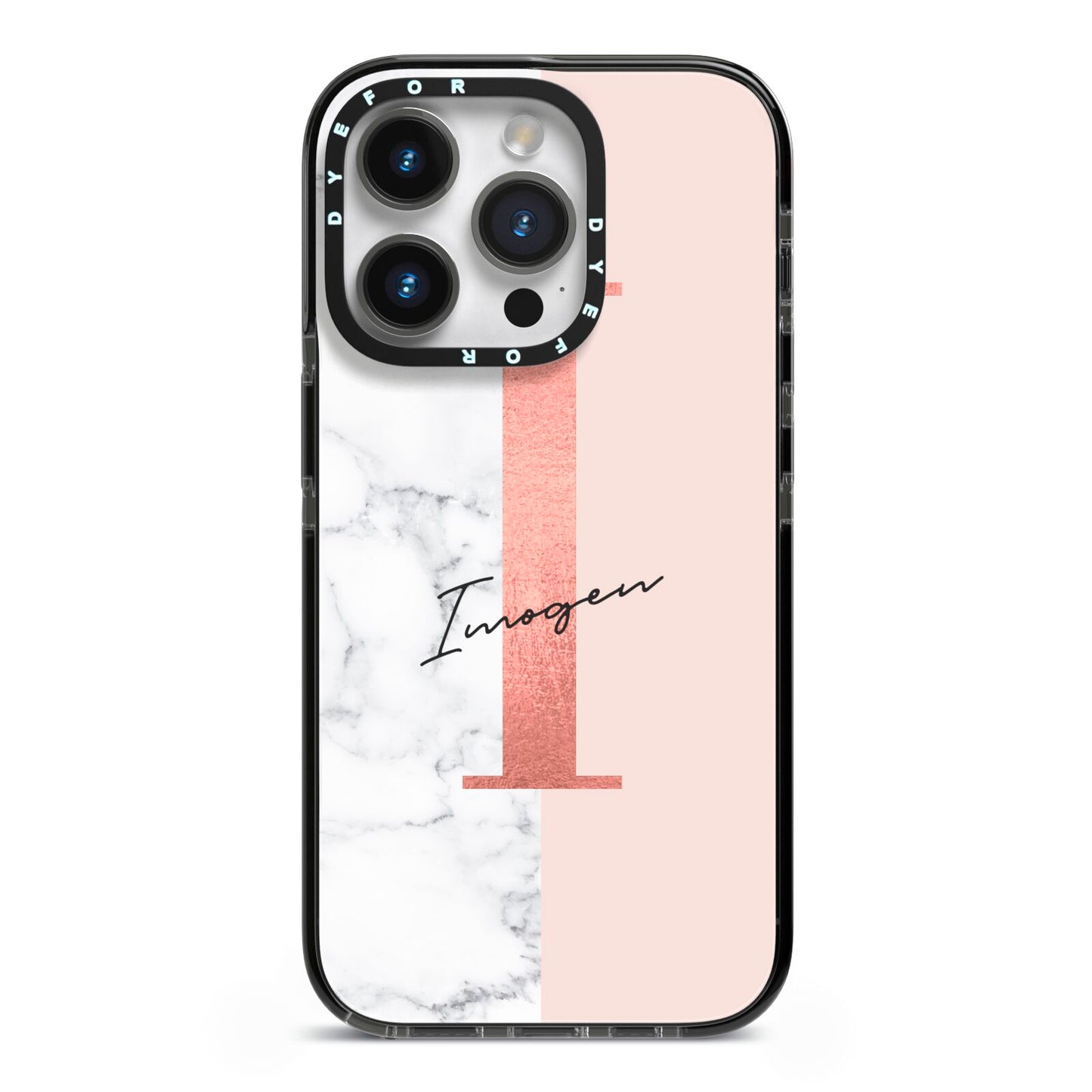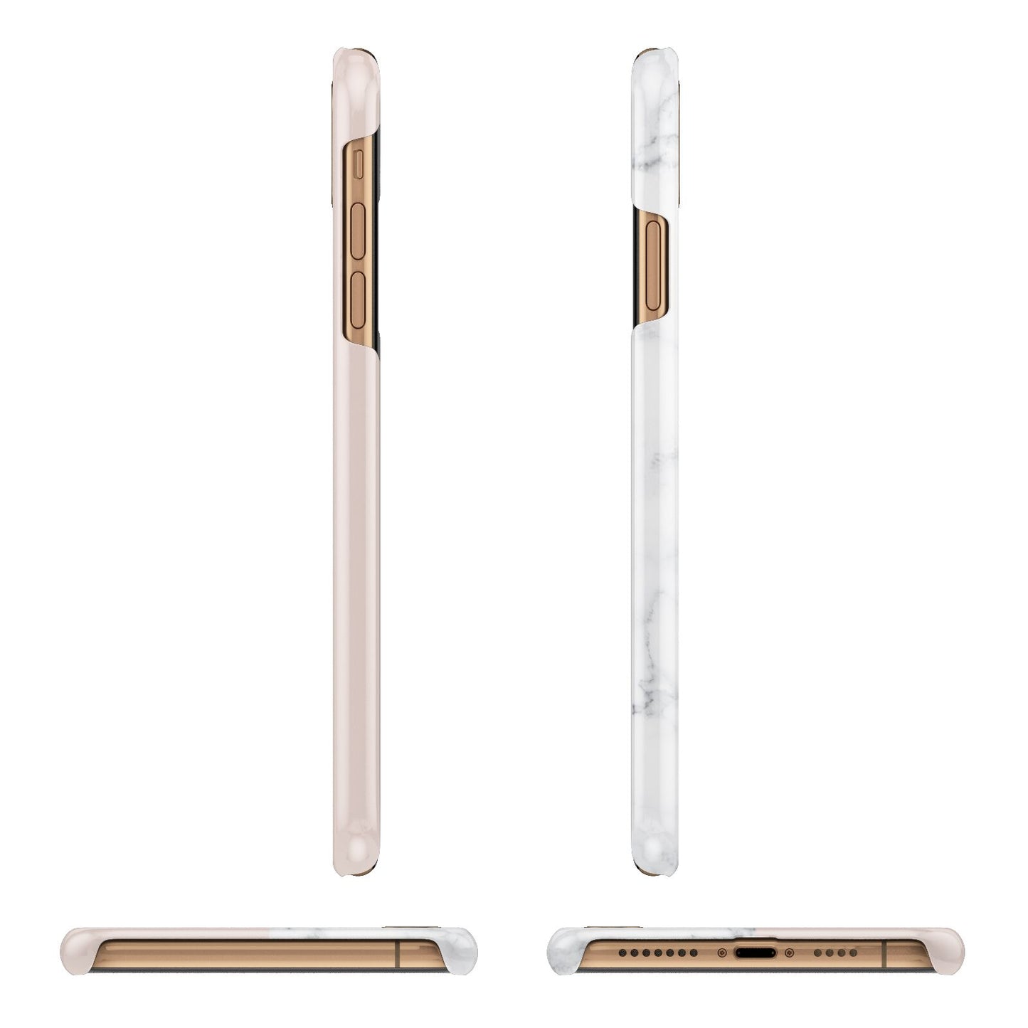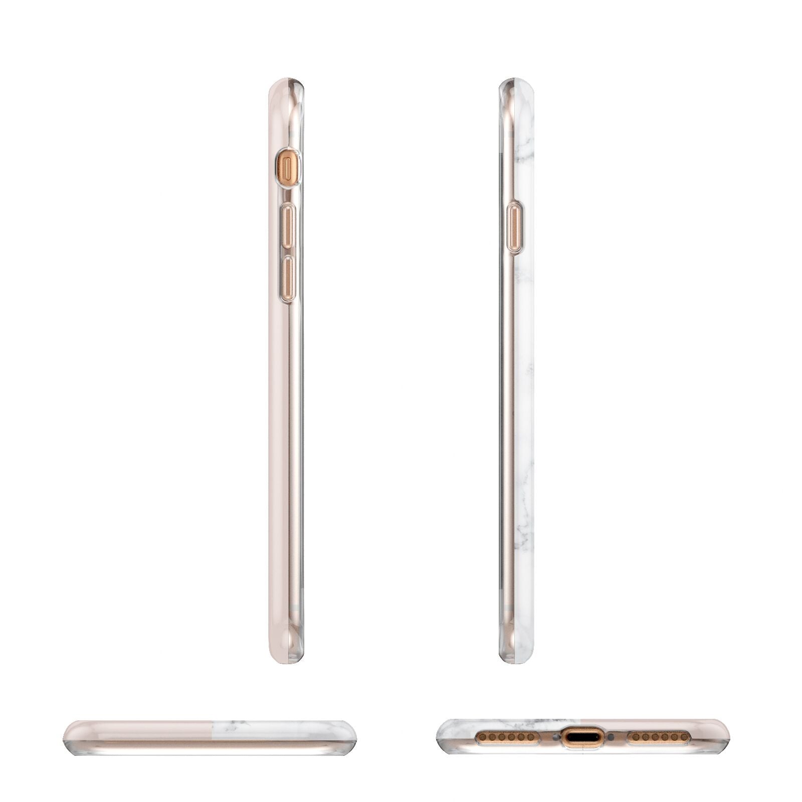 This Monogrammed Rose Gold Marble Apple iPhone Case is a natural white marble design to the left of the pattern, with a nude pink plain block to the right. In the center we have a large rose gold effect initial, along with a black signature font name.