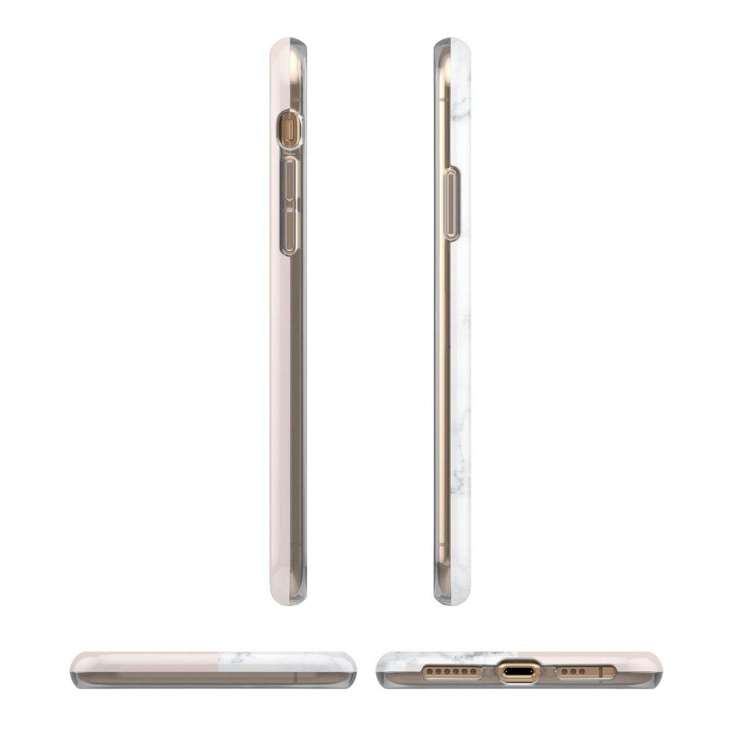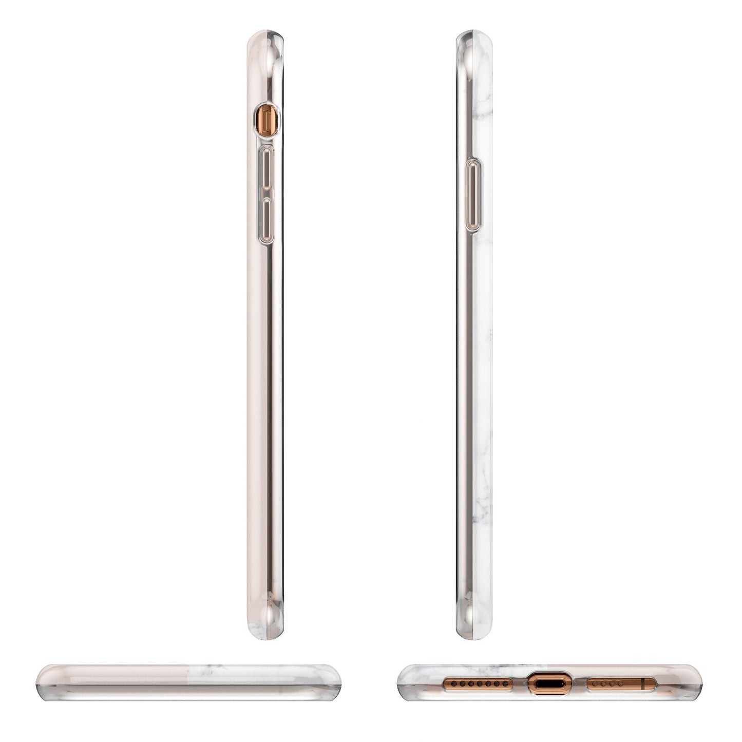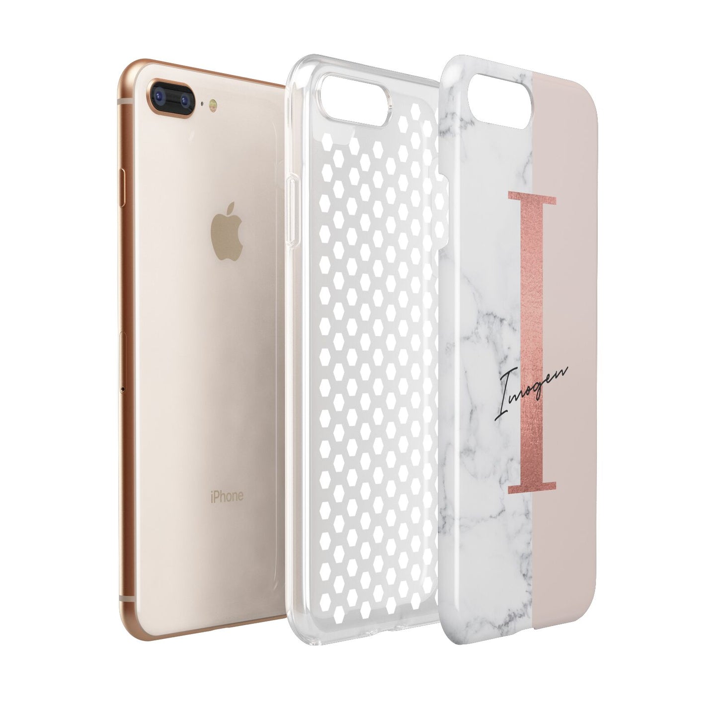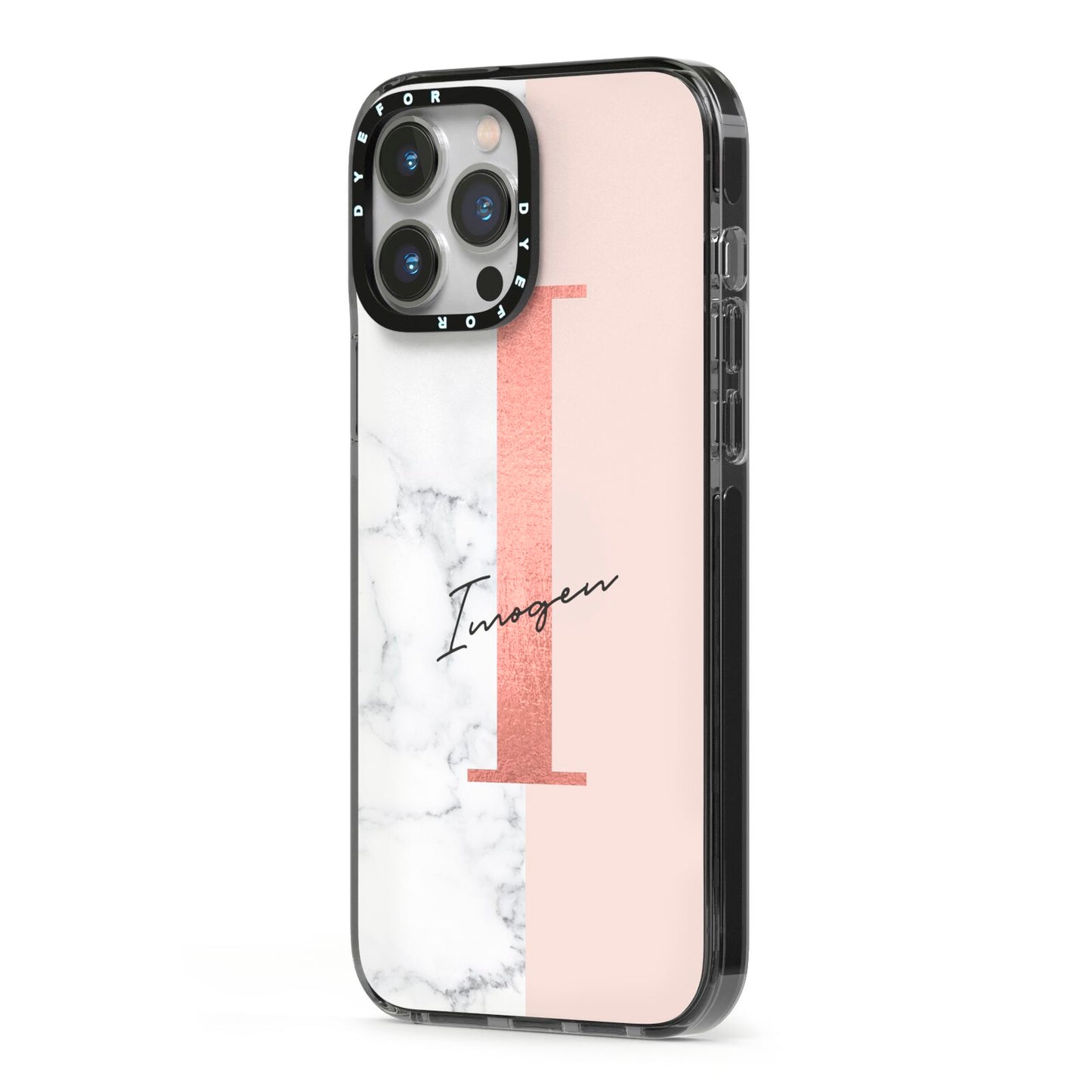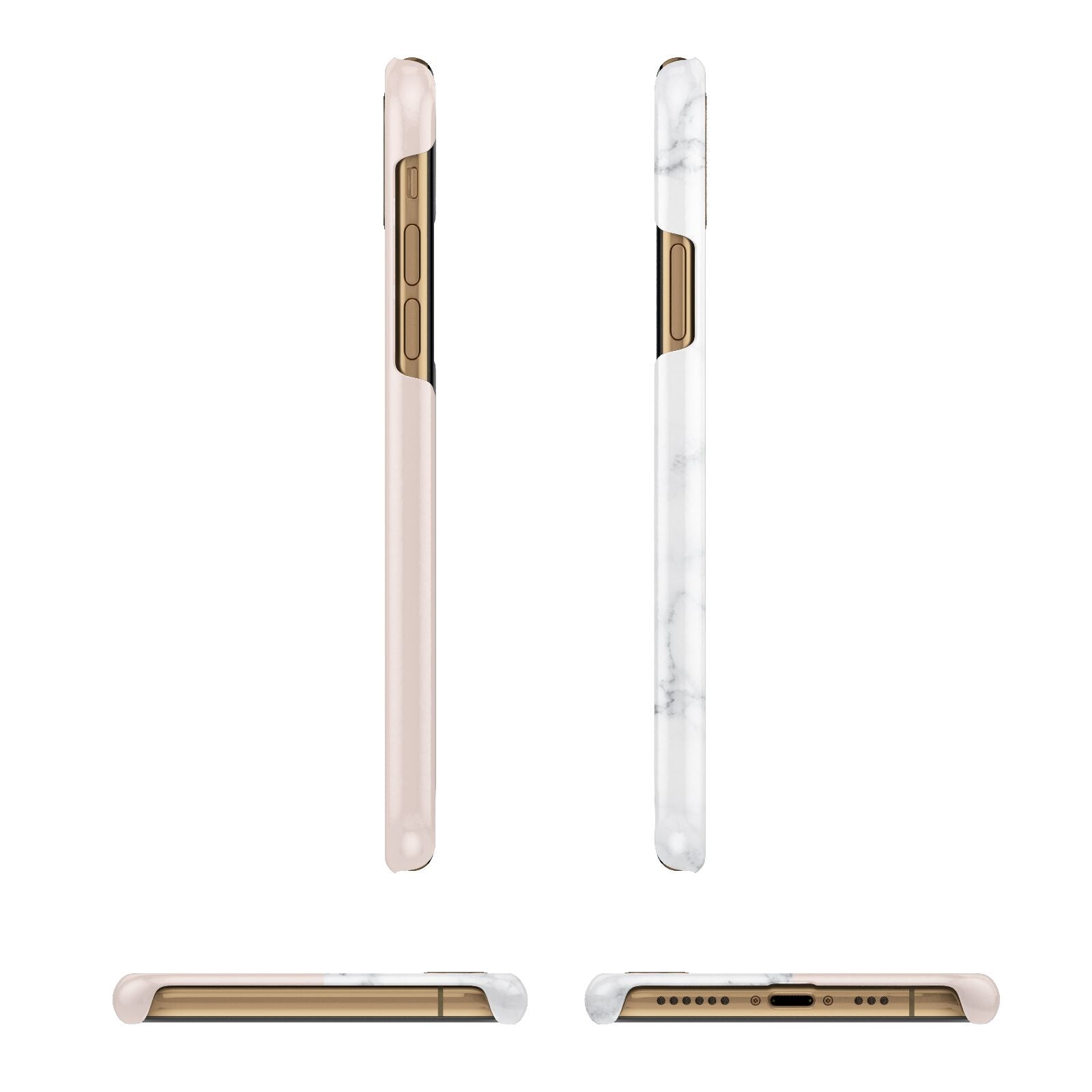 This Monogrammed Rose Gold Marble Apple iPhone Case is a natural white marble design to the left of the pattern, with a nude pink plain block to the right. In the center we have a large rose gold effect initial, along with a black signature font name.