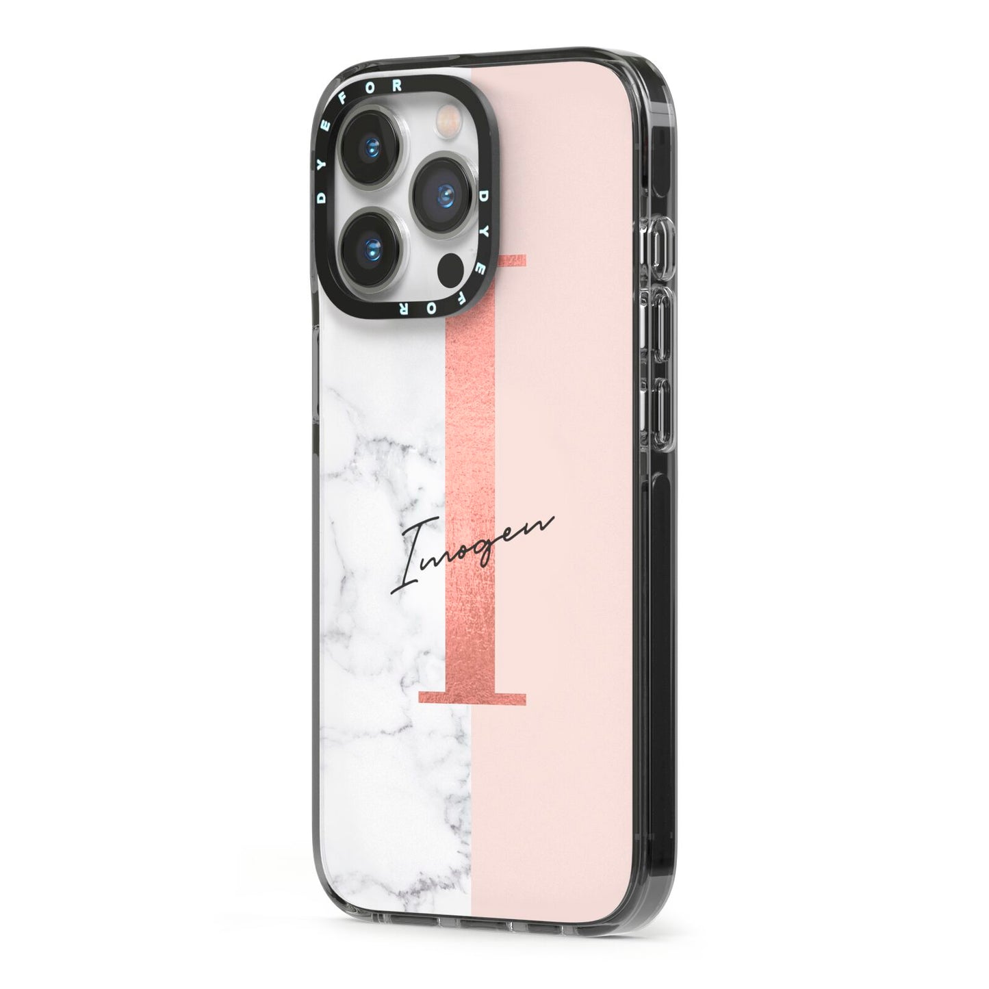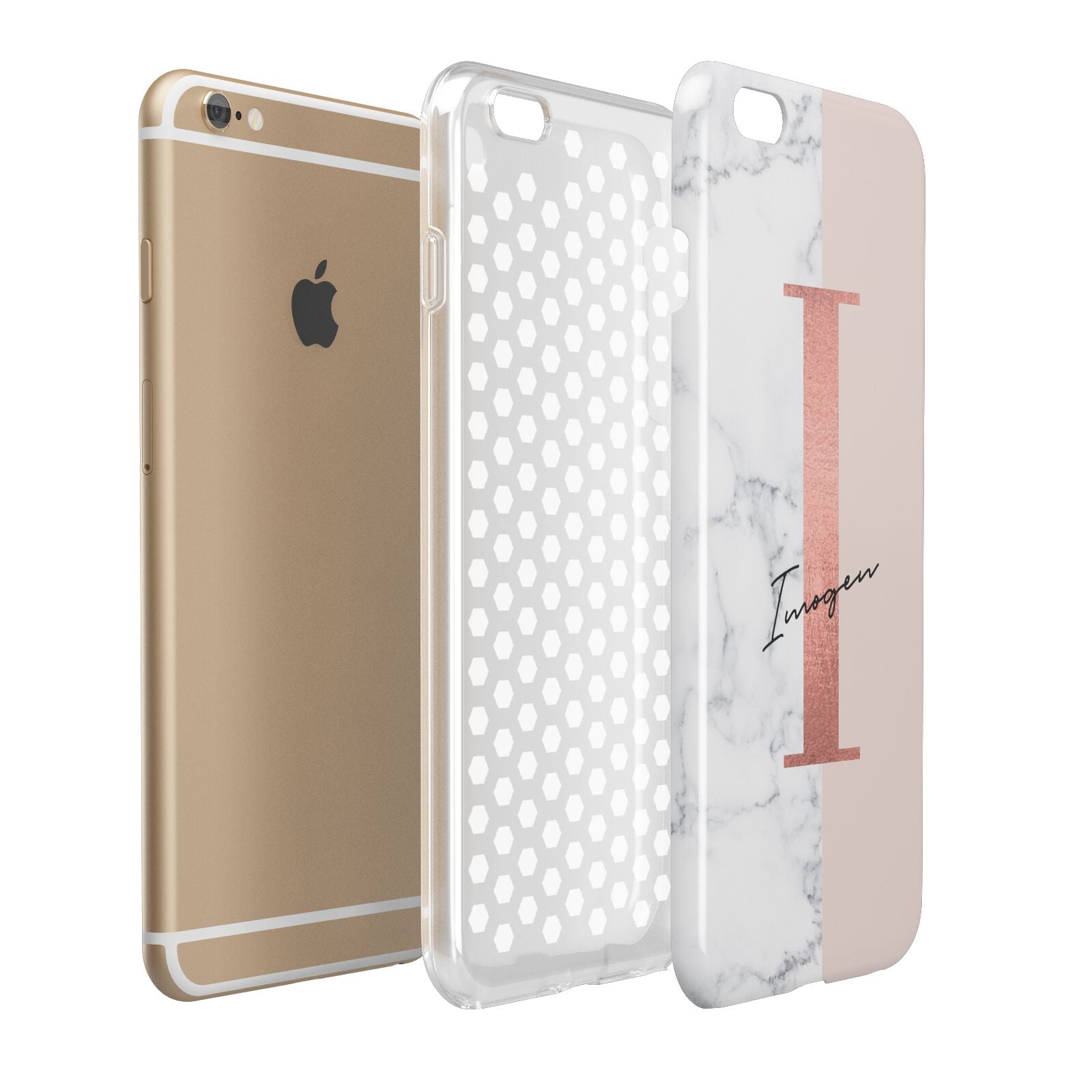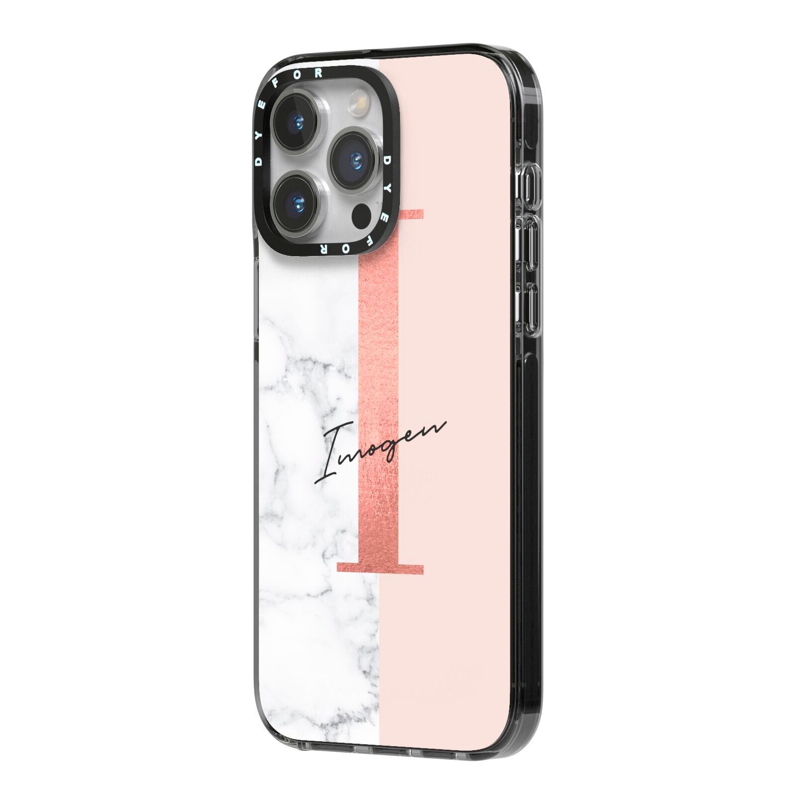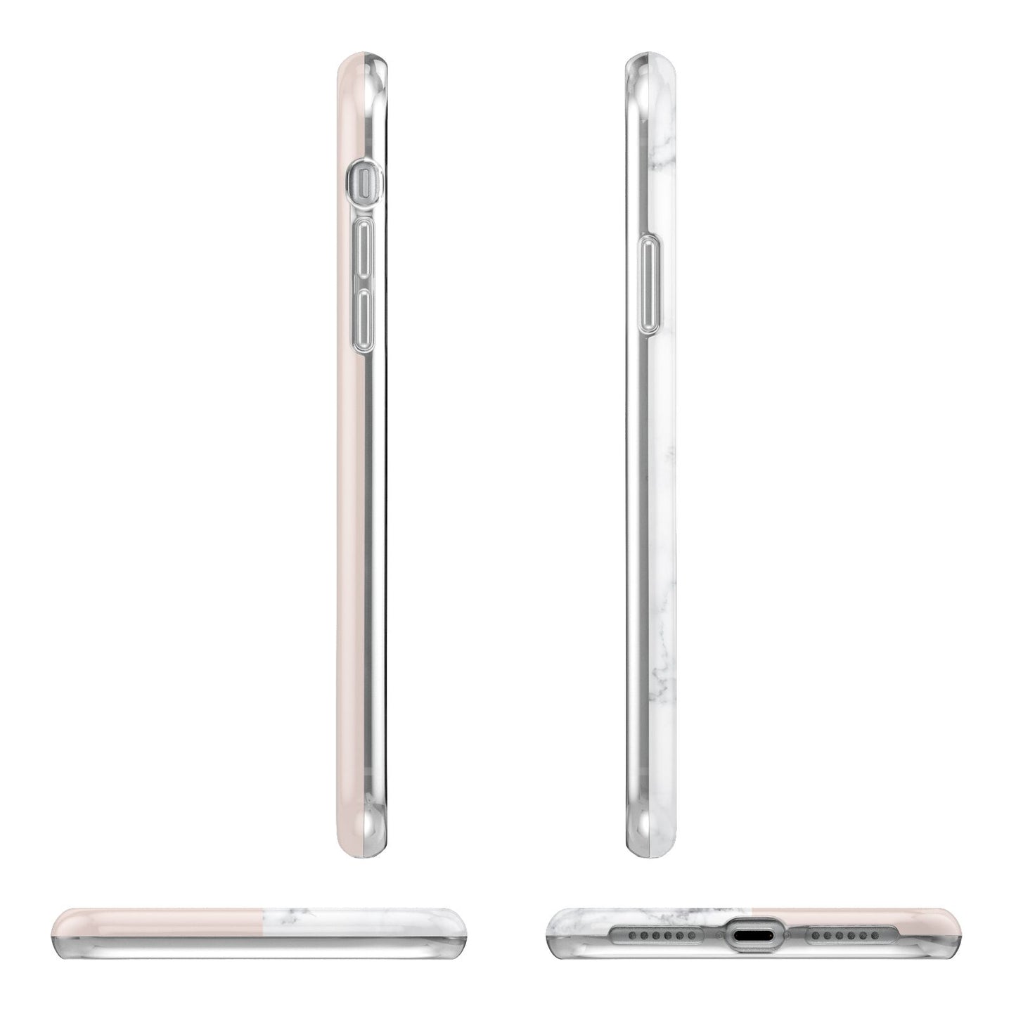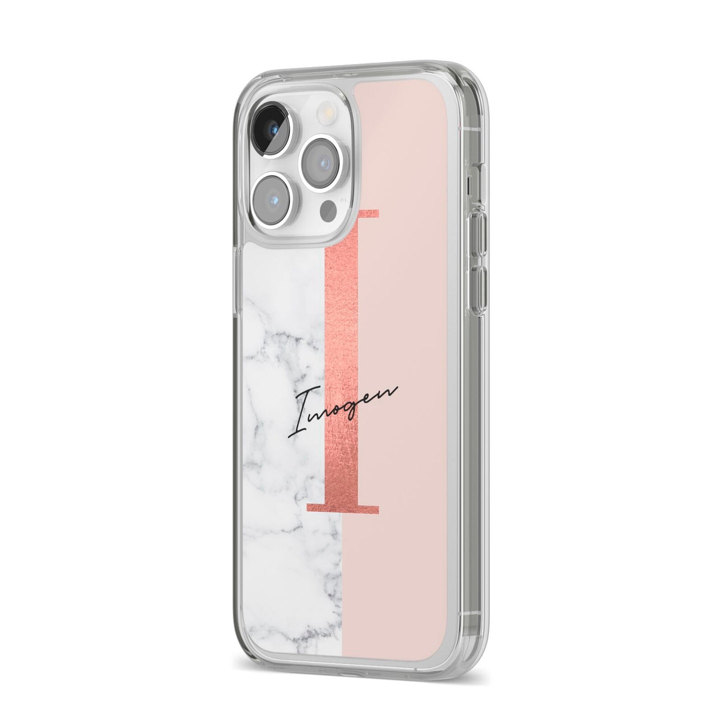 This Monogrammed Rose Gold Marble Apple iPhone Case is a natural white marble design to the left of the pattern, with a nude pink plain block to the right. In the center we have a large rose gold effect initial, along with a black signature font name.