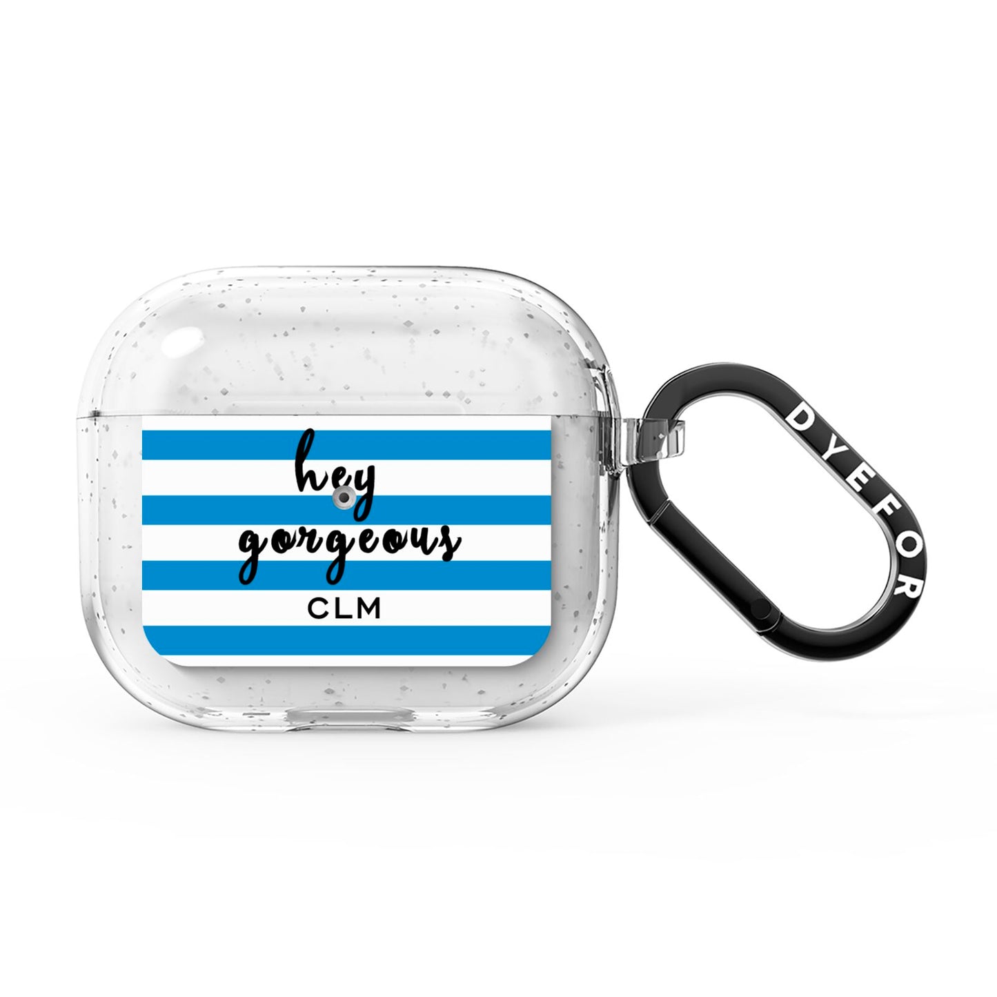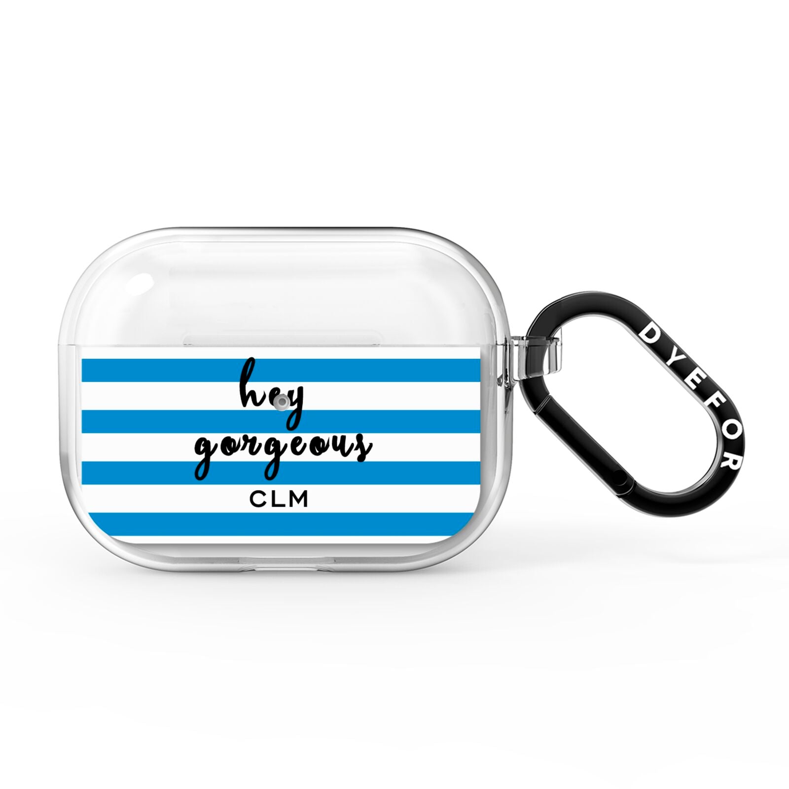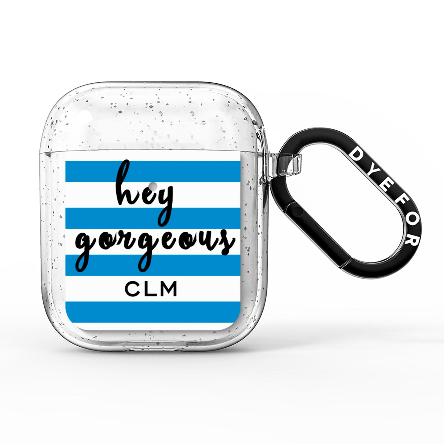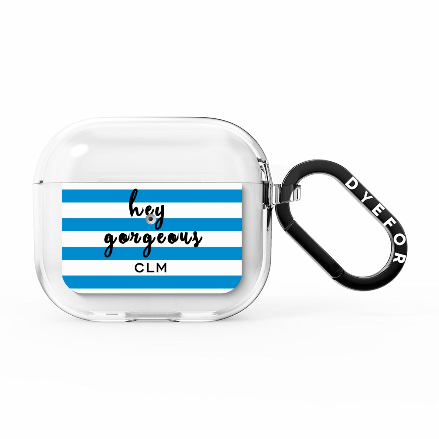This Personalised Blue Hey Gorgeous AirPods Case is a blue and white striped design, with the hey gorgeous text in black scroll font. To the bottom of the design we have three initials in black for you to personalise.