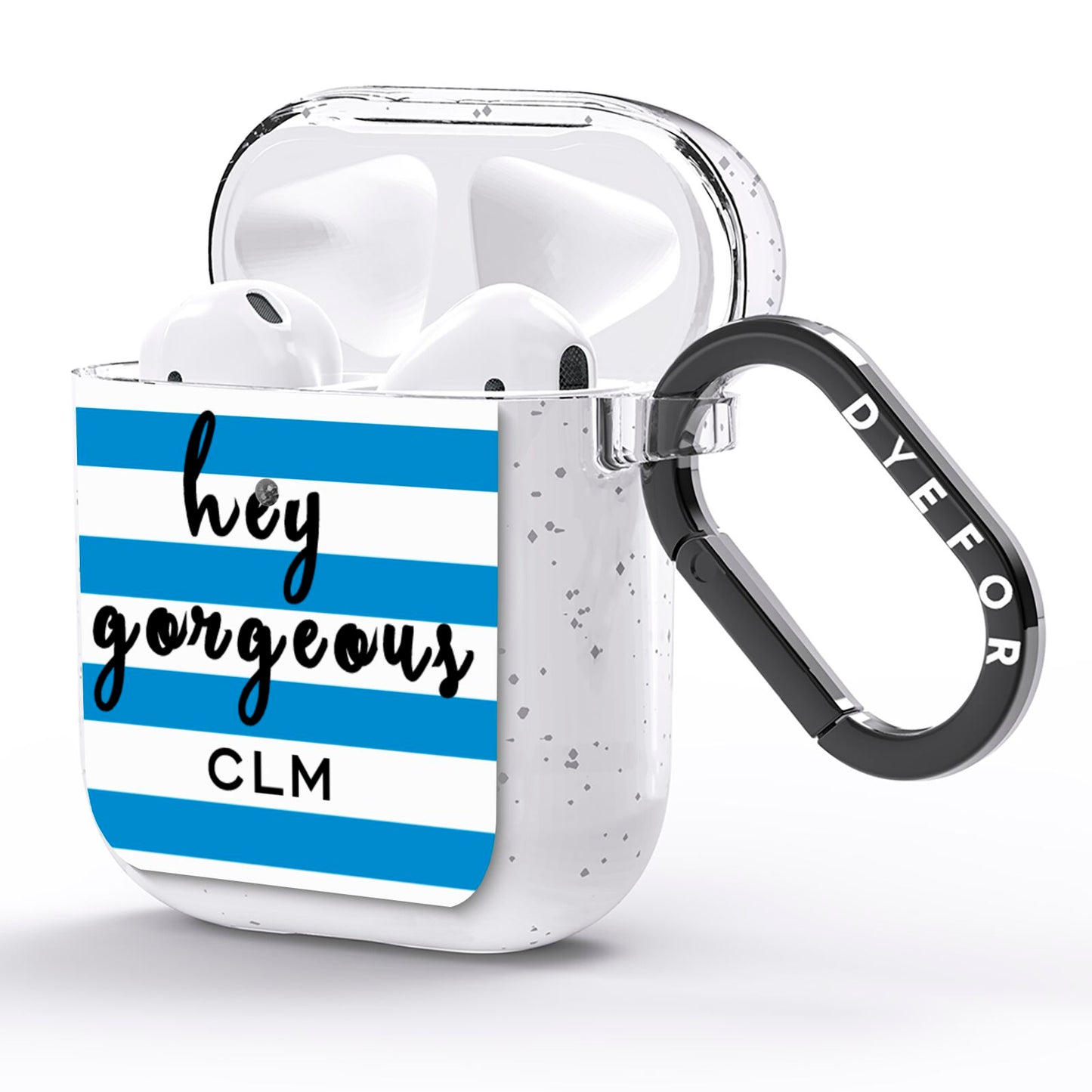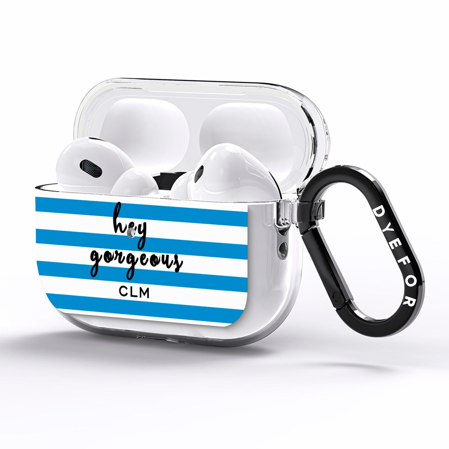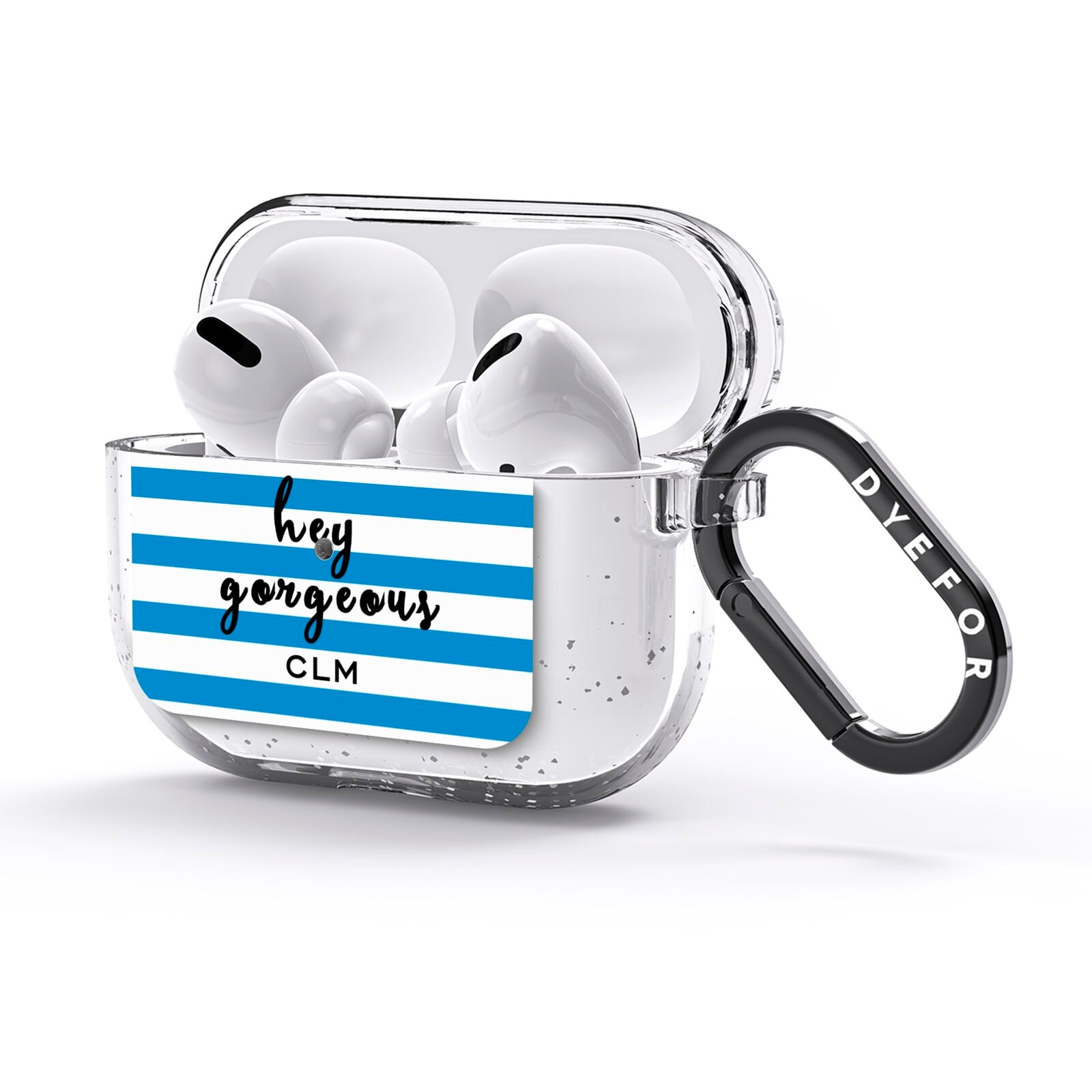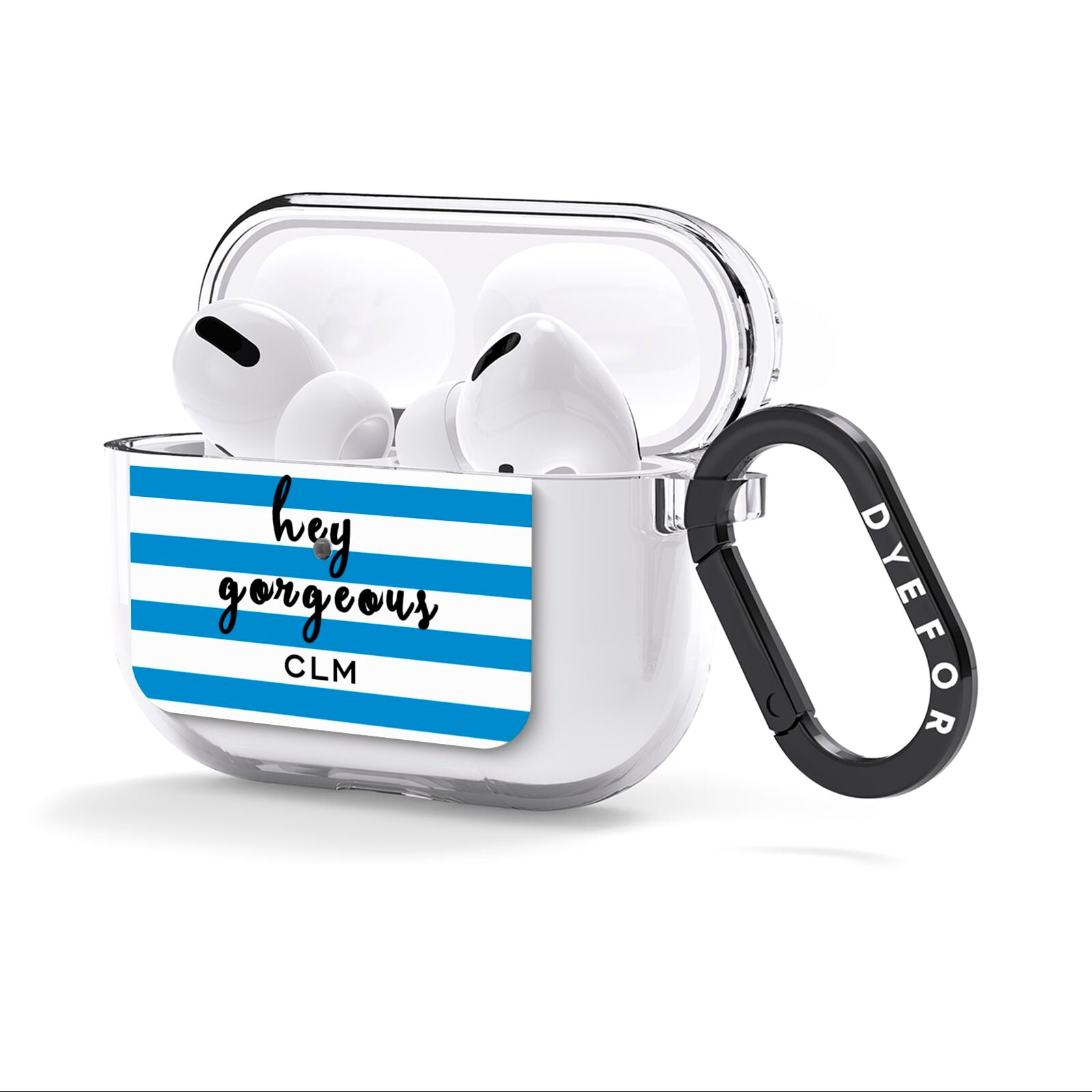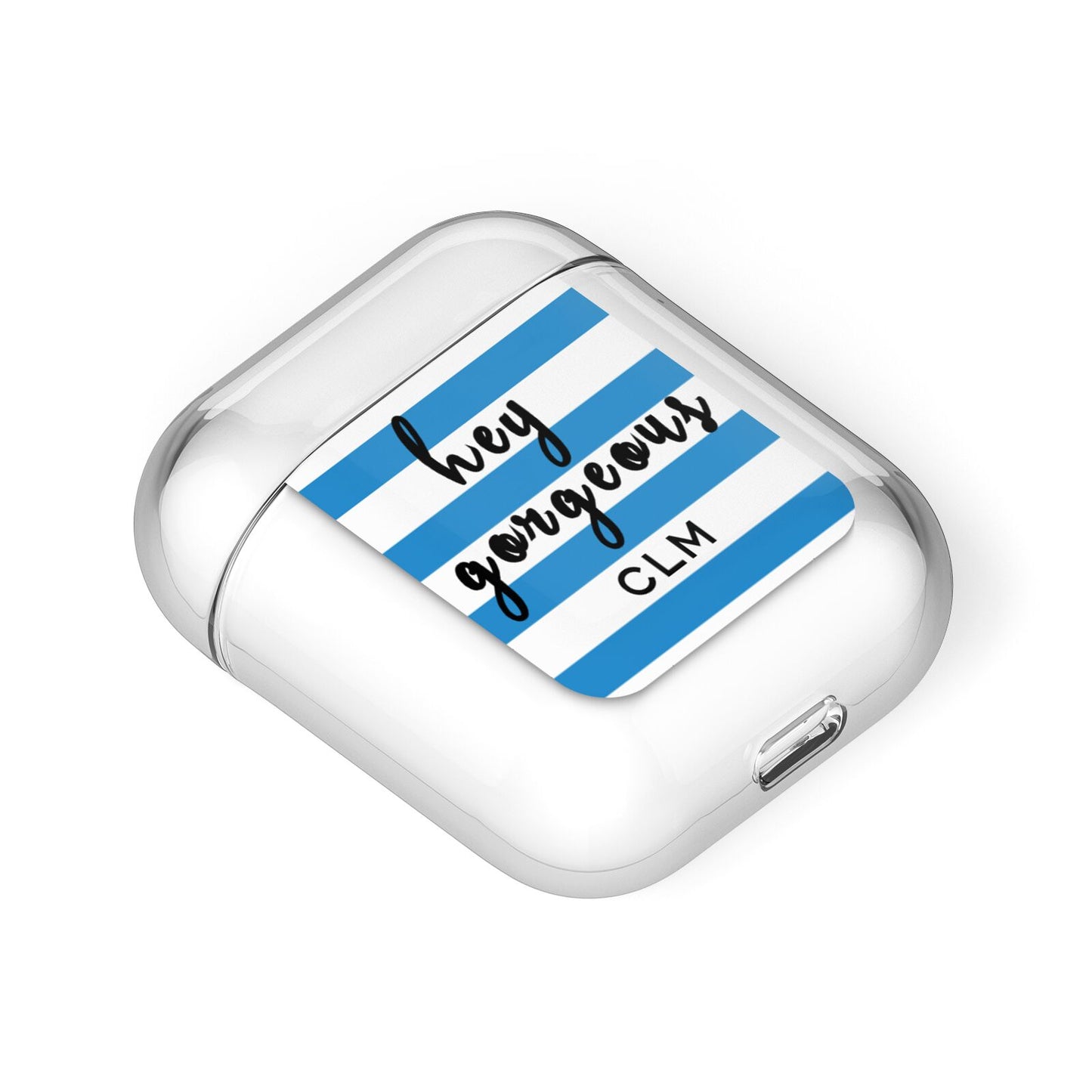 This Personalised Blue Hey Gorgeous AirPods Case is a blue and white striped design, with the hey gorgeous text in black scroll font. To the bottom of the design we have three initials in black for you to personalise.