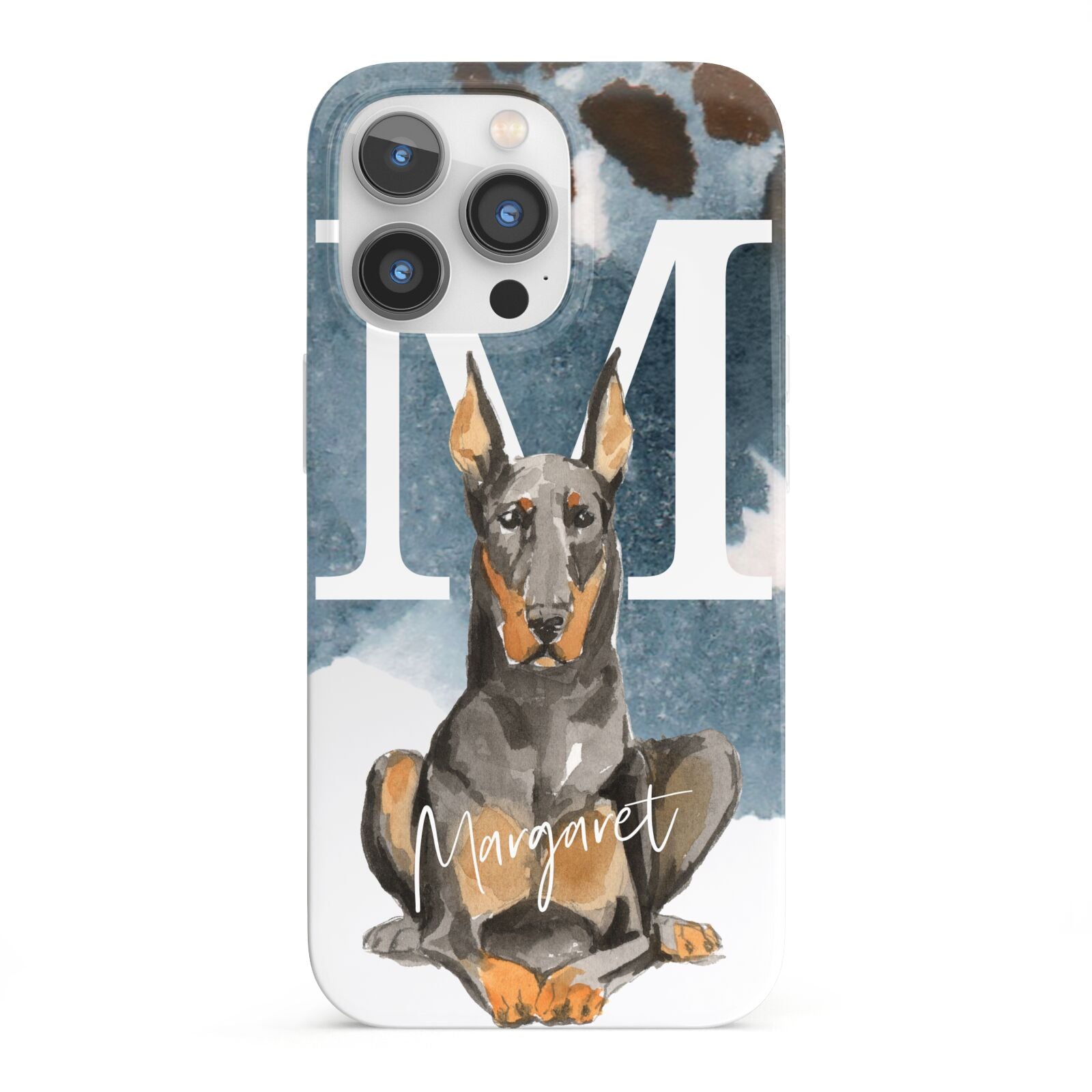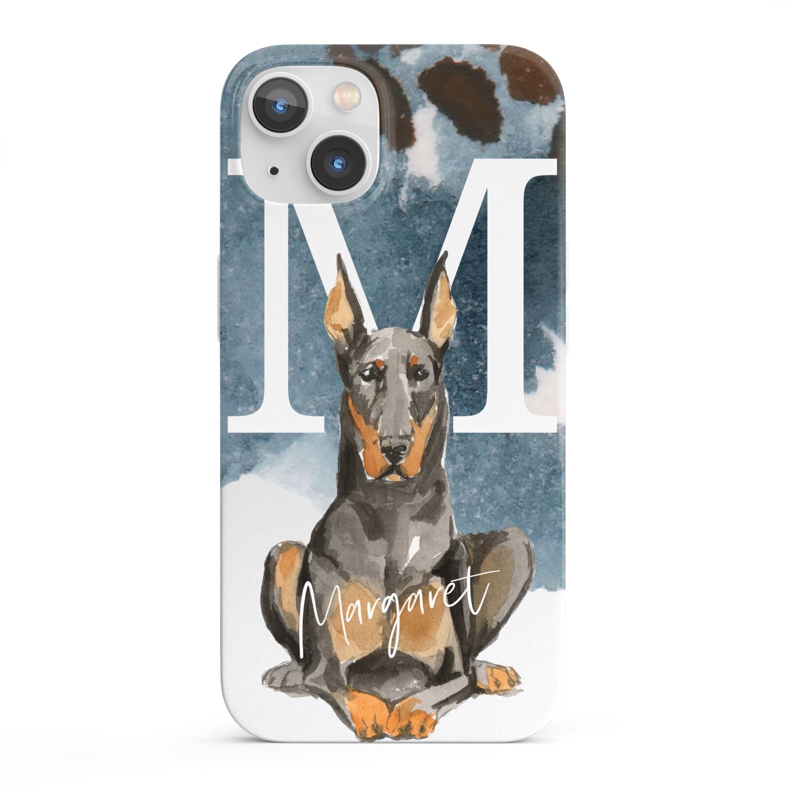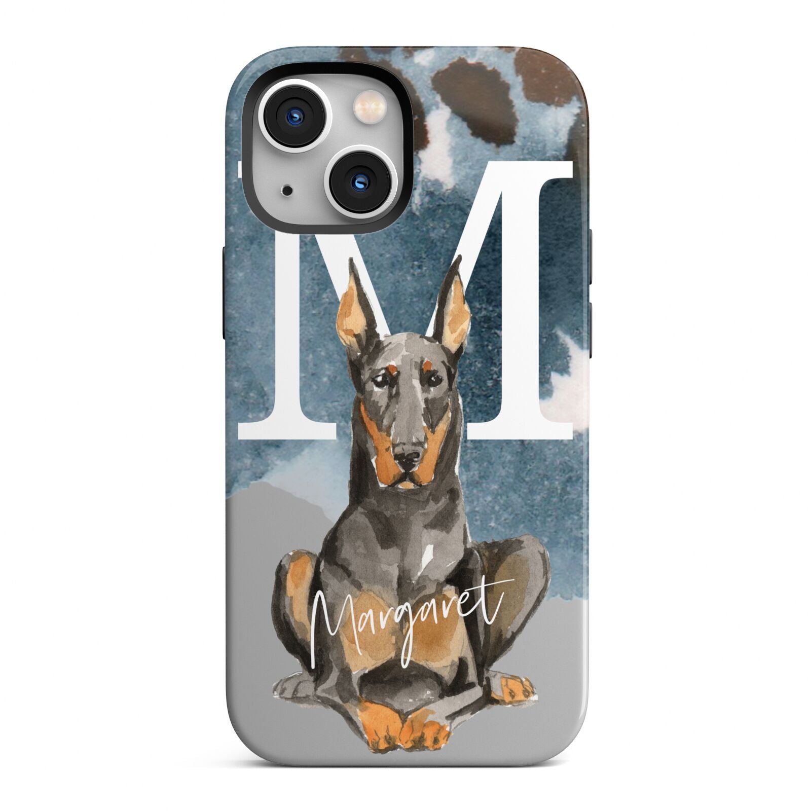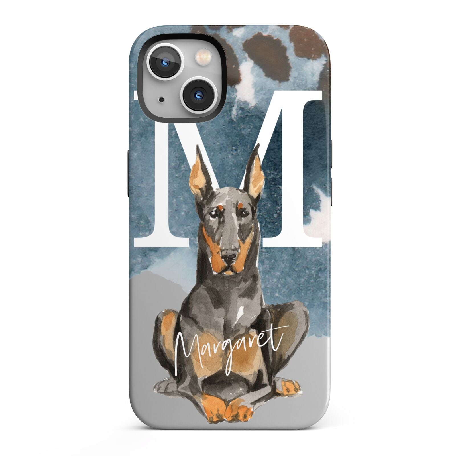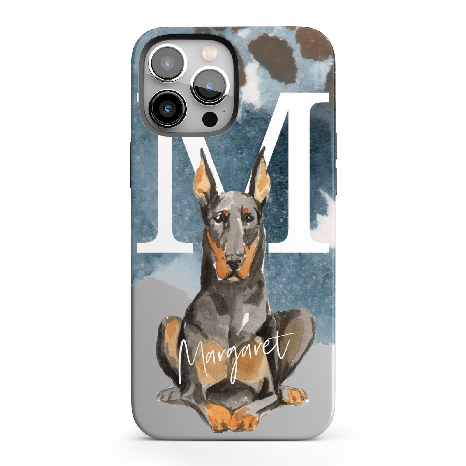 This great Personalised Doberman Dog Apple iPhone Case is a watercolour illustration of a doberman dog, set against a dark blue backdrop. This design can be customised with a large monogram, and a name. This great design is ideal for any dog lover, or for someone with a pet doberman. This pattern is great to personalise and is available across a number of our products.