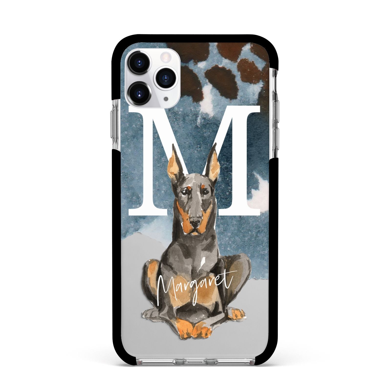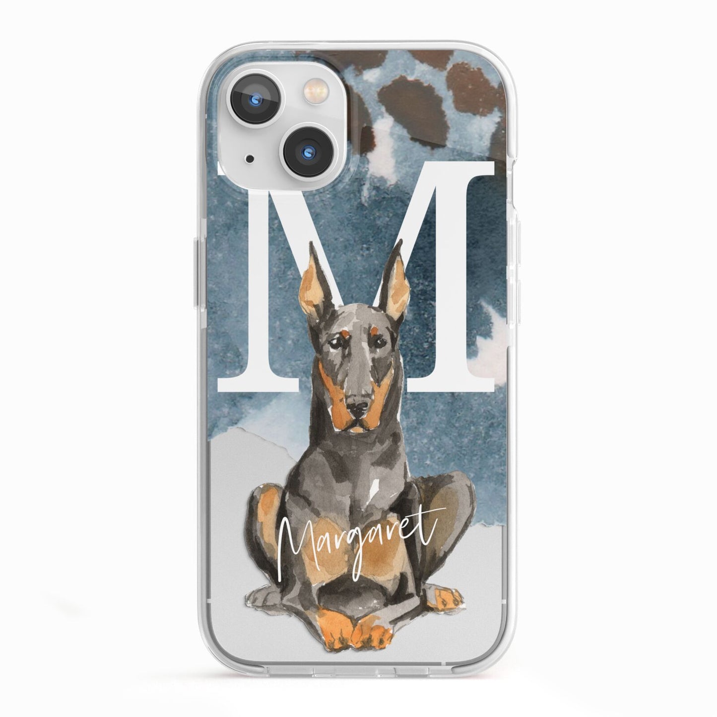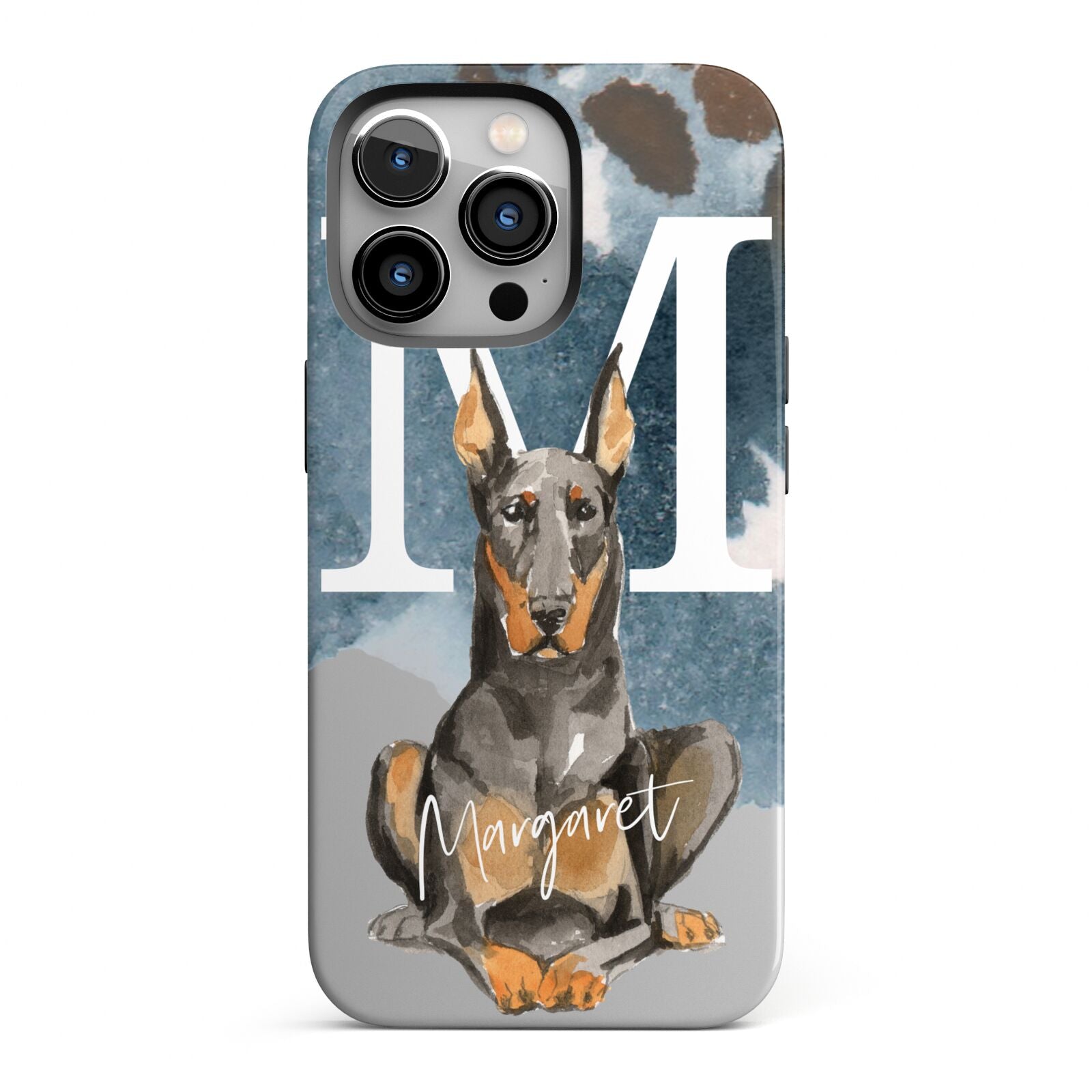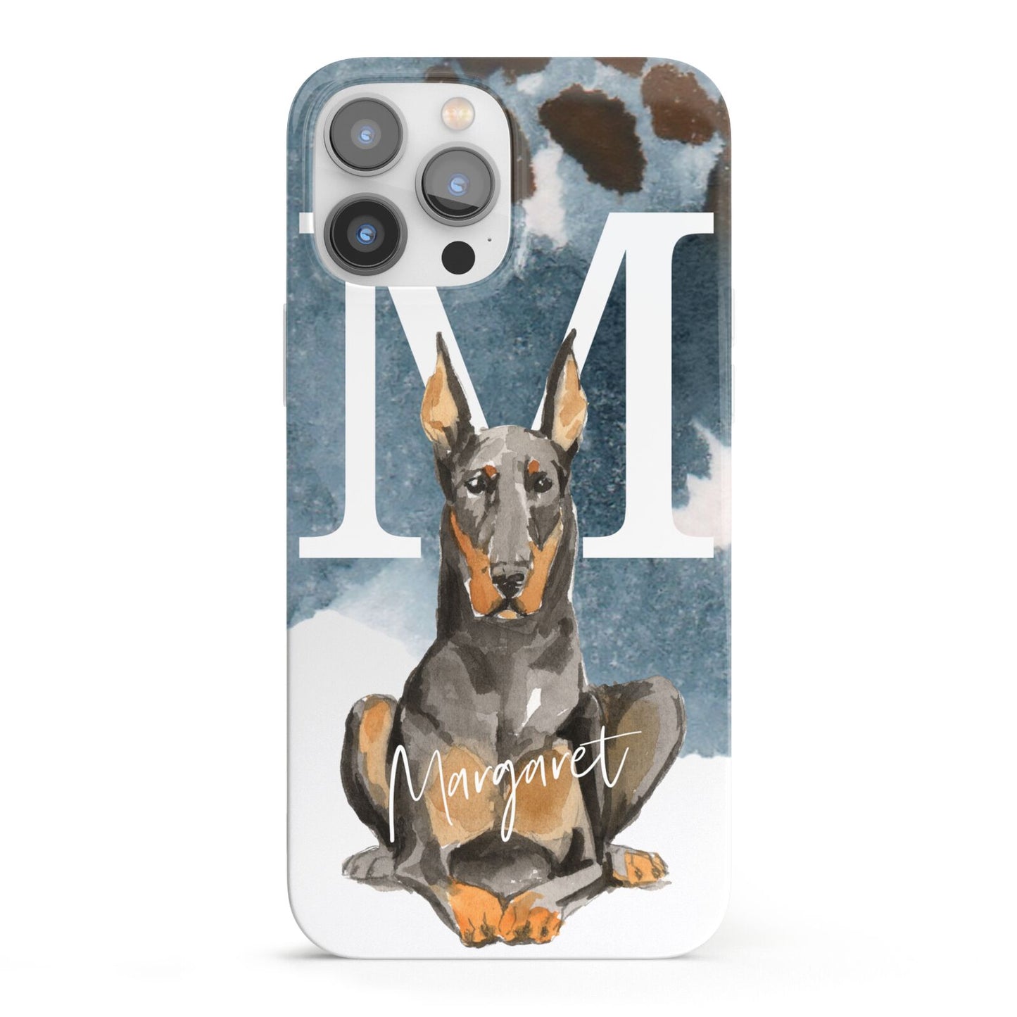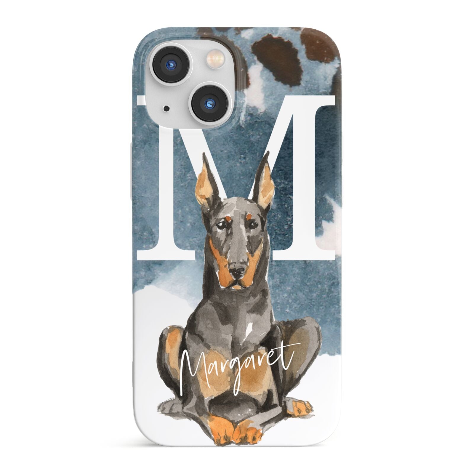 This great Personalised Doberman Dog Apple iPhone Case is a watercolour illustration of a doberman dog, set against a dark blue backdrop. This design can be customised with a large monogram, and a name. This great design is ideal for any dog lover, or for someone with a pet doberman. This pattern is great to personalise and is available across a number of our products.