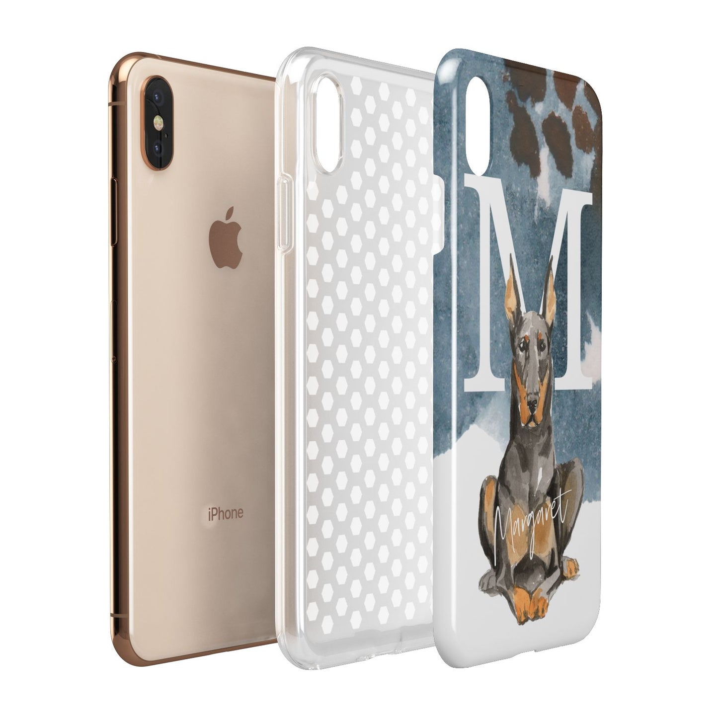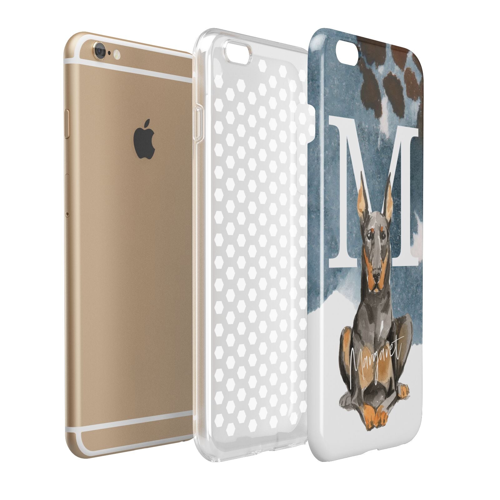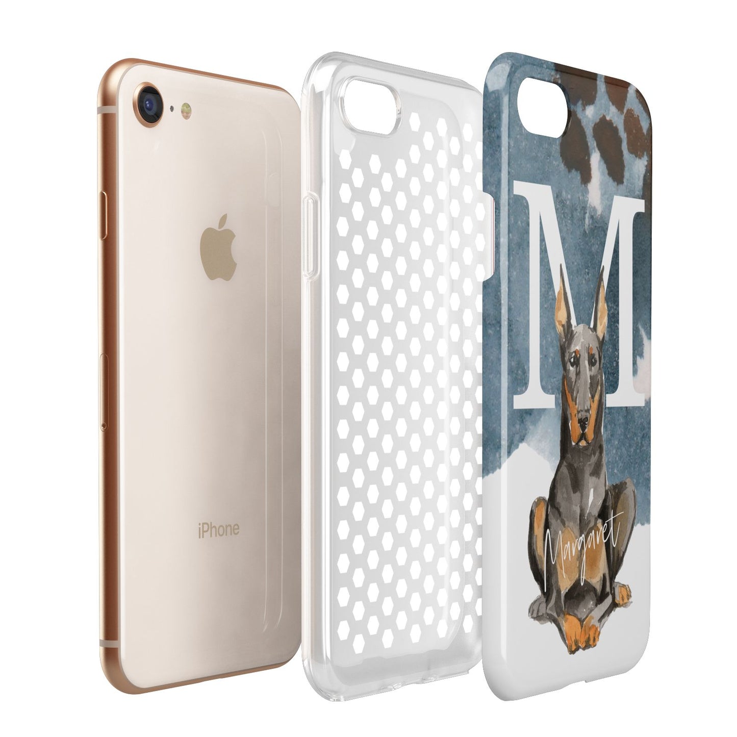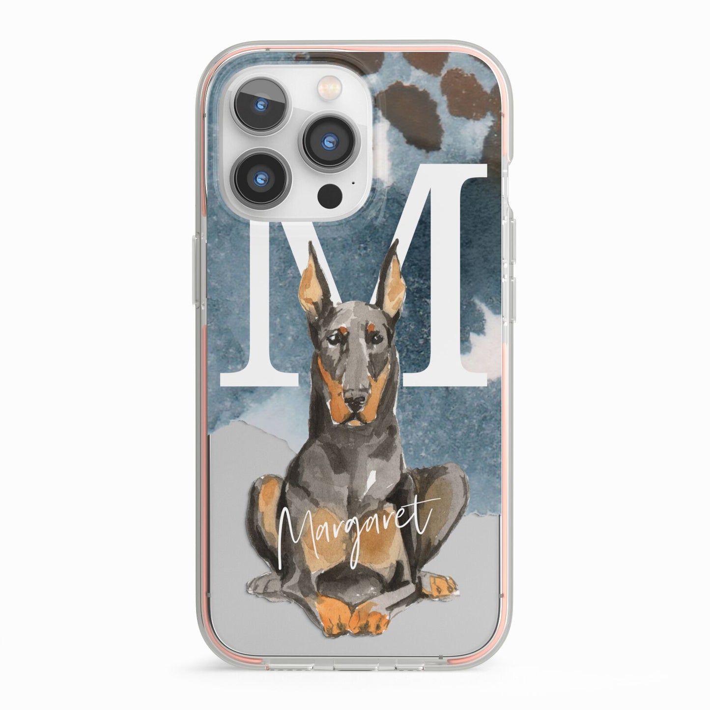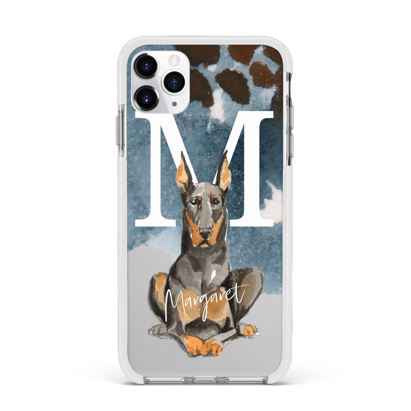 This great Personalised Doberman Dog Apple iPhone Case is a watercolour illustration of a doberman dog, set against a dark blue backdrop. This design can be customised with a large monogram, and a name. This great design is ideal for any dog lover, or for someone with a pet doberman. This pattern is great to personalise and is available across a number of our products.