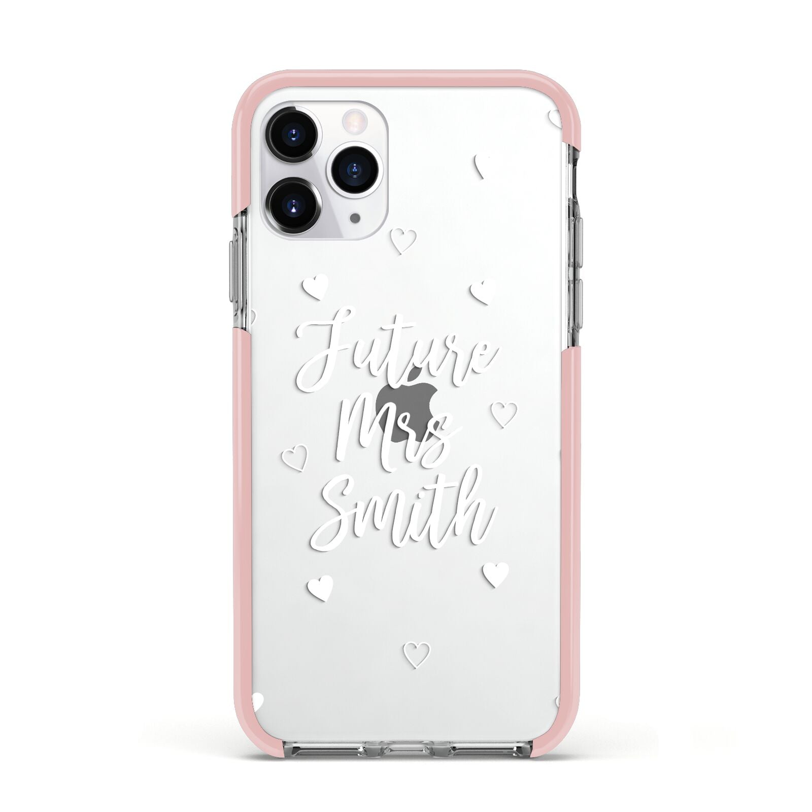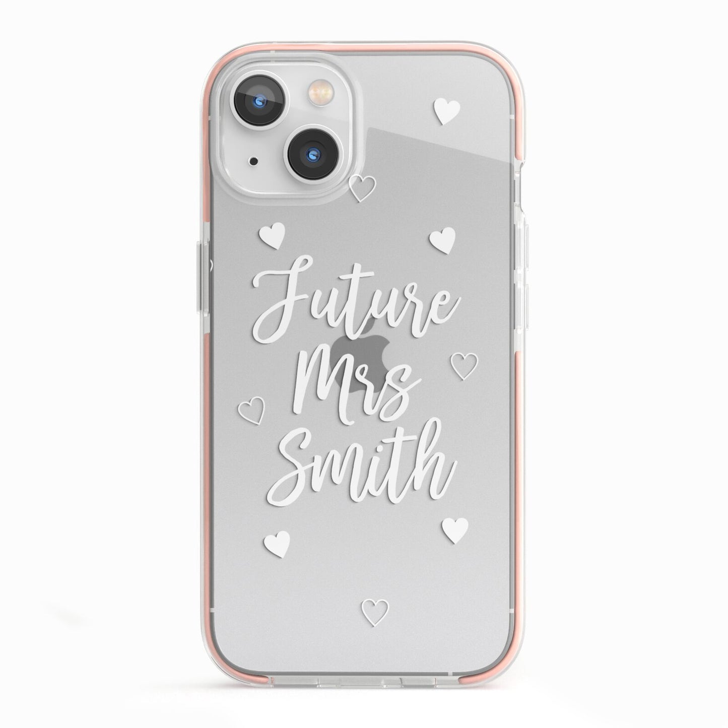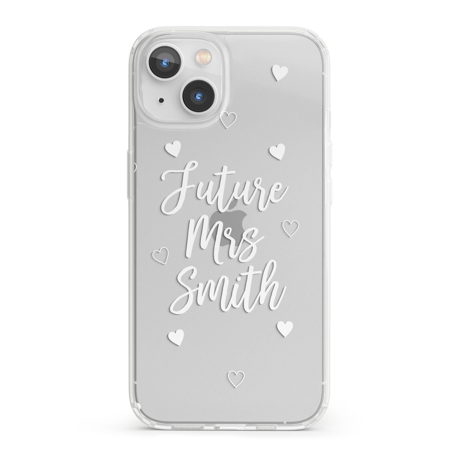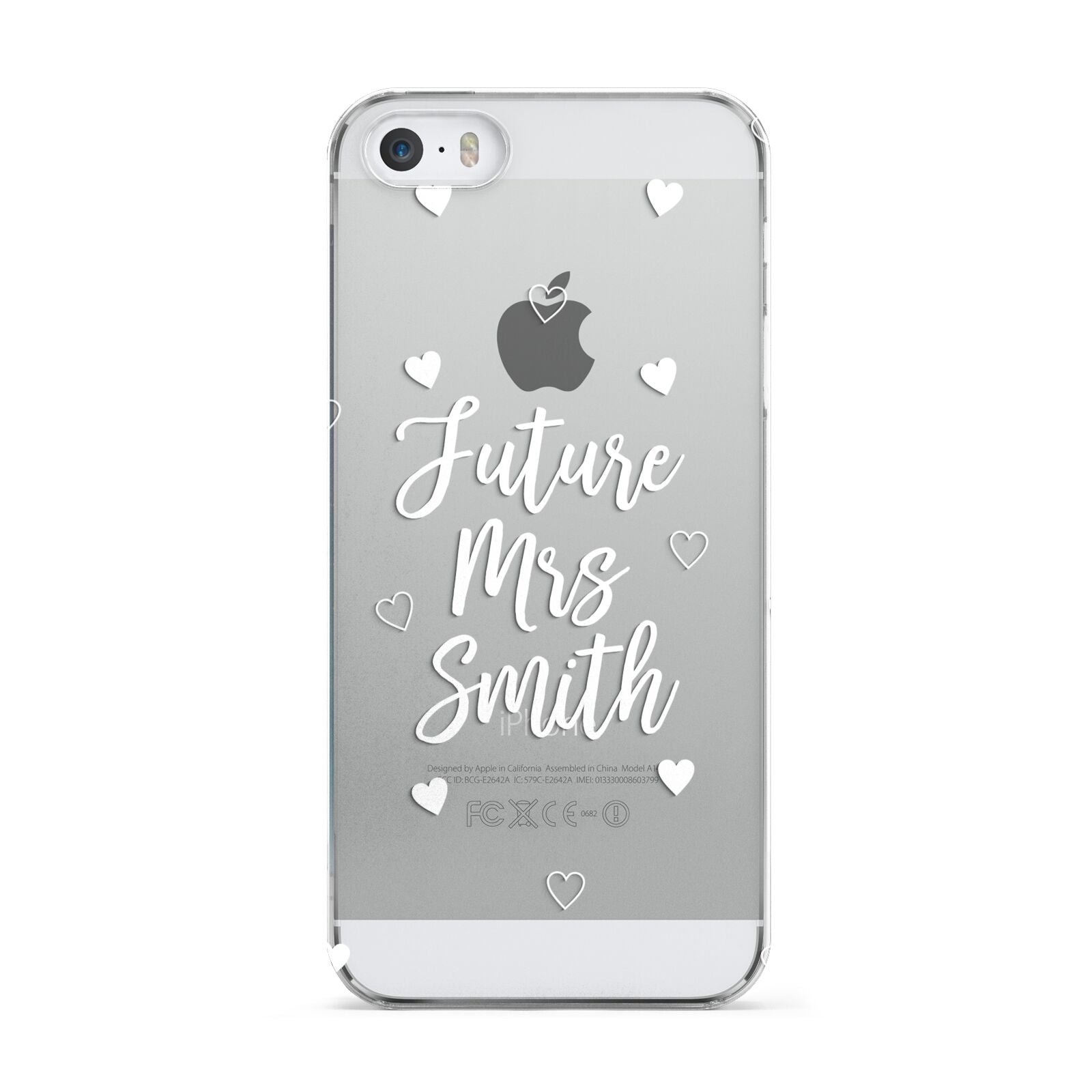 This great looking Personalised Future Mrs Apple iPhone Case is perfect for any bride to be and ideal as an engagement gift or a bridal gift, or even as a hen party gift. The design is based on a clear transparent background, with white text. When printed on our phone cases, the background will be see through, creating a dramatic effect. The design contains white hearts, a mixture of outlined hearts and some full. The font is in wedding style script, and looks great with your any surname. Customise this design easily to create a perfect future Mrs phone case.