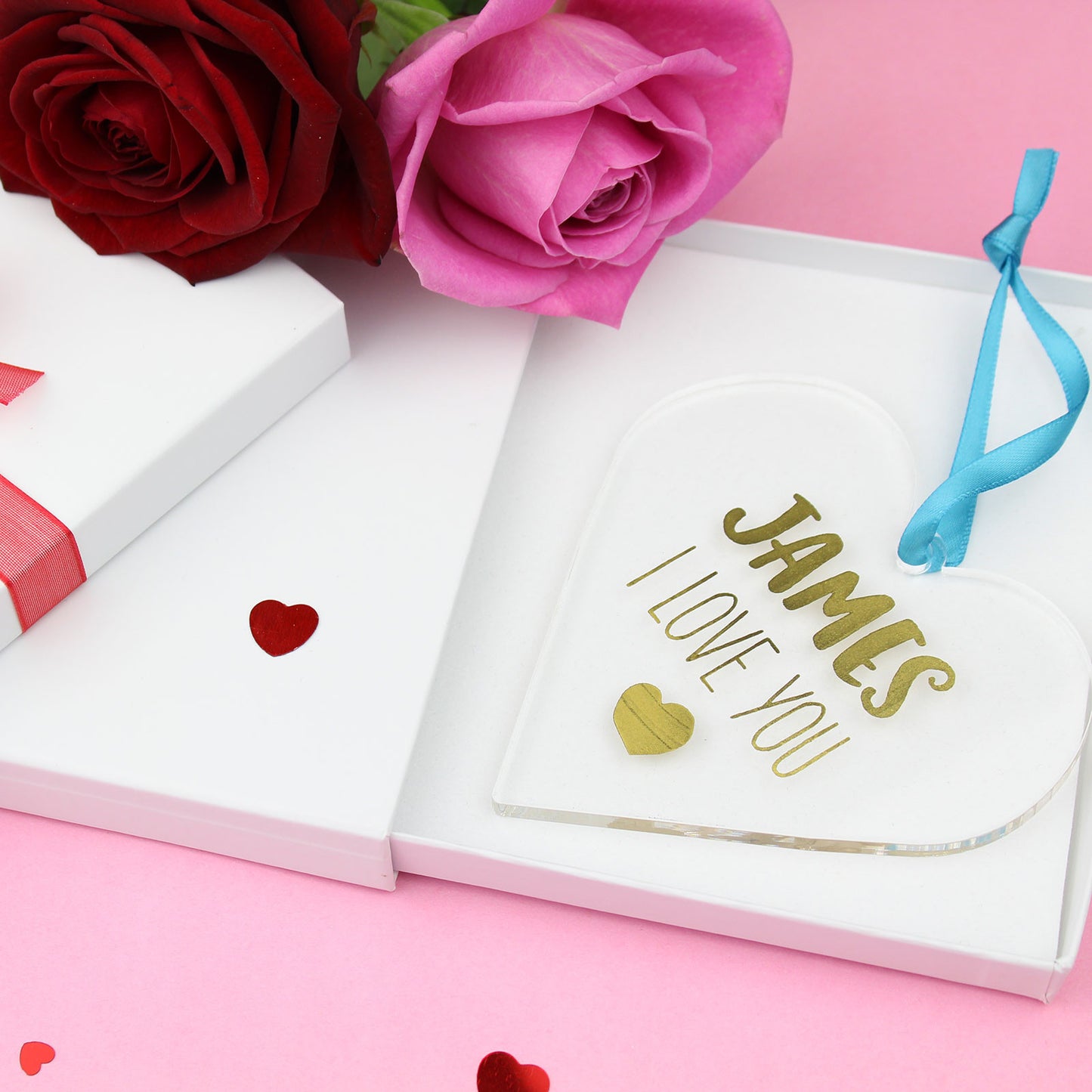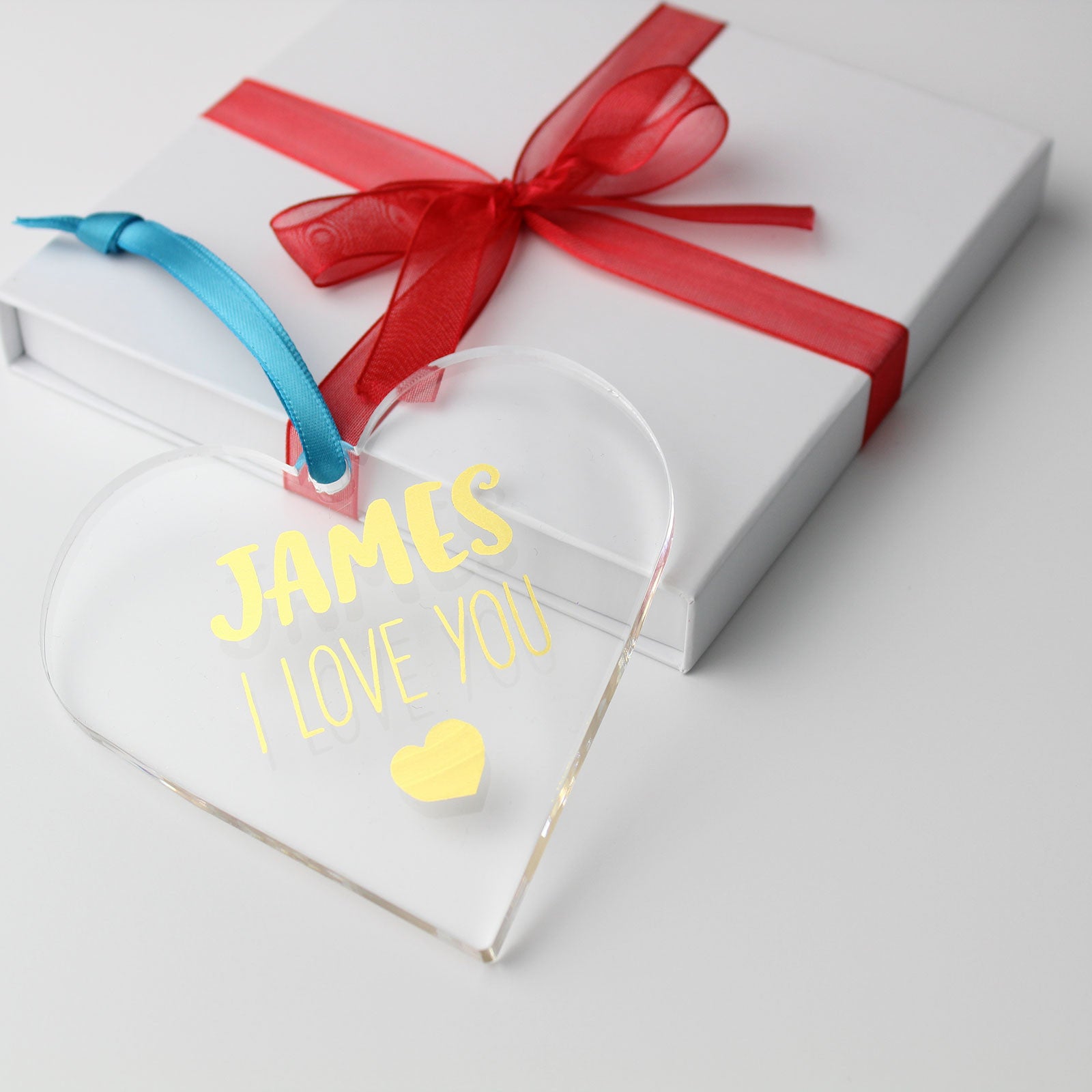 Personalised I Love You Foiled Heart comes complete with a choice of silver or gold foiled name, with the words "I Love You" below, and finished with a gold heart emblem. This clear acrylic heart shaped decal comes with a satin hanging loop, available in a choice of colours.