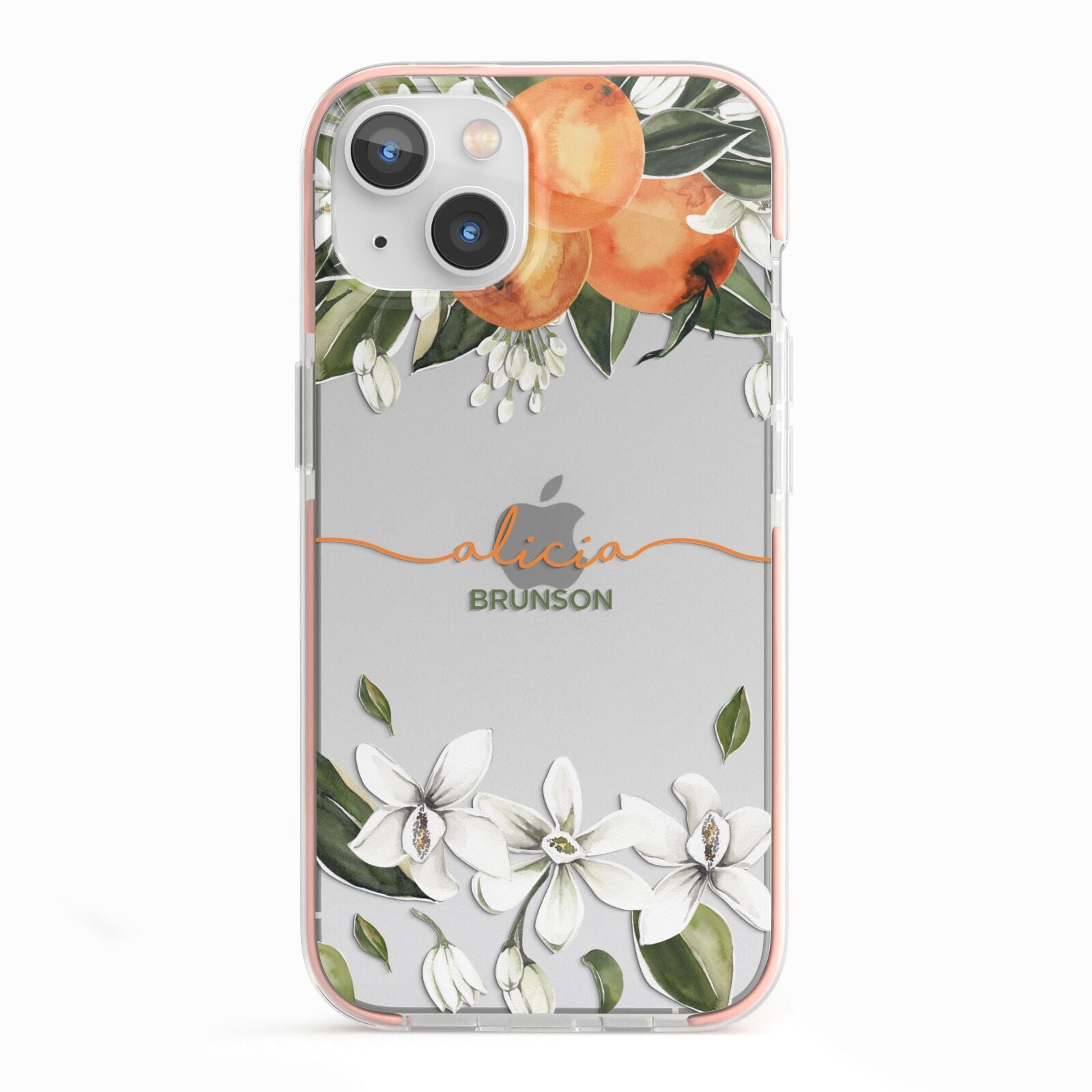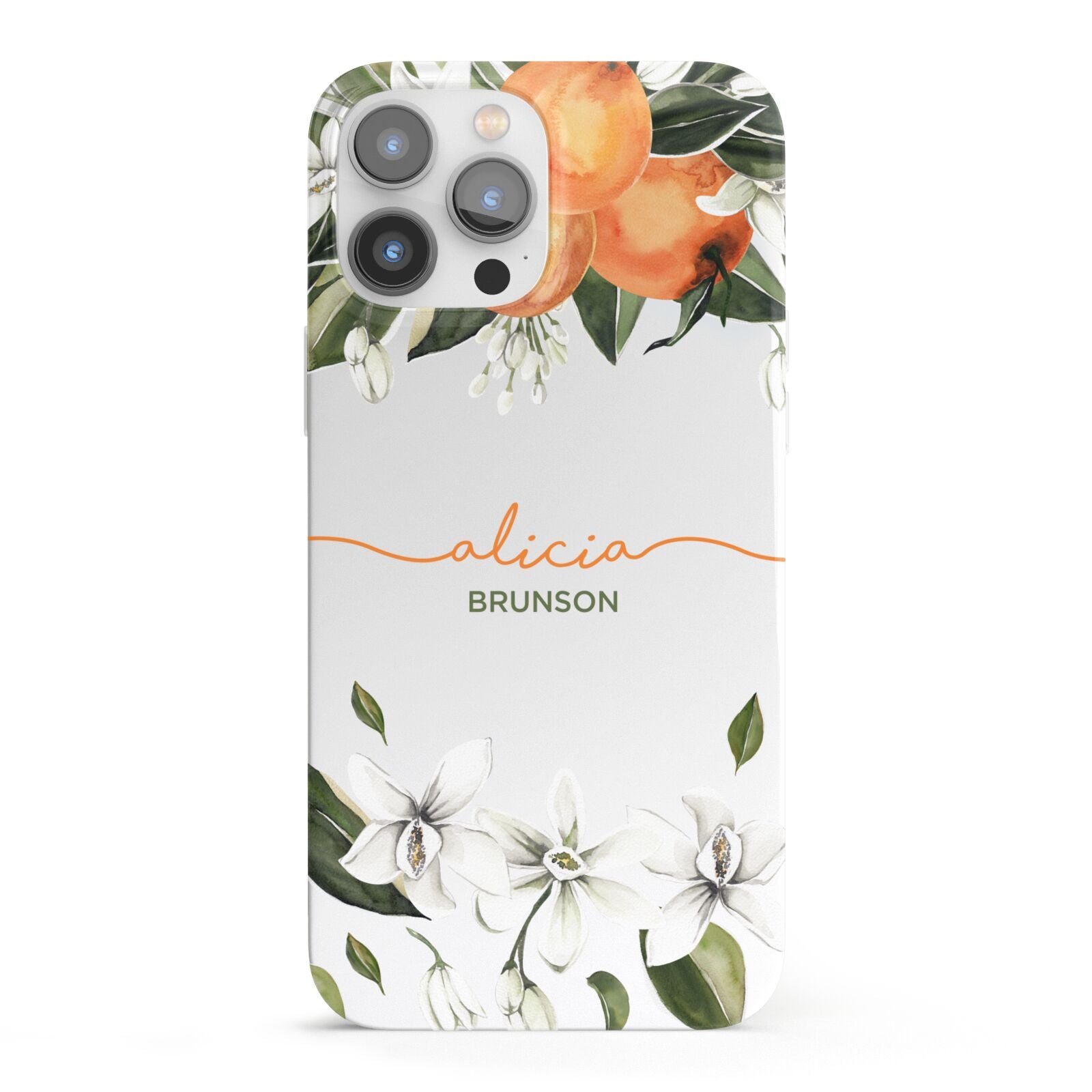 Our Personalised Orange Tree Wreath Apple iPhone Case is a floral wreath pattern, made up of orange flowers, leaves and oranges. All originally hand painted in watercolour. Personalise this with a handwritten name in matching orange colour, and your surname.