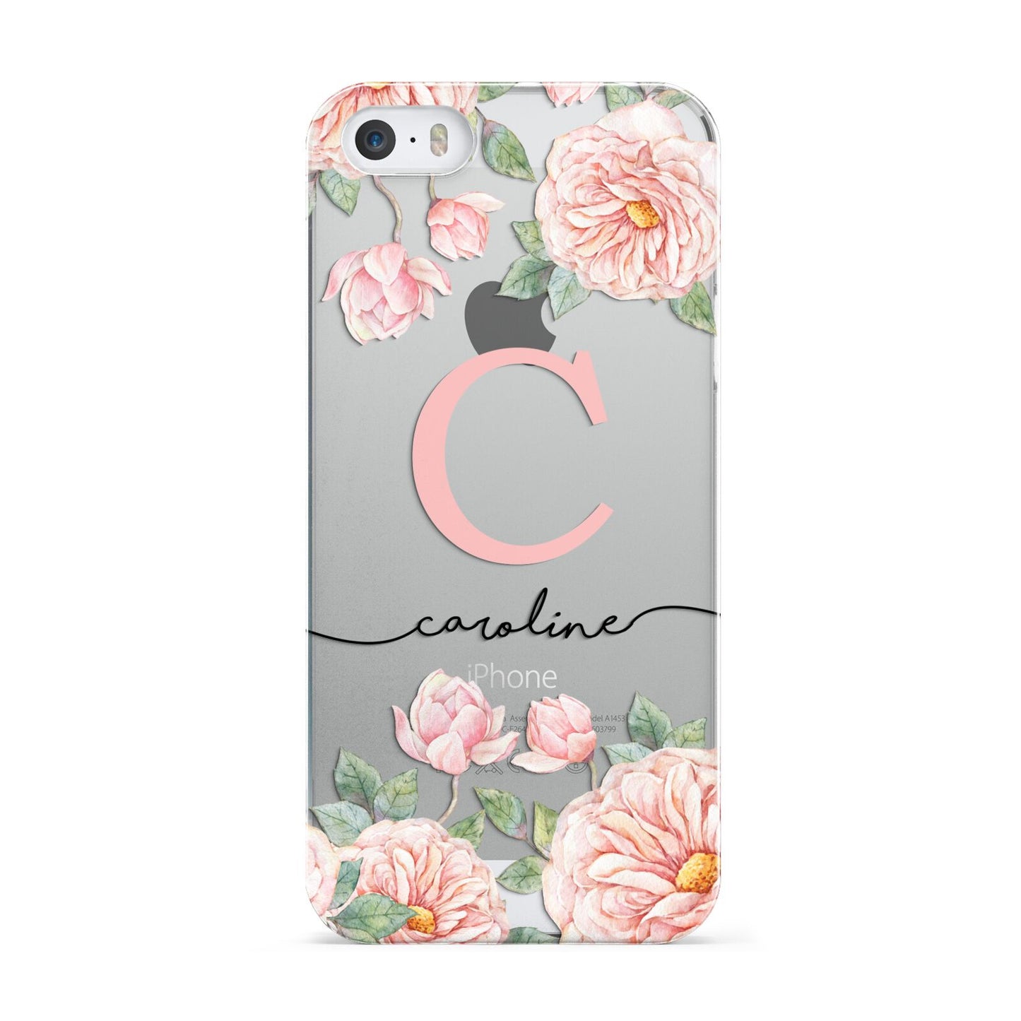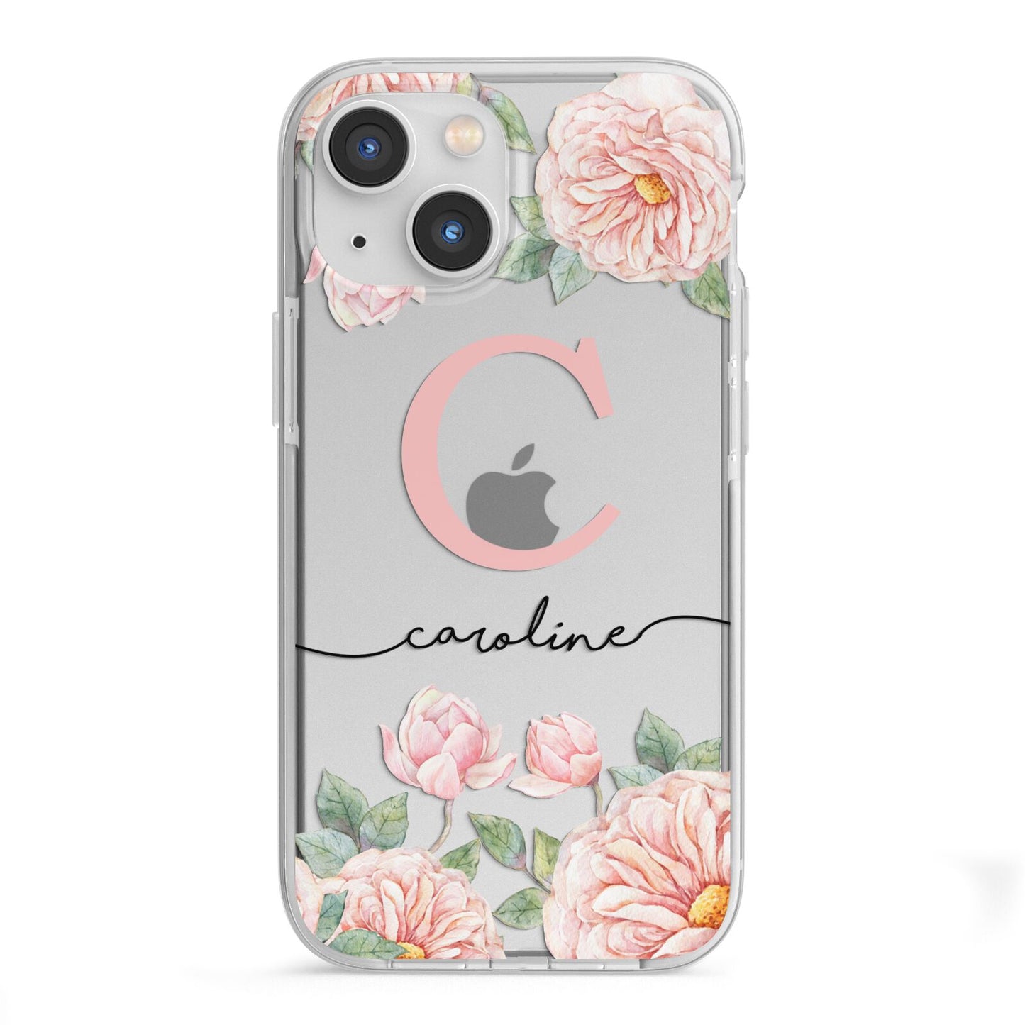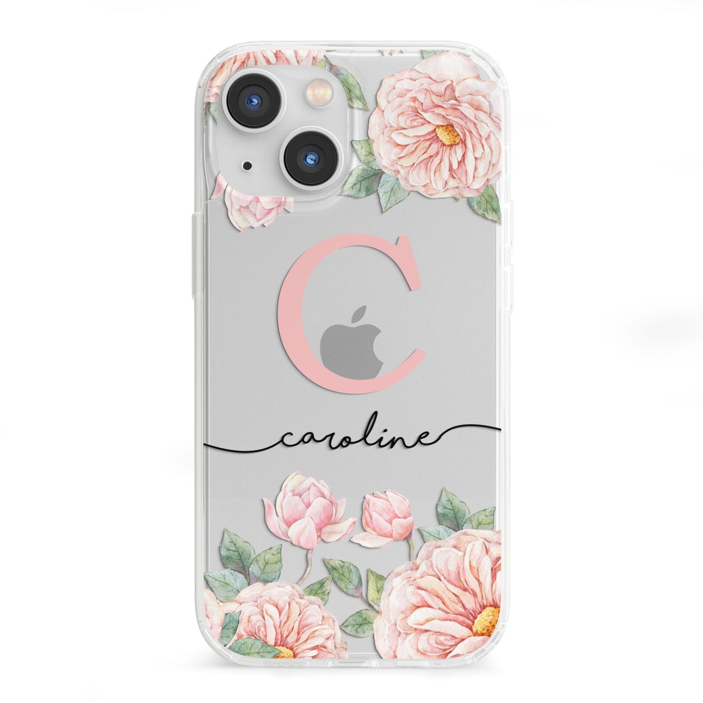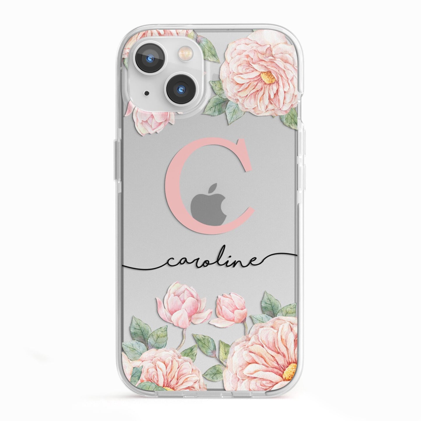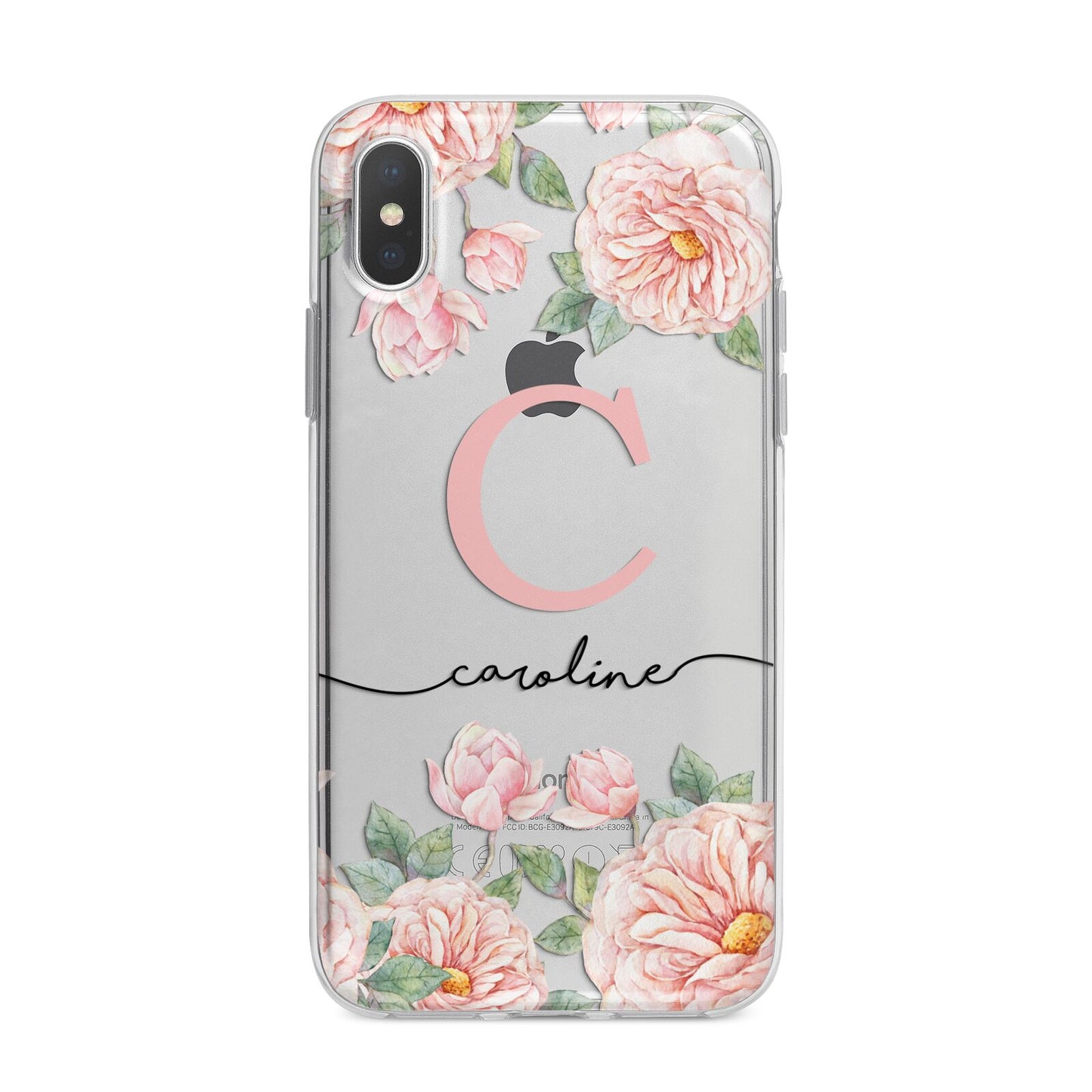 This Personalised Pink Flowers Apple iPhone Case is a hand-illustrated watercolour design on a clear transparent background. The design looks great when on our transparent products, where parts of the pattern will become see through. The design contains blush pink peony flowers, and green leaves, with a large dusky pink initial monogram, sat above a black handwritten name. Customise this with your own name and initial for a truly custom flower design.