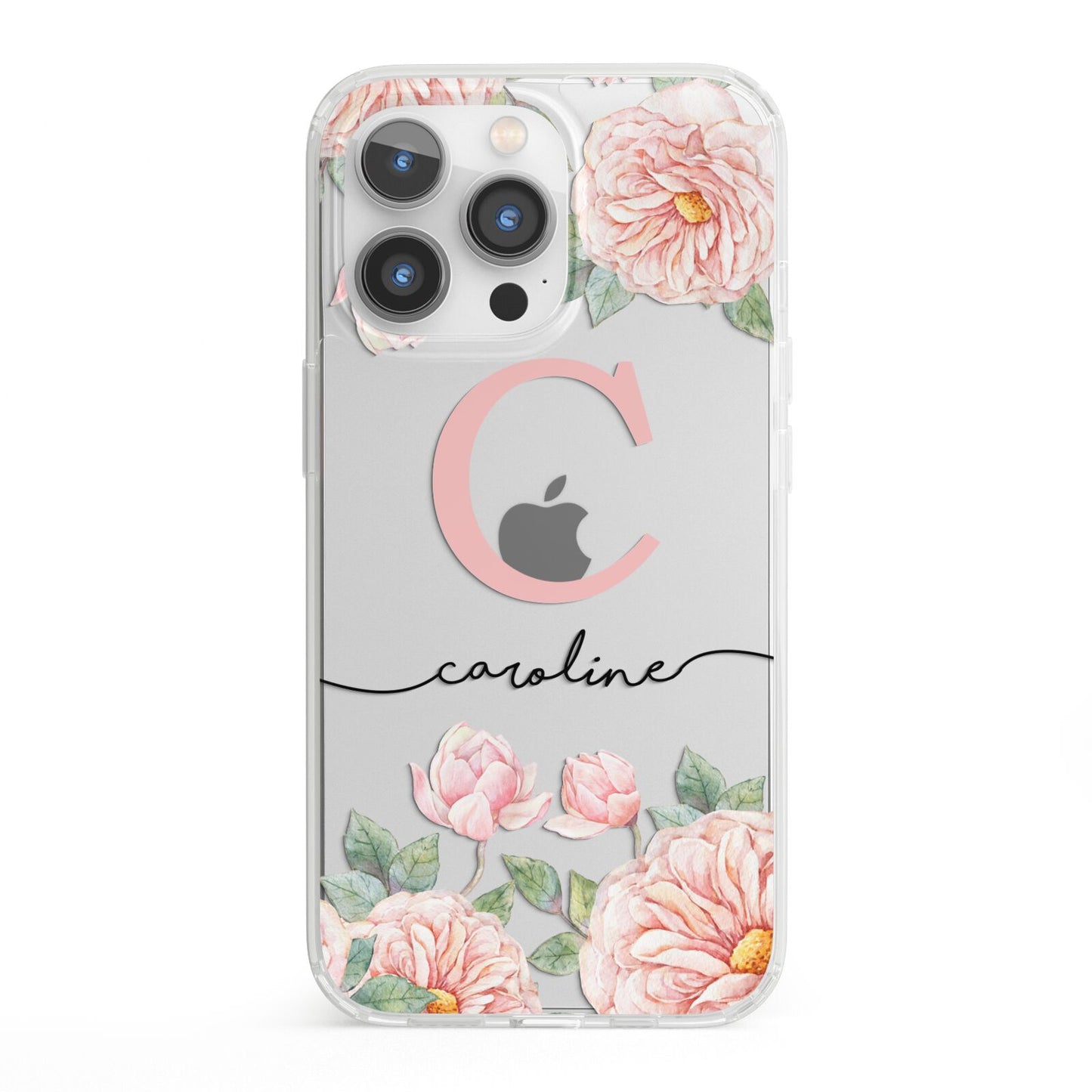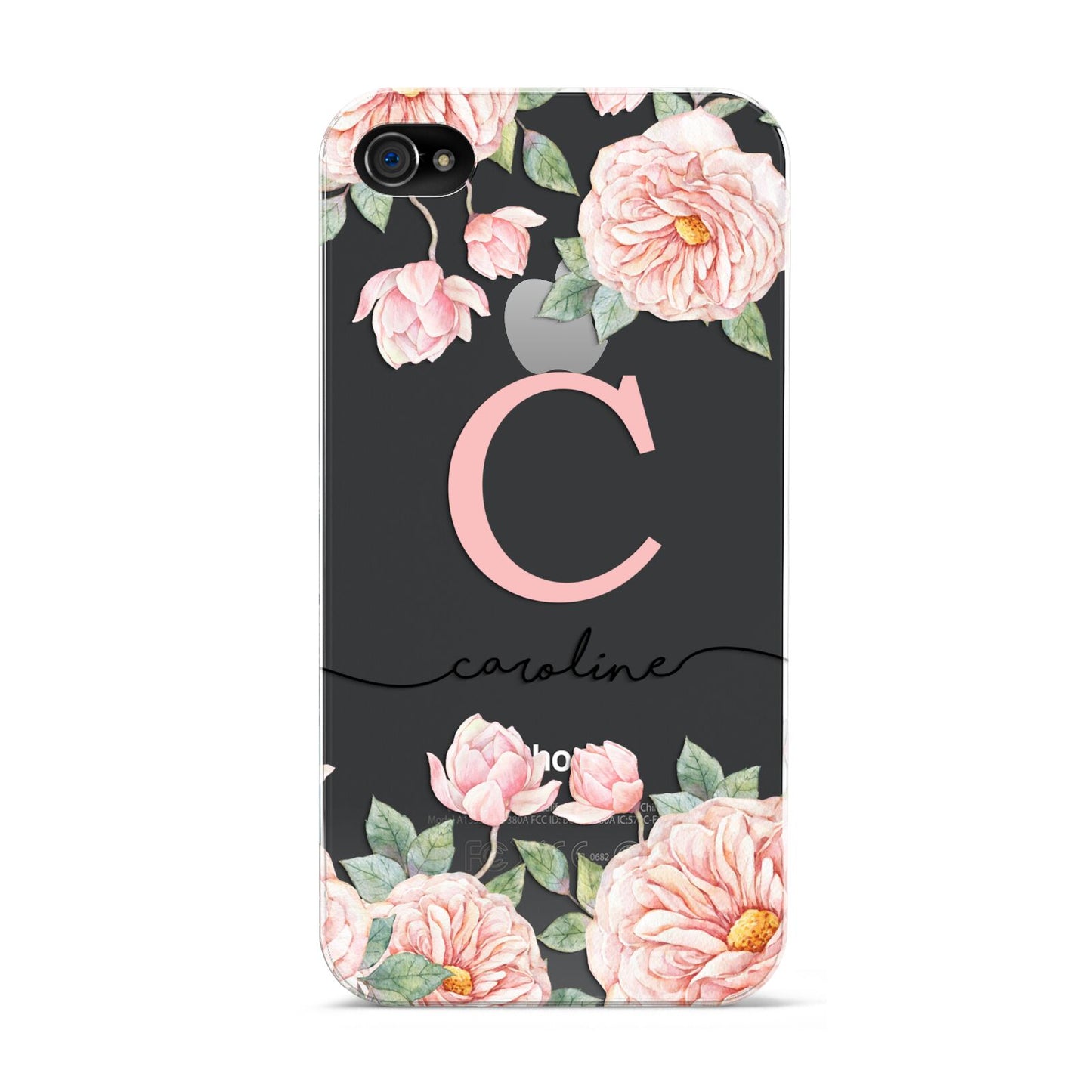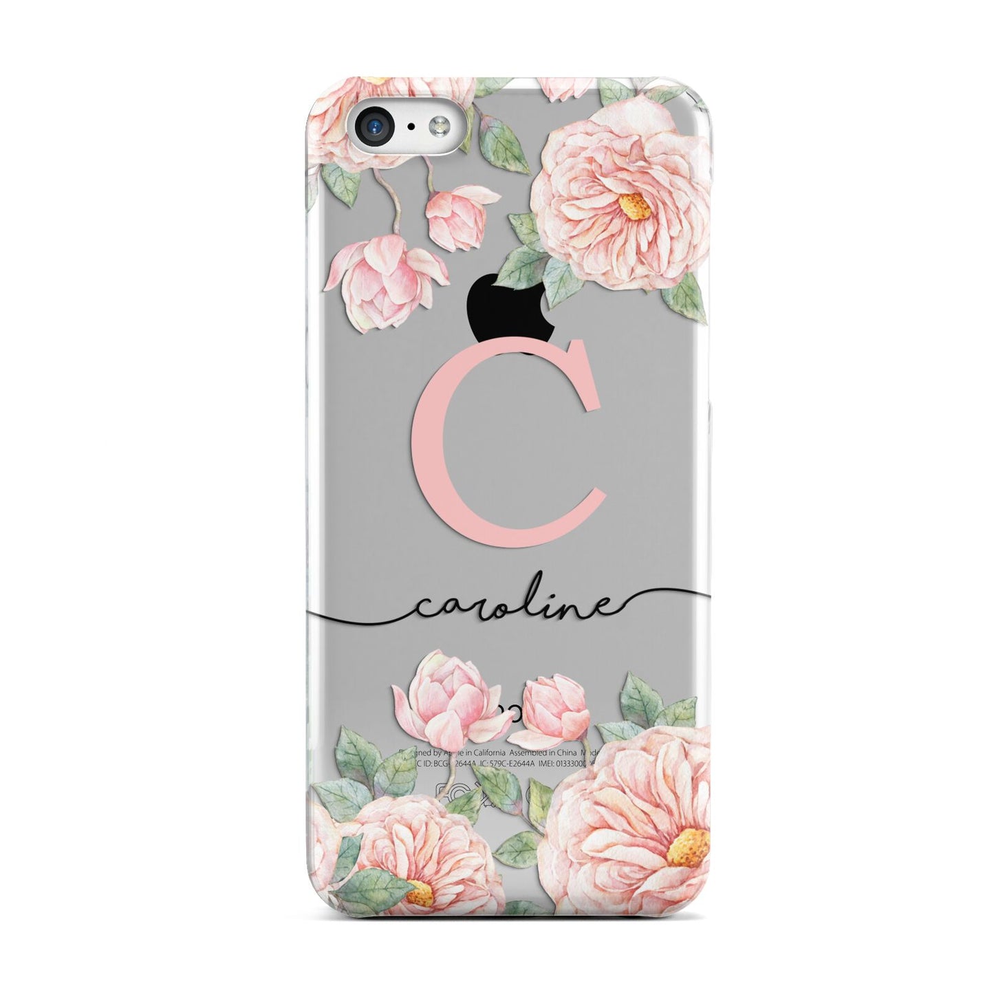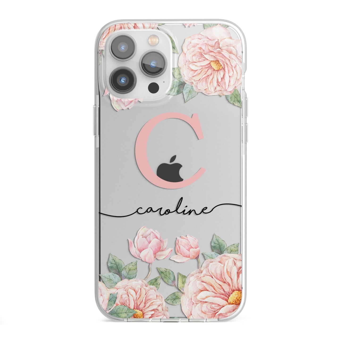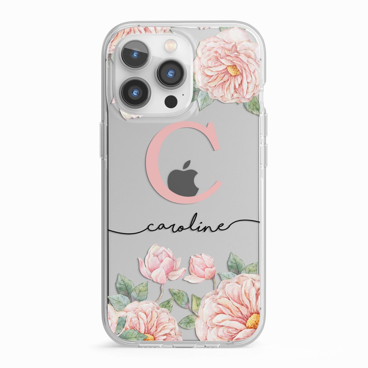 This Personalised Pink Flowers Apple iPhone Case is a hand-illustrated watercolour design on a clear transparent background. The design looks great when on our transparent products, where parts of the pattern will become see through. The design contains blush pink peony flowers, and green leaves, with a large dusky pink initial monogram, sat above a black handwritten name. Customise this with your own name and initial for a truly custom flower design.