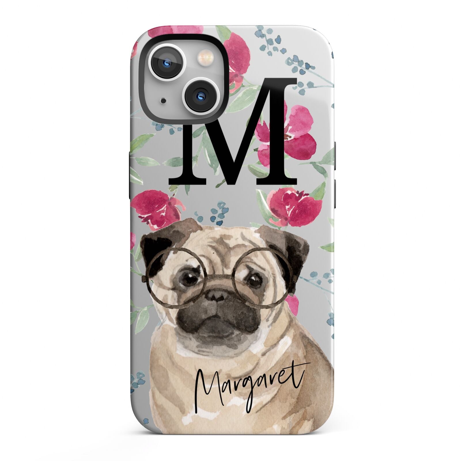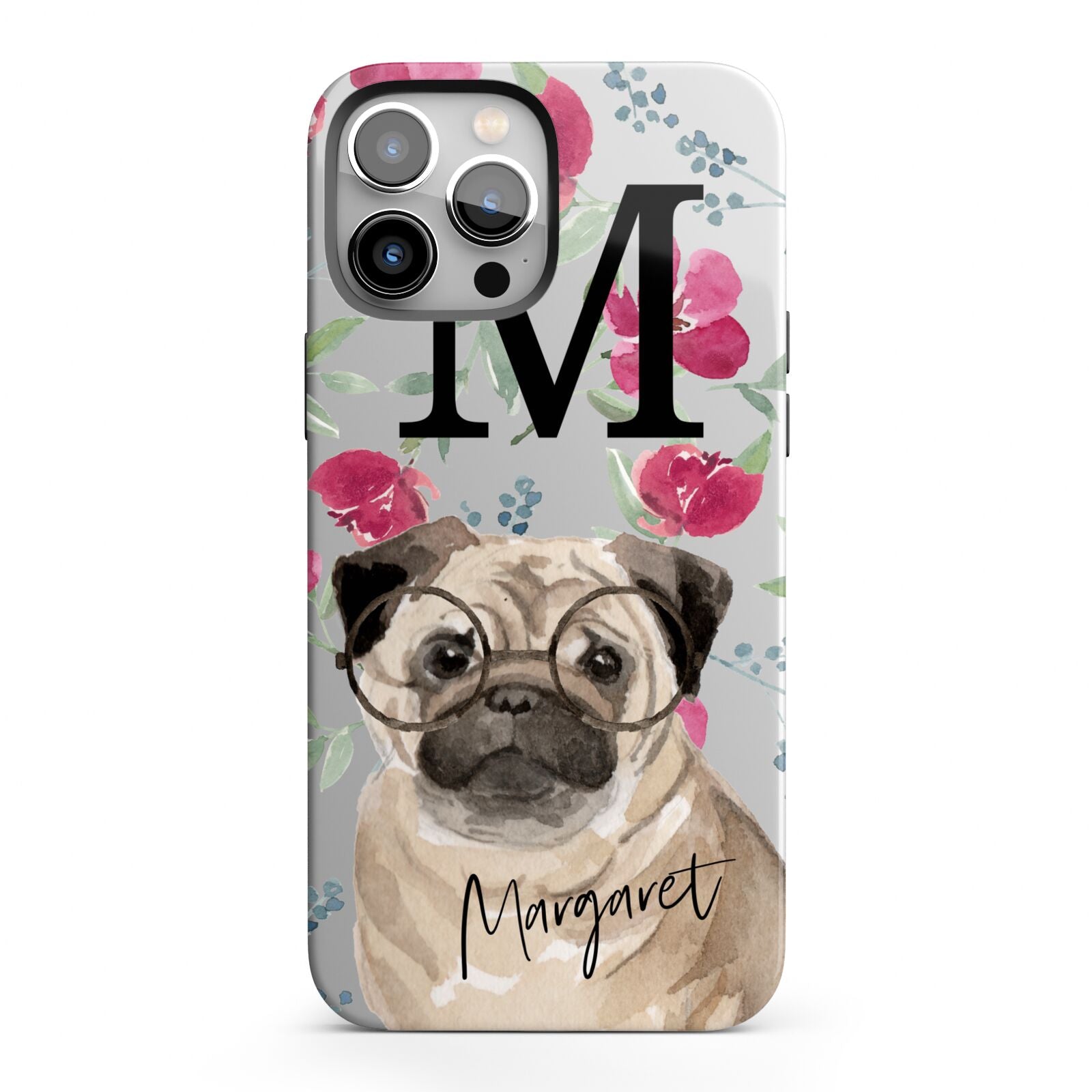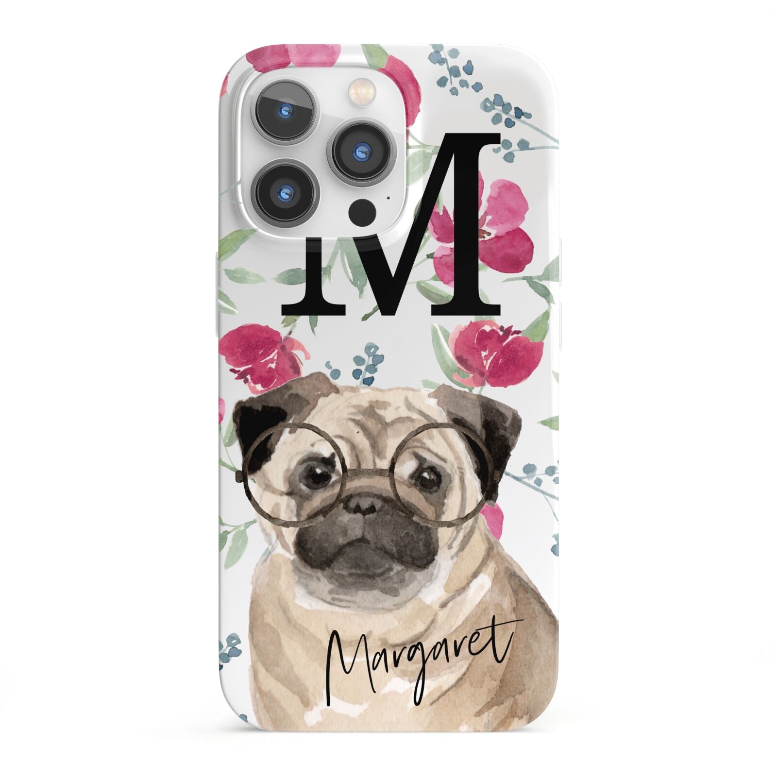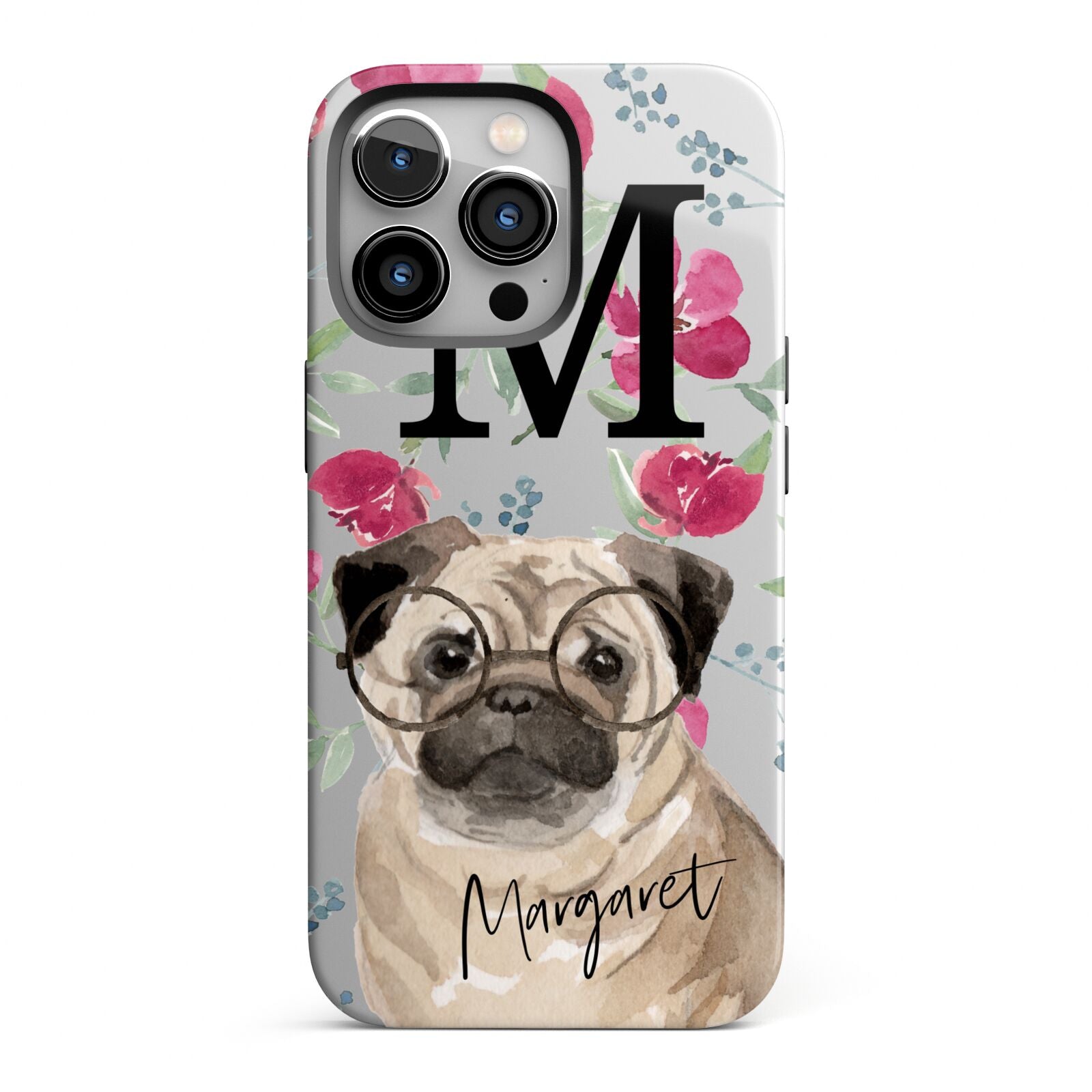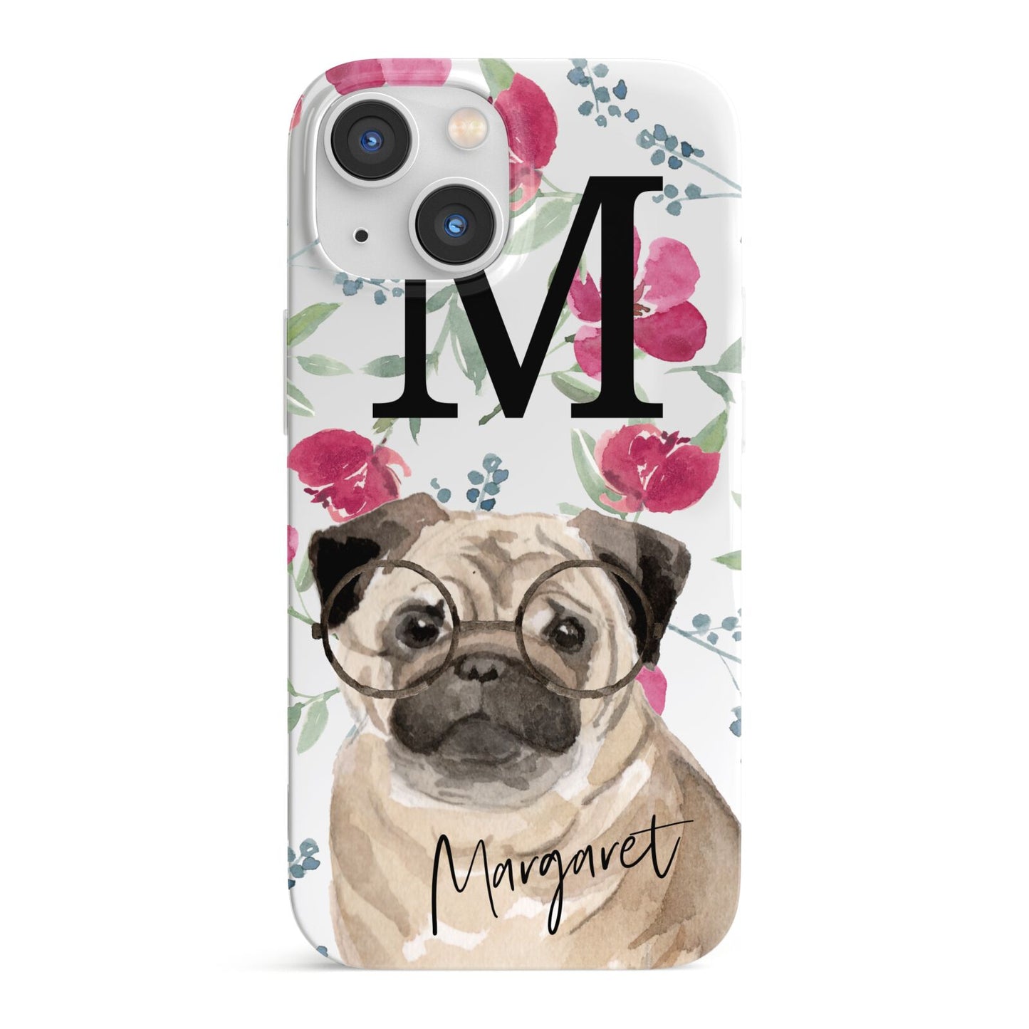 This cute Personalised Pug Dog Apple iPhone Case is a watercolour illustration of an adorable pet pug dog, wearing fun glasses. The design also includes some pretty flowers, and can be personalised with a large monogram and your name in our handwritten font. This design is just perfect for any dog lover, or of course a pug owner.