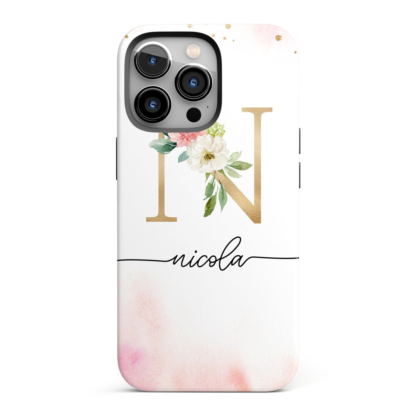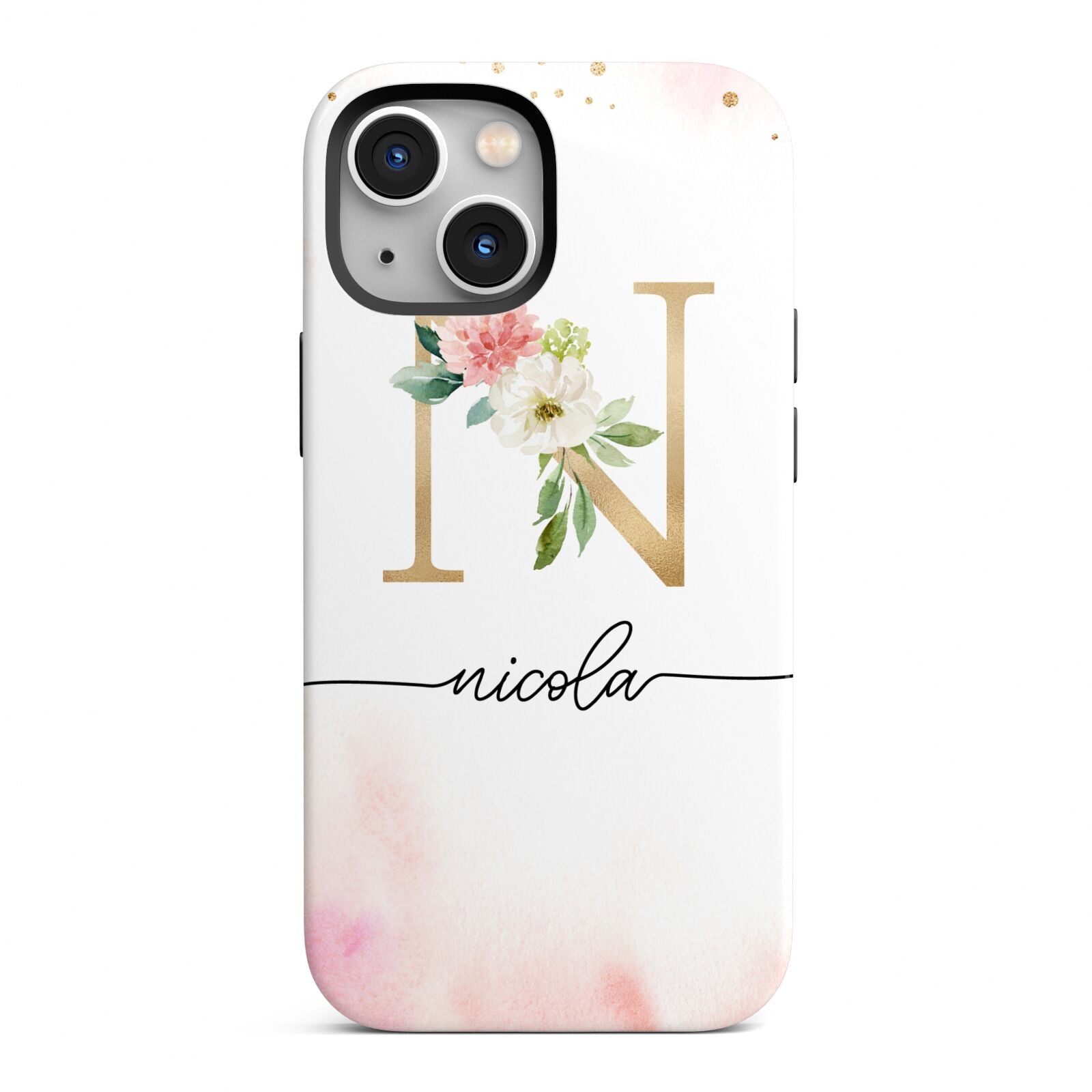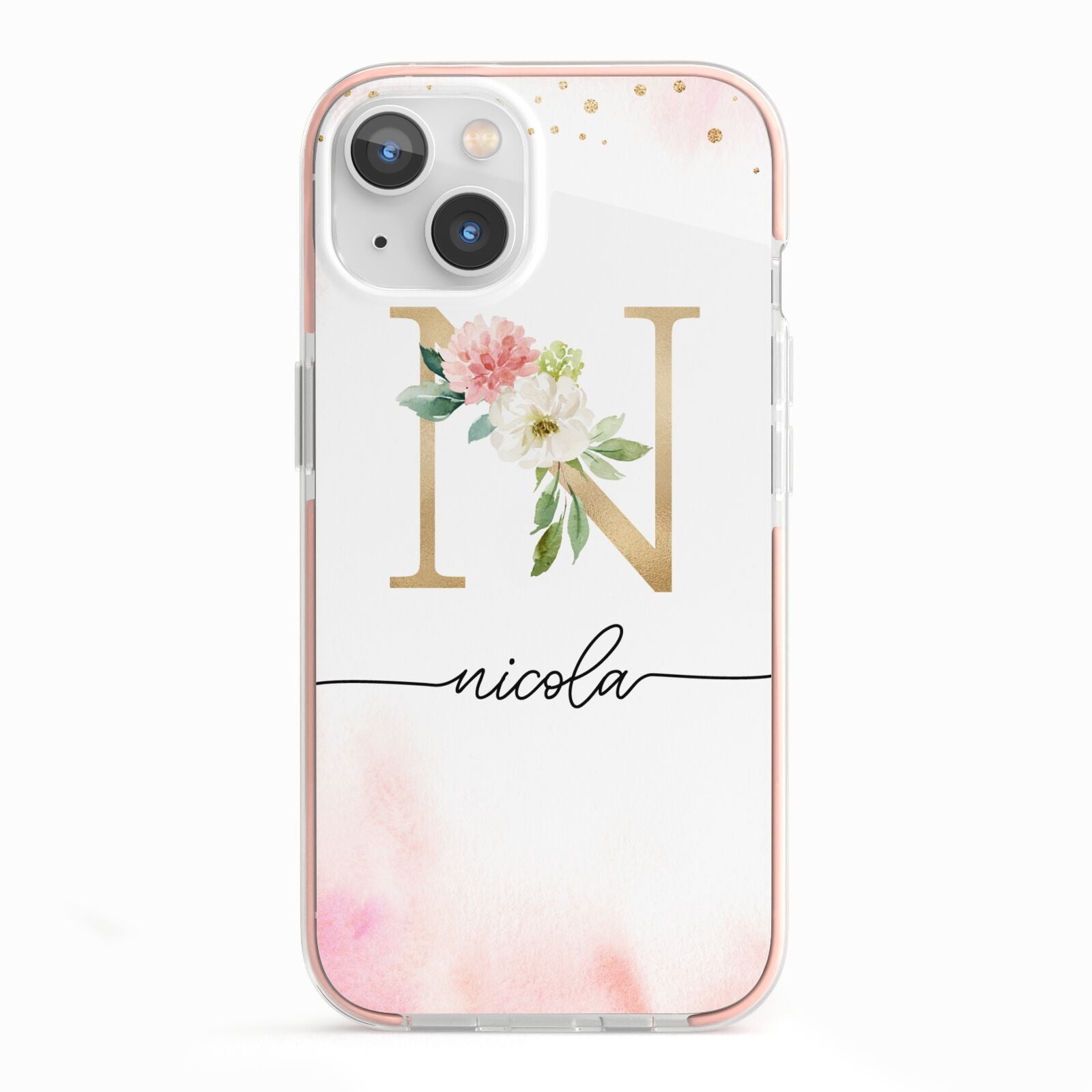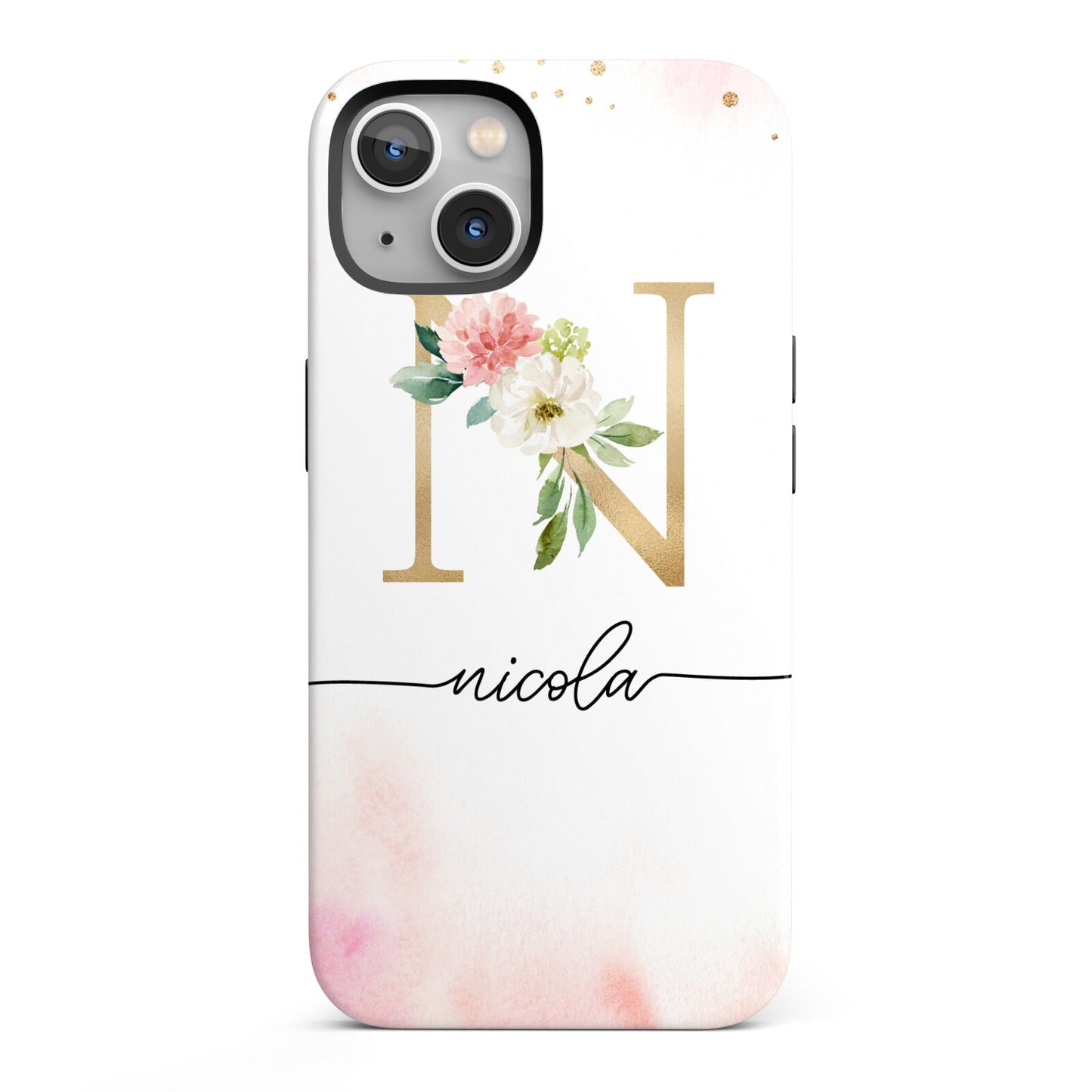 This delightful watercolour monogram phone features pink and gold detailed illustration with a gold initial and black name. Personalise this phone case with your name and initials for a truly customised phone.