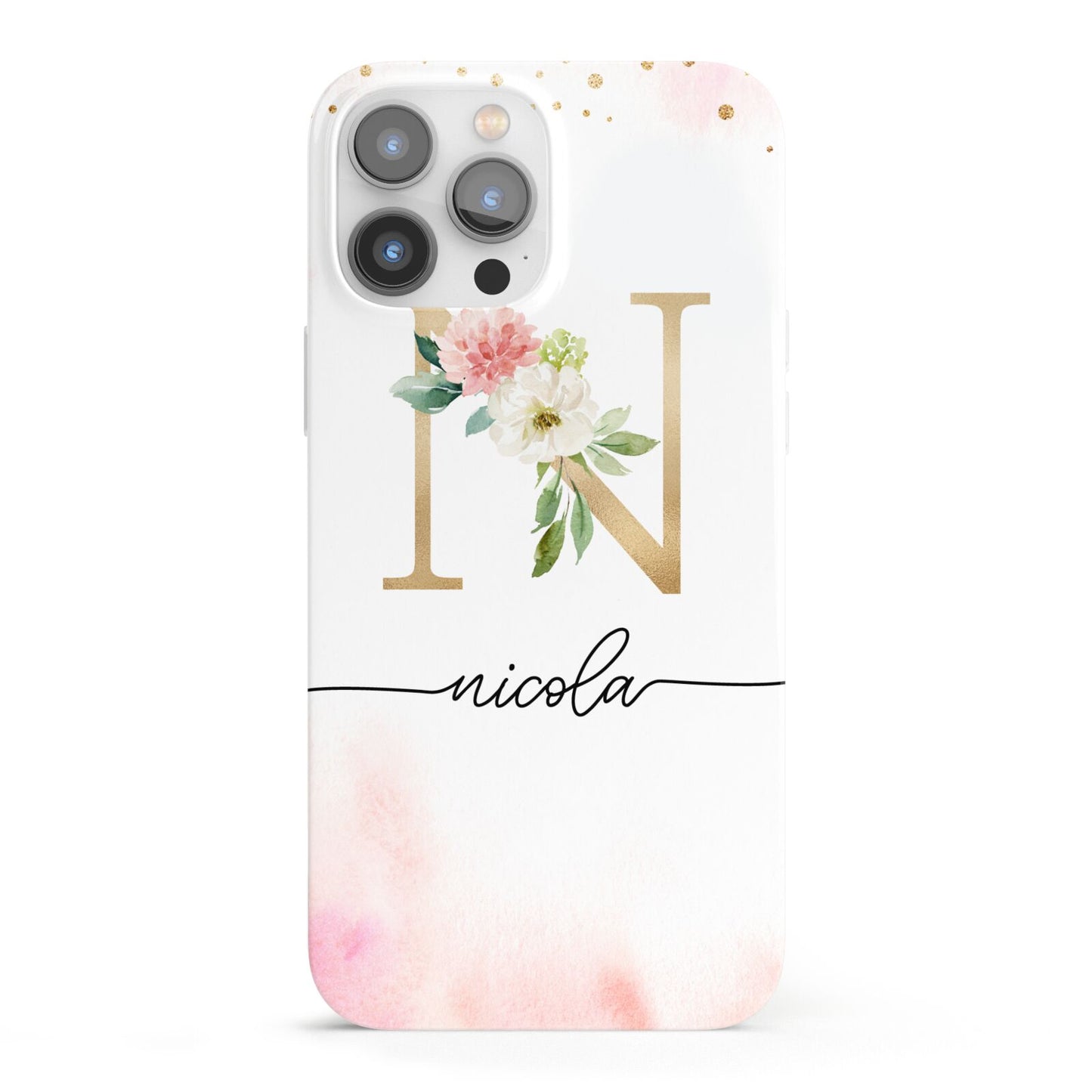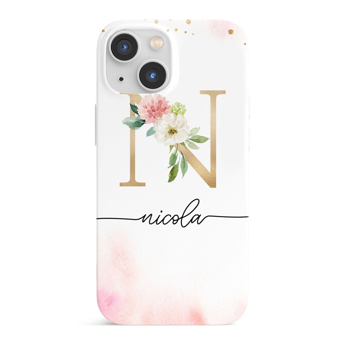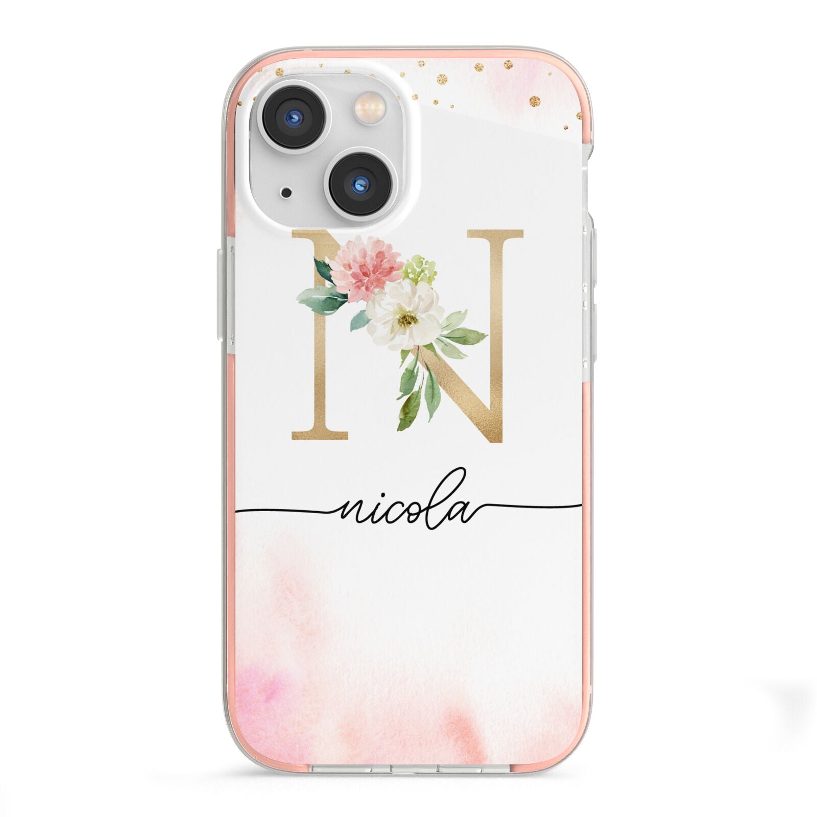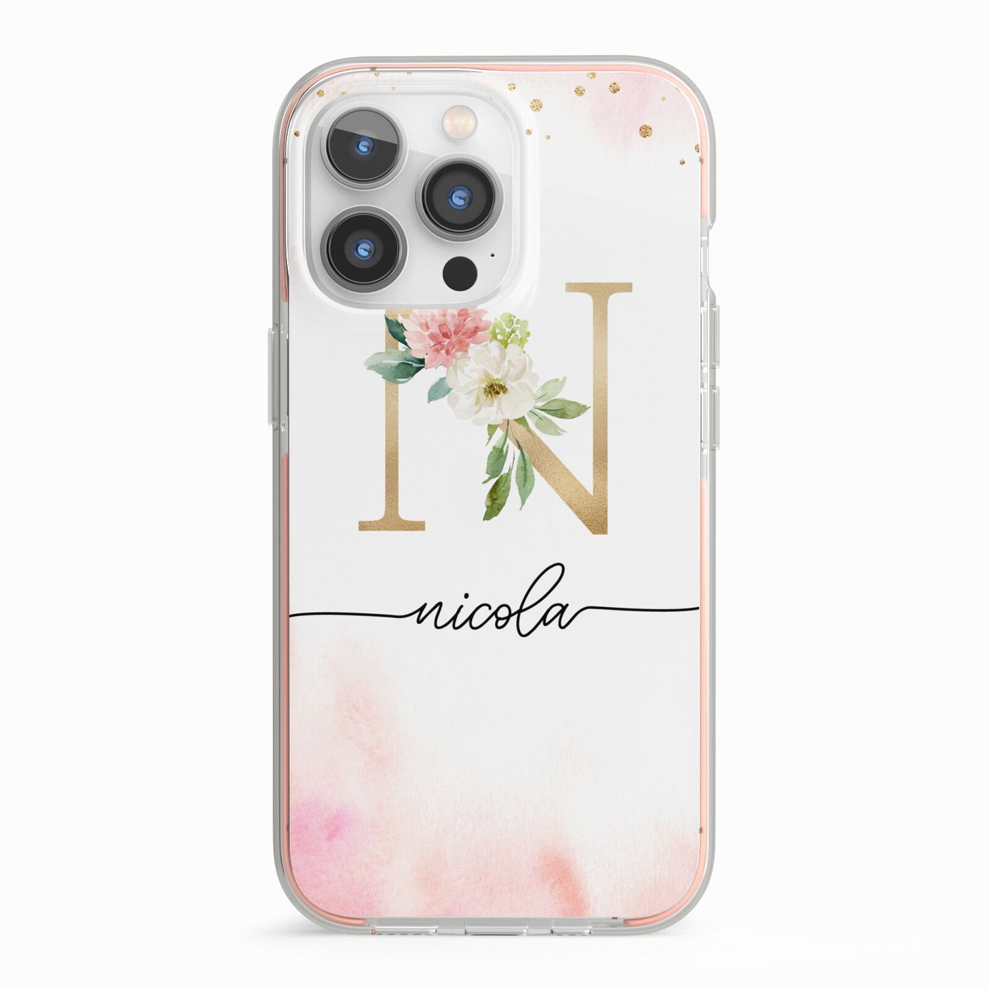 This delightful watercolour monogram phone features pink and gold detailed illustration with a gold initial and black name. Personalise this phone case with your name and initials for a truly customised phone.