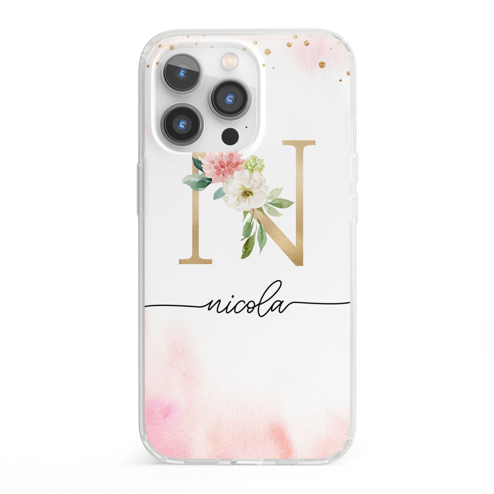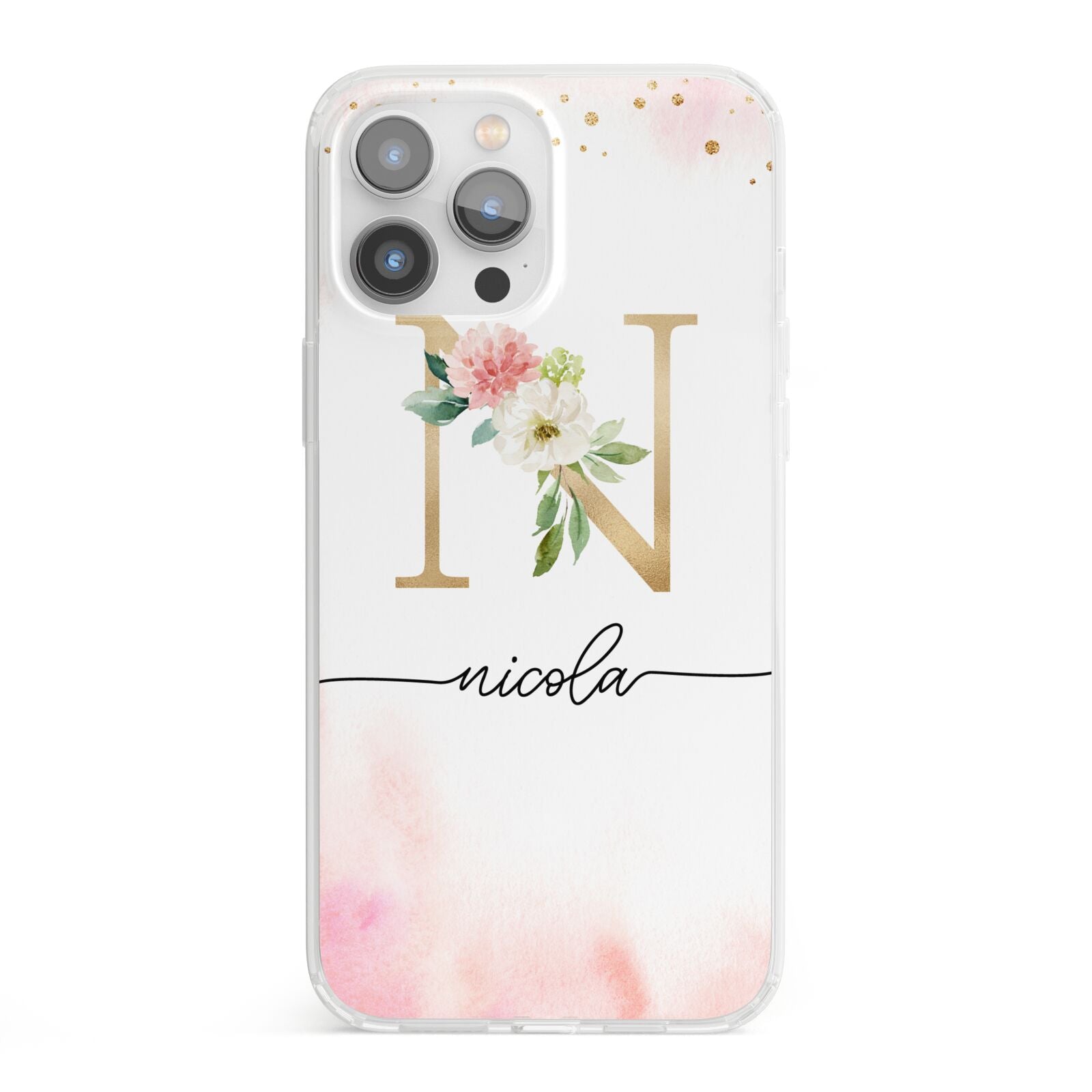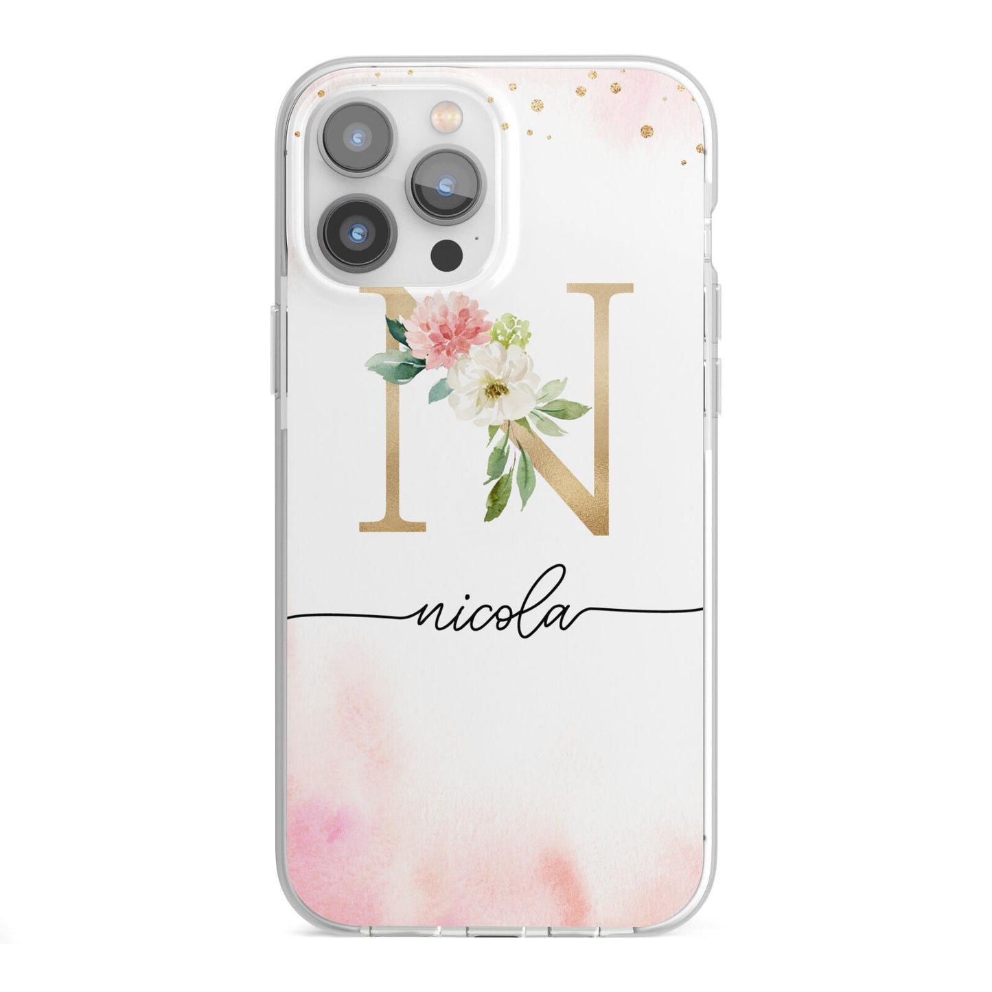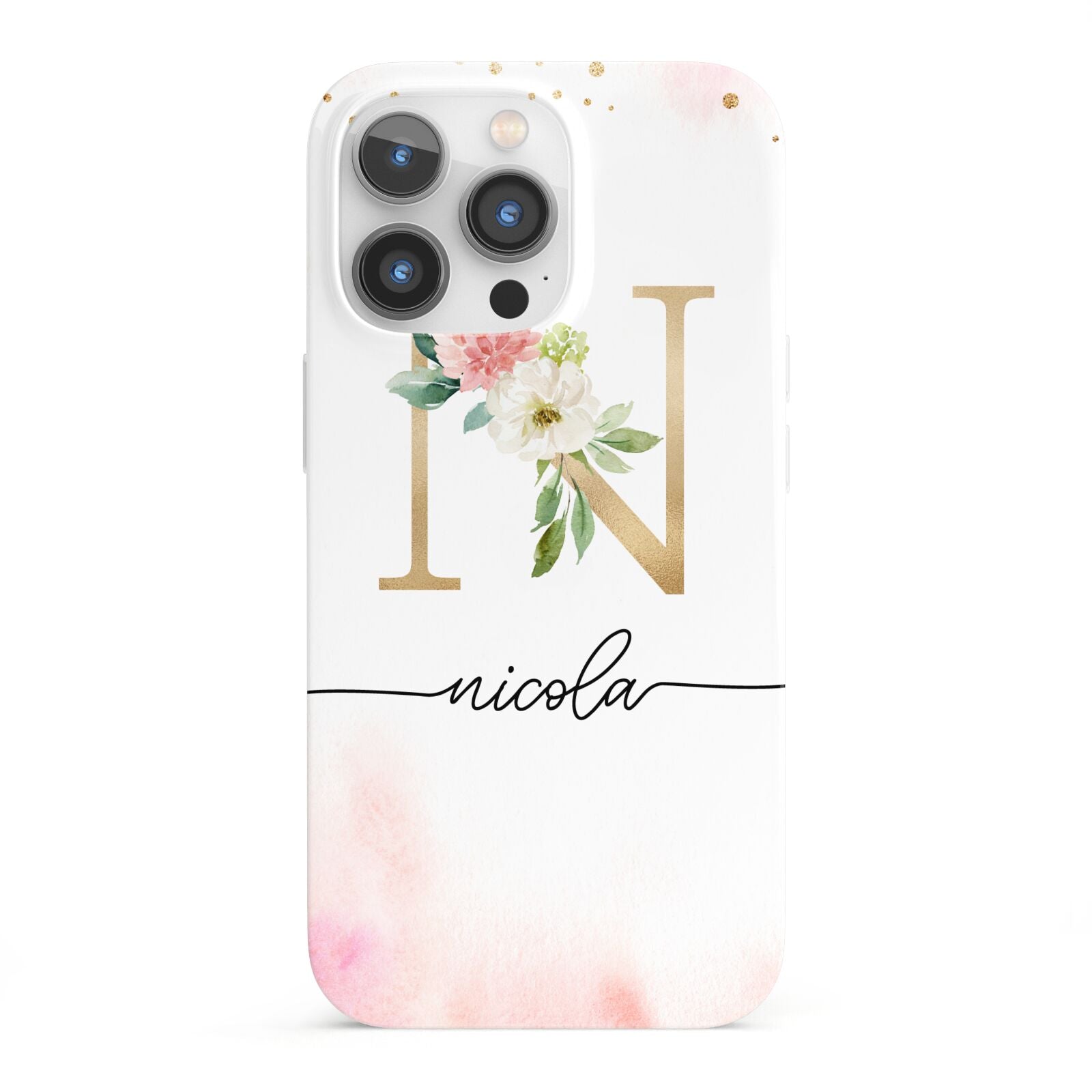 This delightful watercolour monogram phone features pink and gold detailed illustration with a gold initial and black name. Personalise this phone case with your name and initials for a truly customised phone.