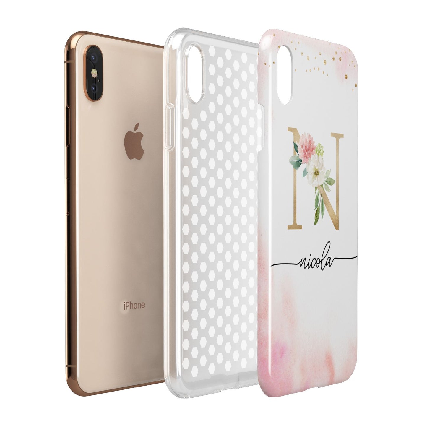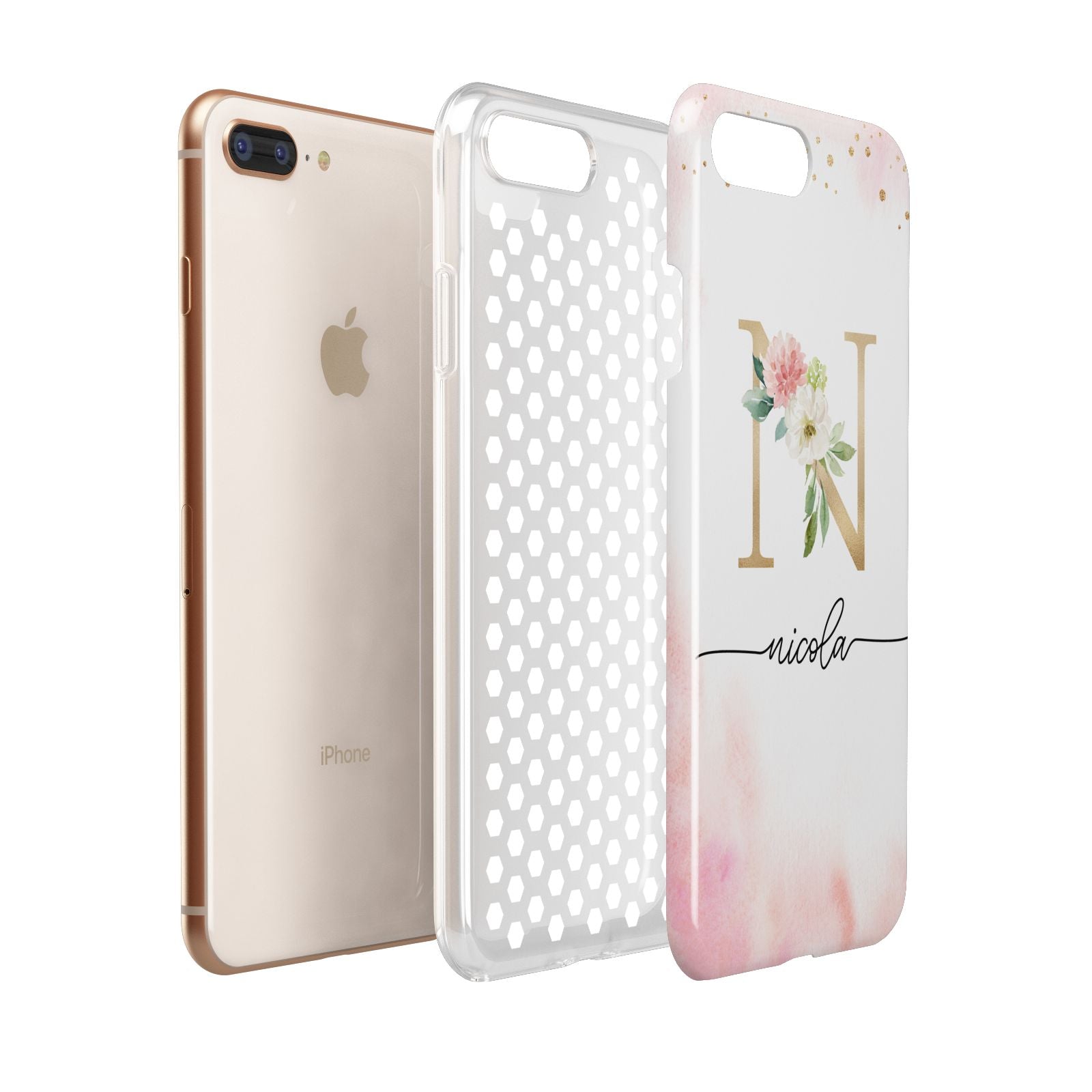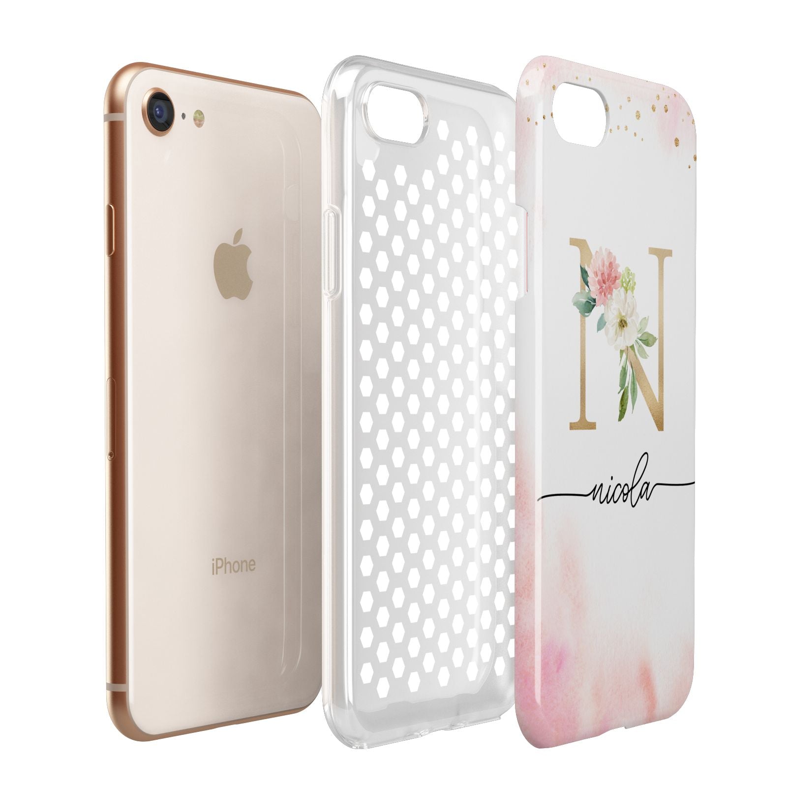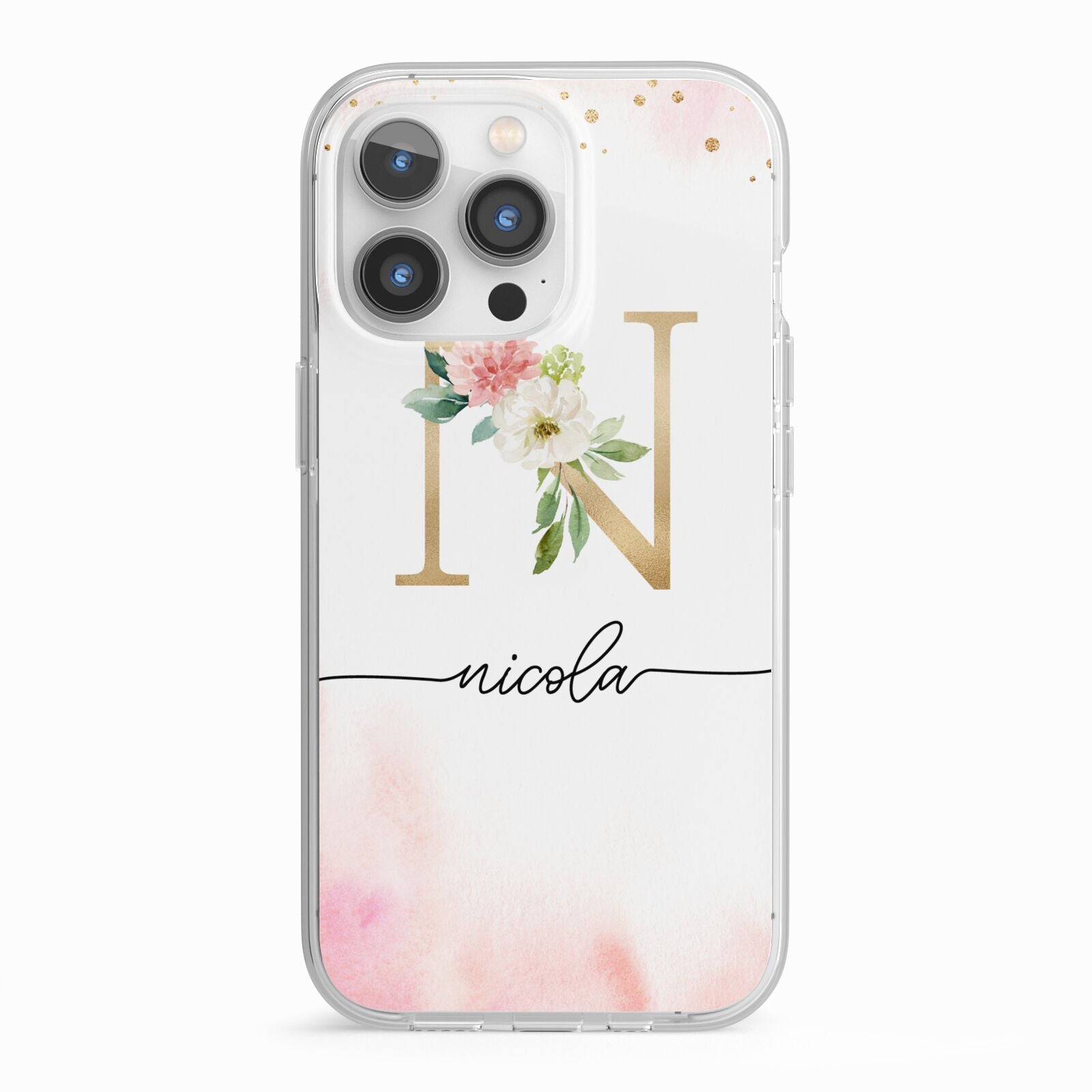 This delightful watercolour monogram phone features pink and gold detailed illustration with a gold initial and black name. Personalise this phone case with your name and initials for a truly customised phone.