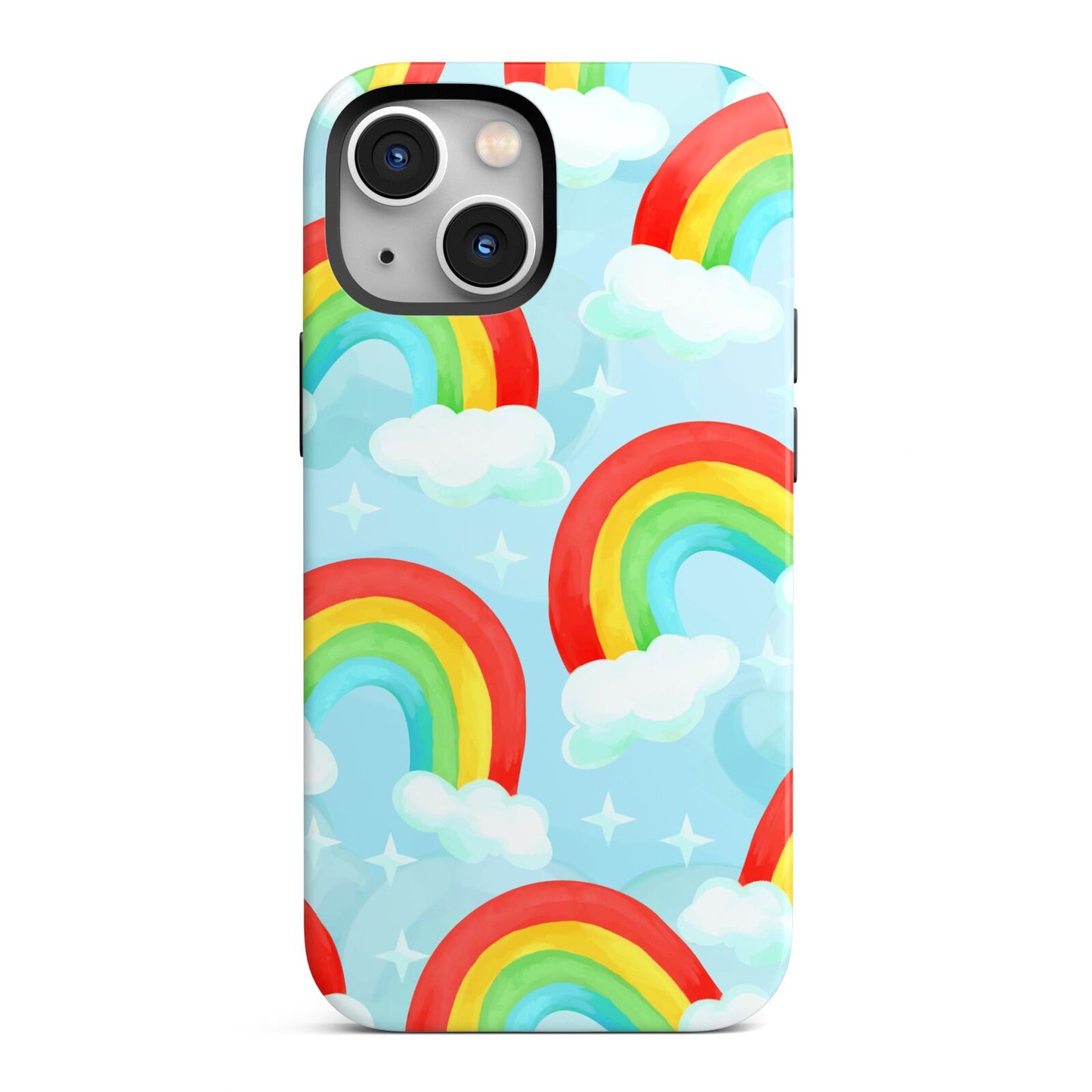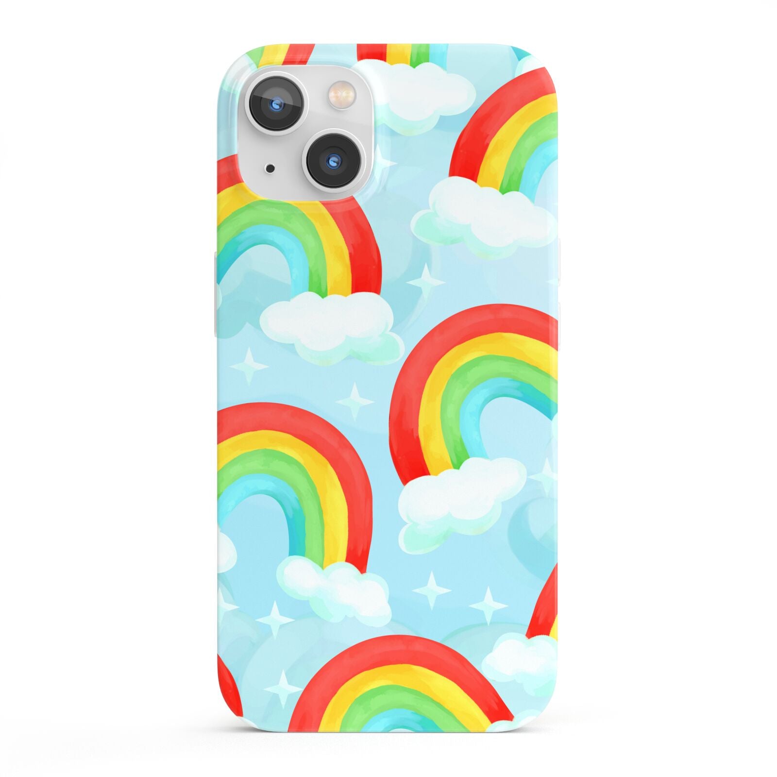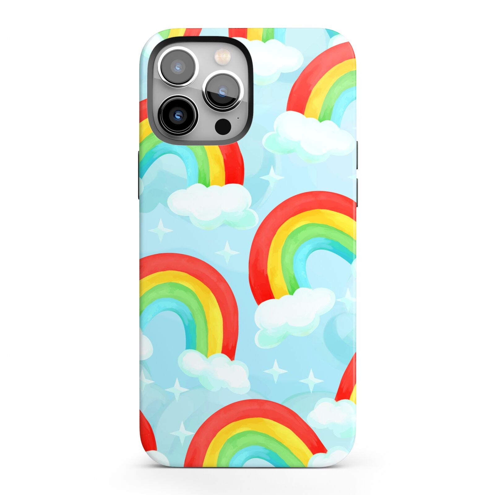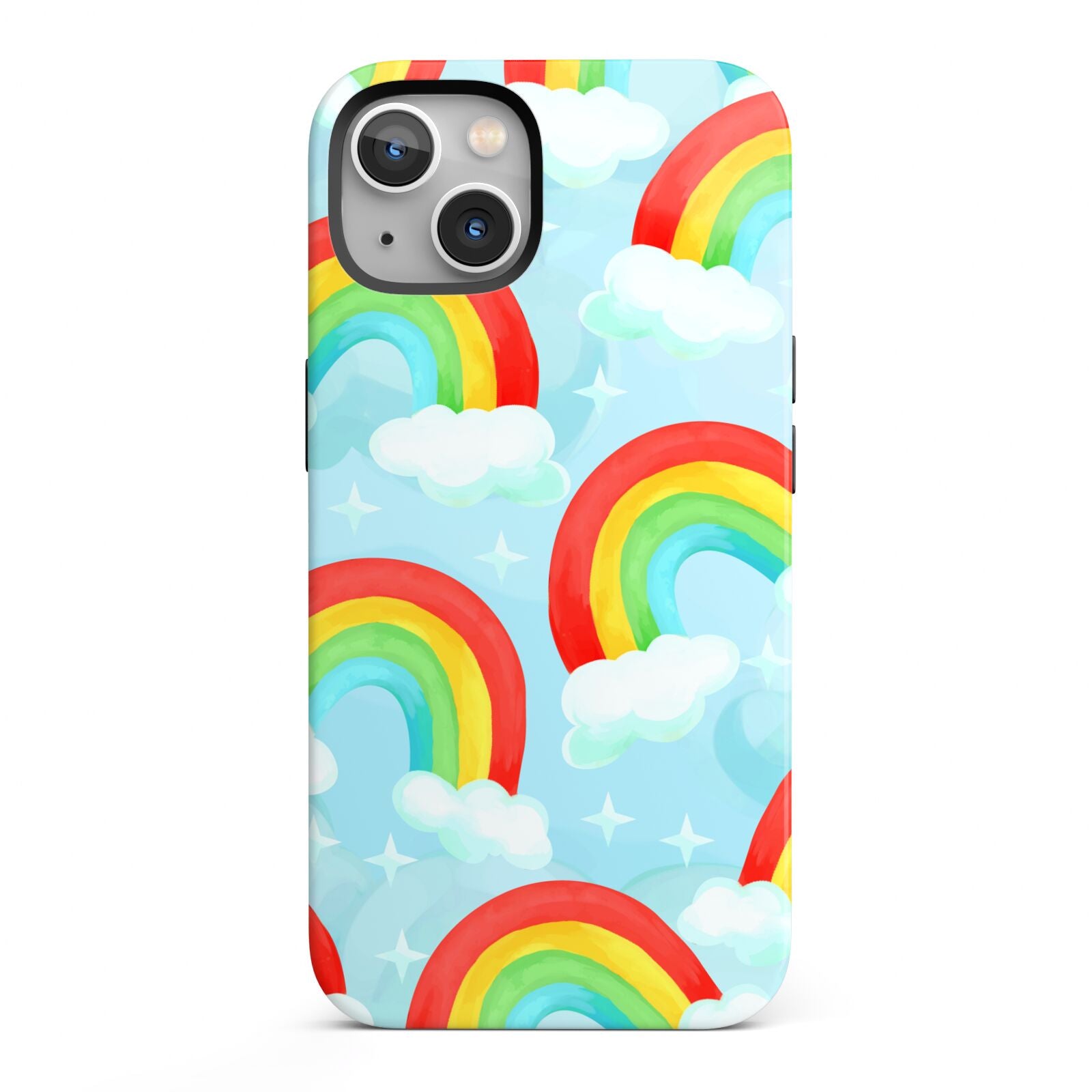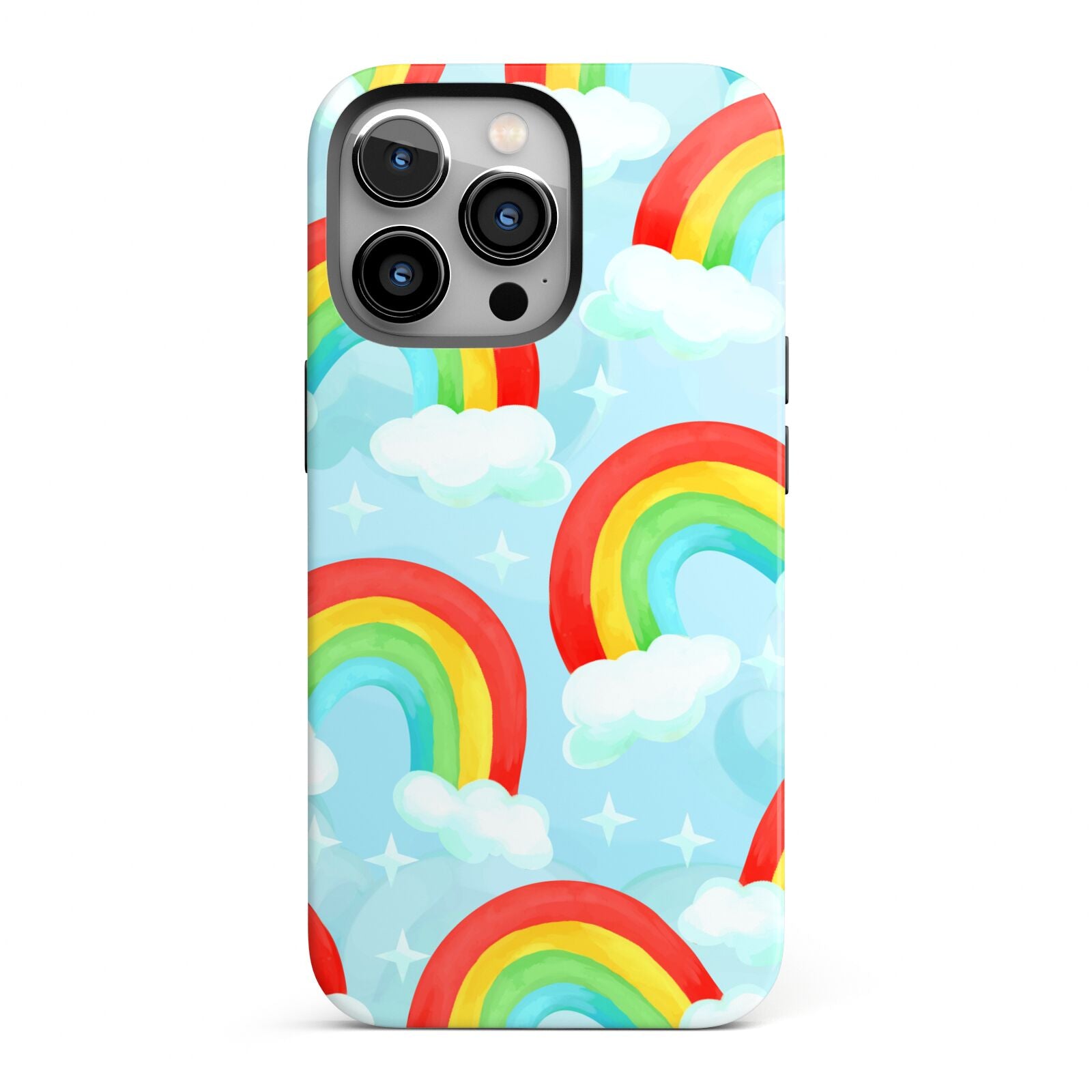 Our beautiful hand-drawn Rainbow Sky Apple iPhone Case is a fabulously colourful design, featuring rainbows and clouds with diamond stars. Fun and playful, this is a great way to add a dose of happiness and vibrancy to our phone case products. This design is available across a number of our products to allow you to complete a set.